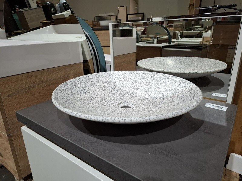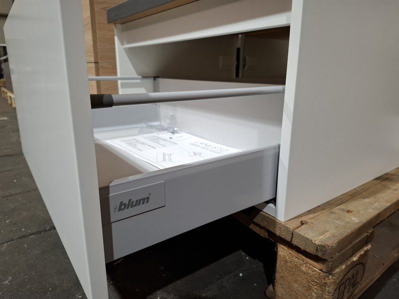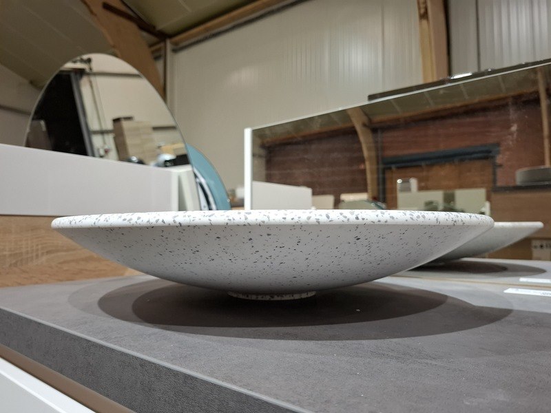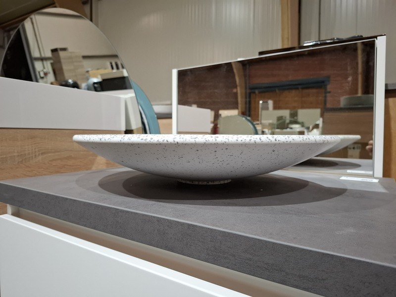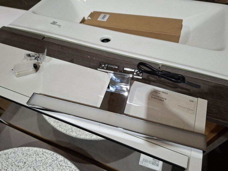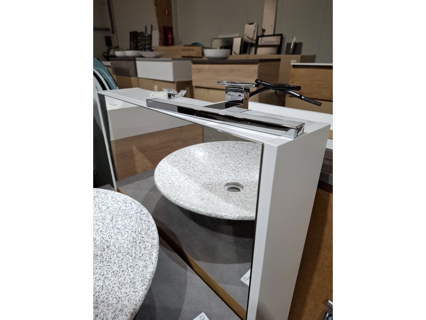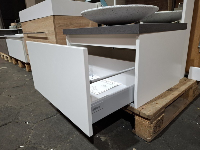 Product: Badmeubel Kleur: mat wit Afmeting: 65x50cm Specificaties: 1 lade met softclose, met Blum geleidesysteem, topblad antraciet, polybeton waskom, spiegelkast, 1 deurtje met softclose, spiegelverlichting