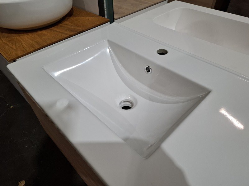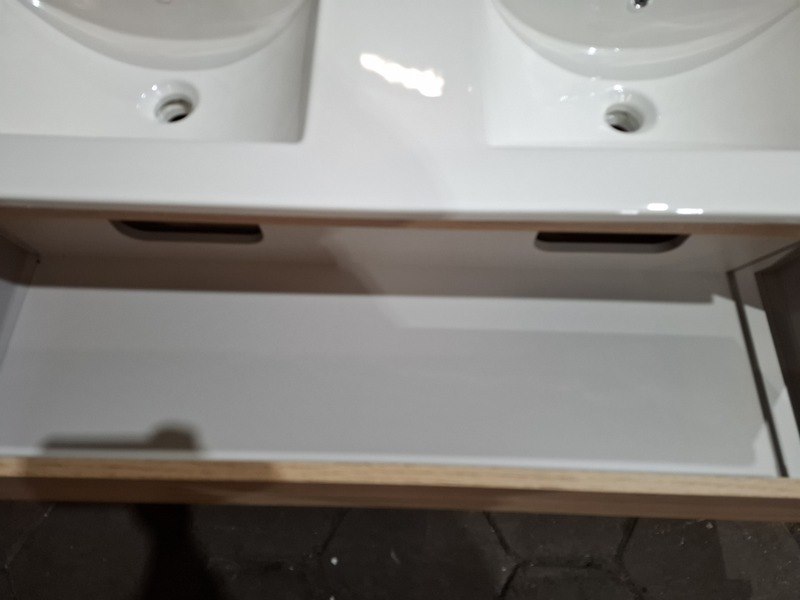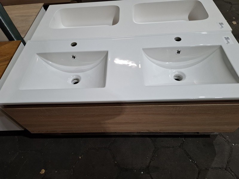 Product: Badmeubel Kleur: beach oak Afmeting: 120x46cm Specificaties: 1 lade met softclose, met Blum geleidesysteem, keramische wastafel, glans wit, 2 bakken, 2 kraangaten