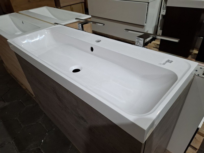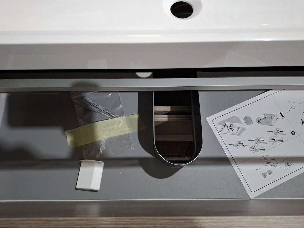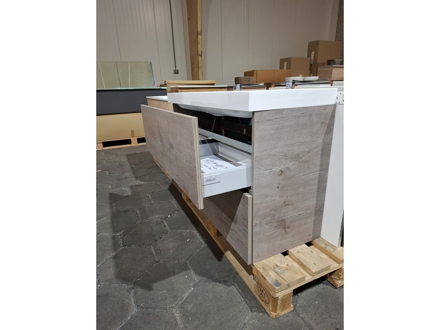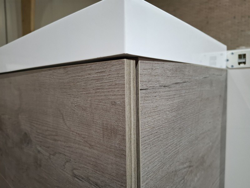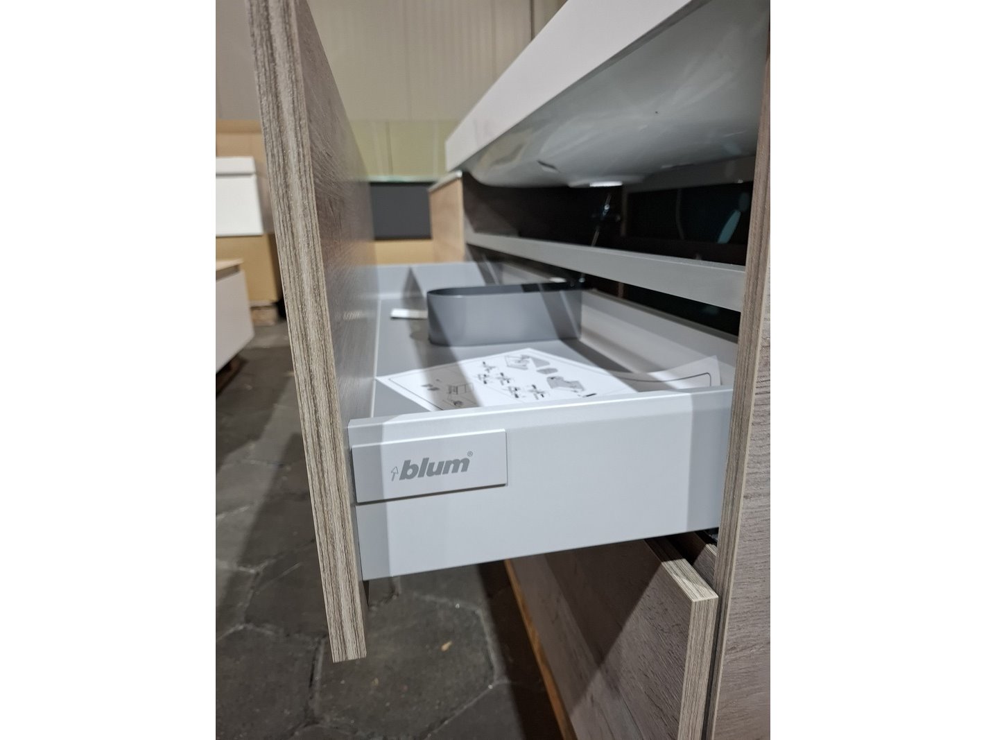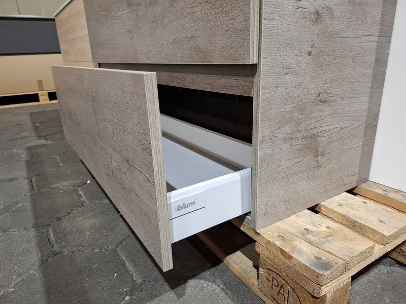 Product: Badmeubel Kleur: Lancelot grey Afmeting: 80x40cm Specificaties: 2 lades met softclose, push-to-open systeem, greeploos, polybeton wastafel, glans wit