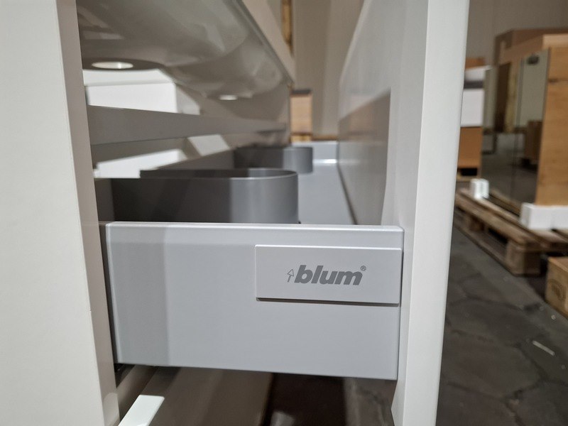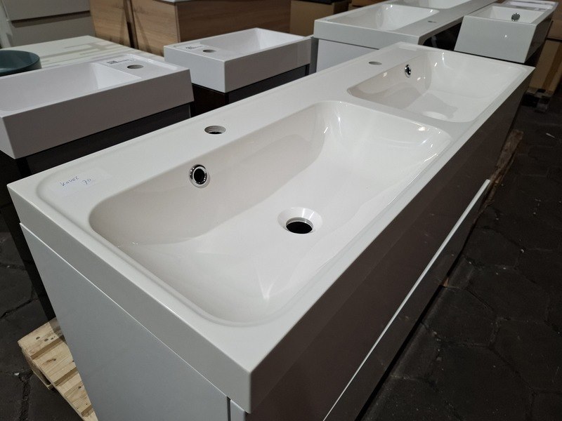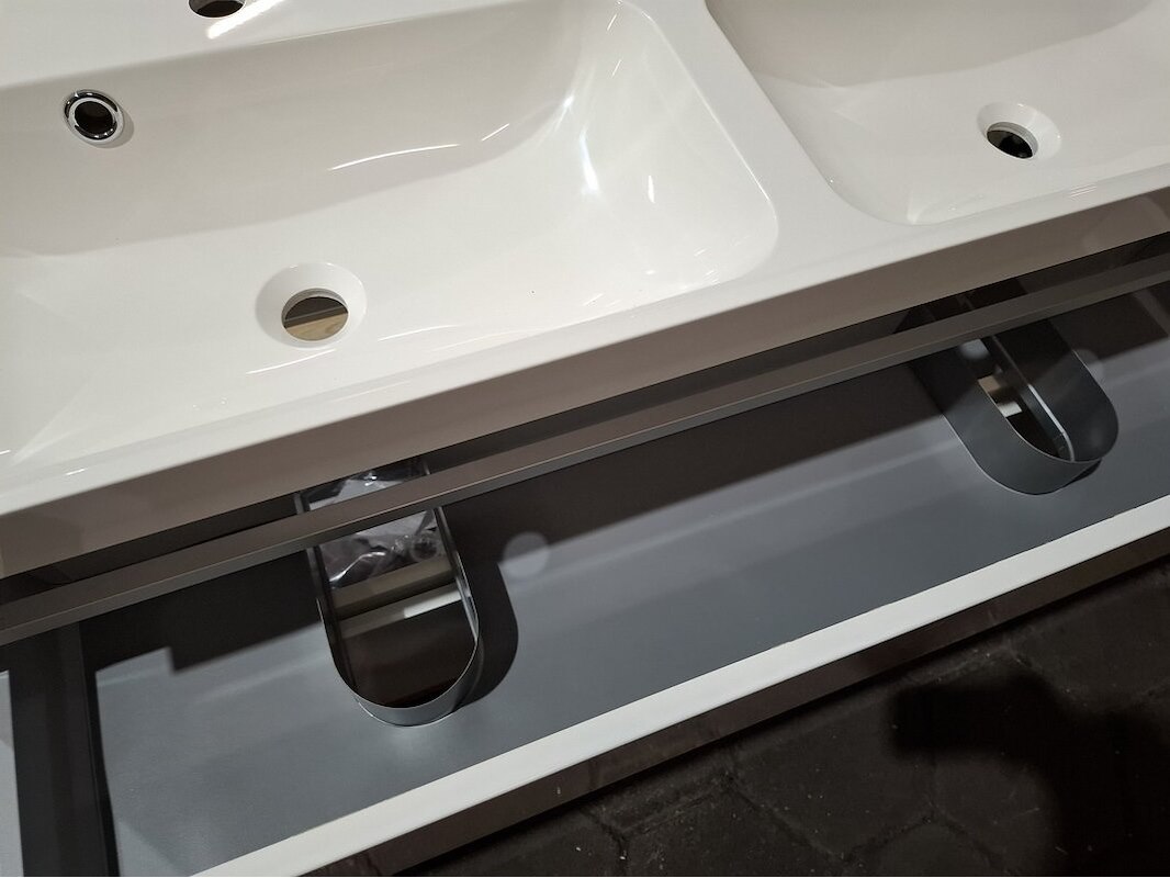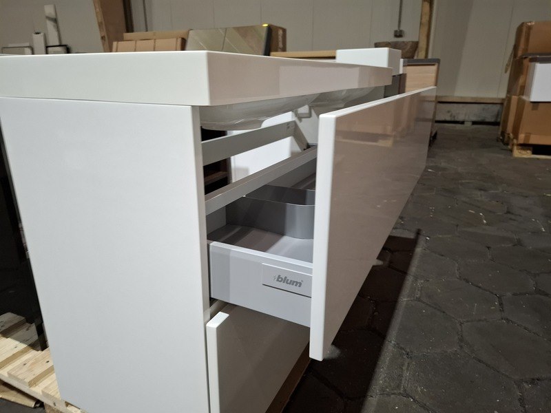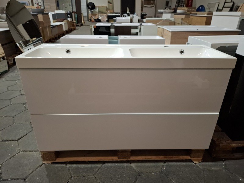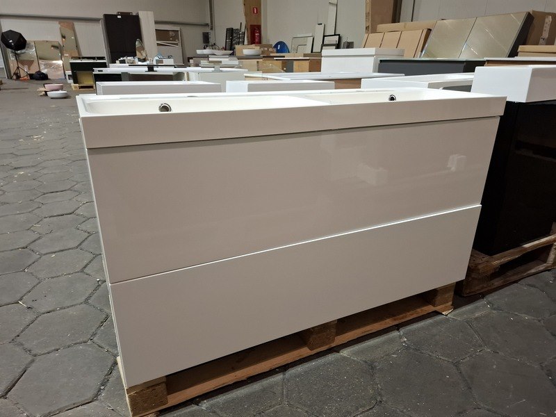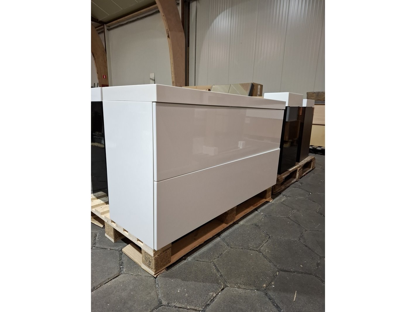 Product: Badmeubel Kleur: wit Afmeting: 120x40cm Specificaties: 2 lades met softclose, met Blum geleidesysteem, polybeton wastafel, glanswit