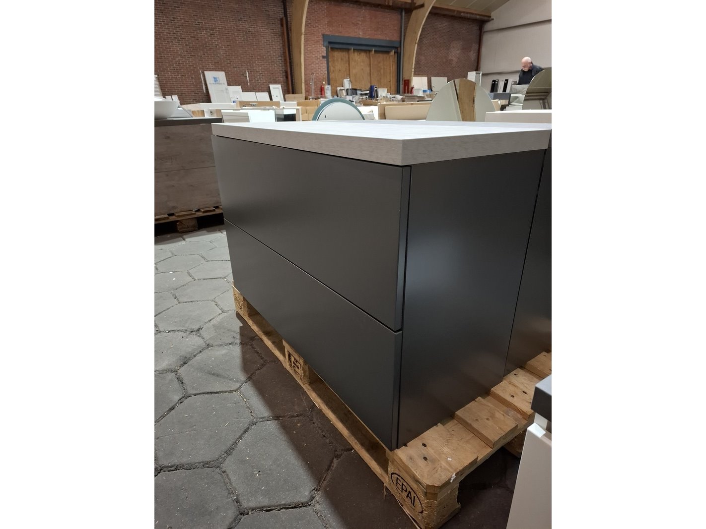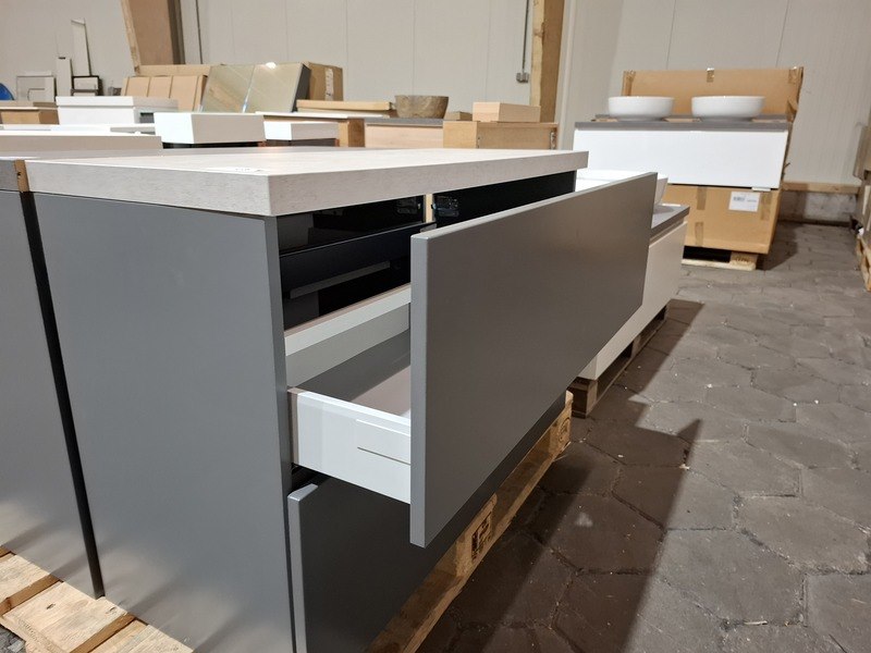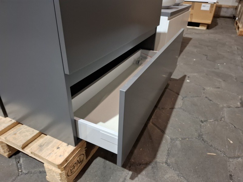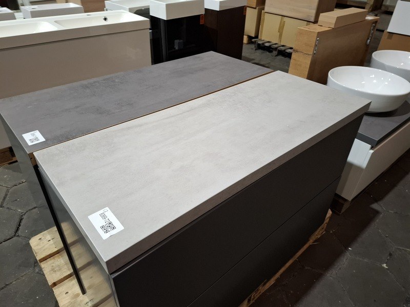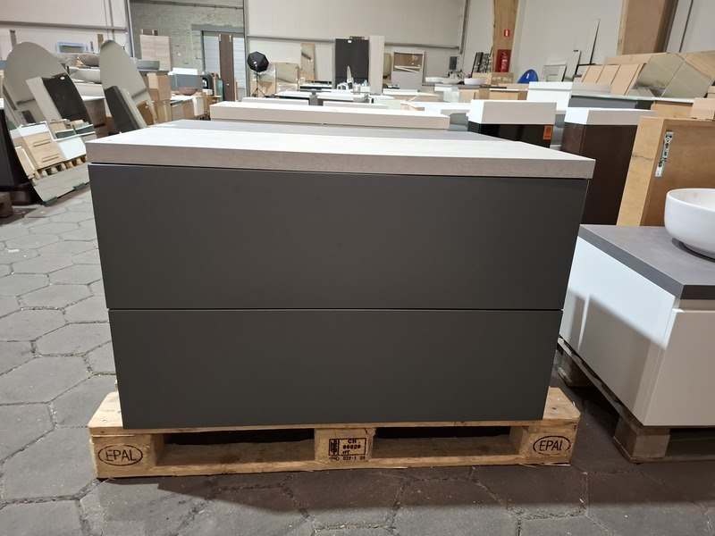 Product: Badmeubel Kleur: mat antraciet Afmeting: 100x40cm Specificaties: 2 lades met softclose, push-to-open, topblad beton grijs