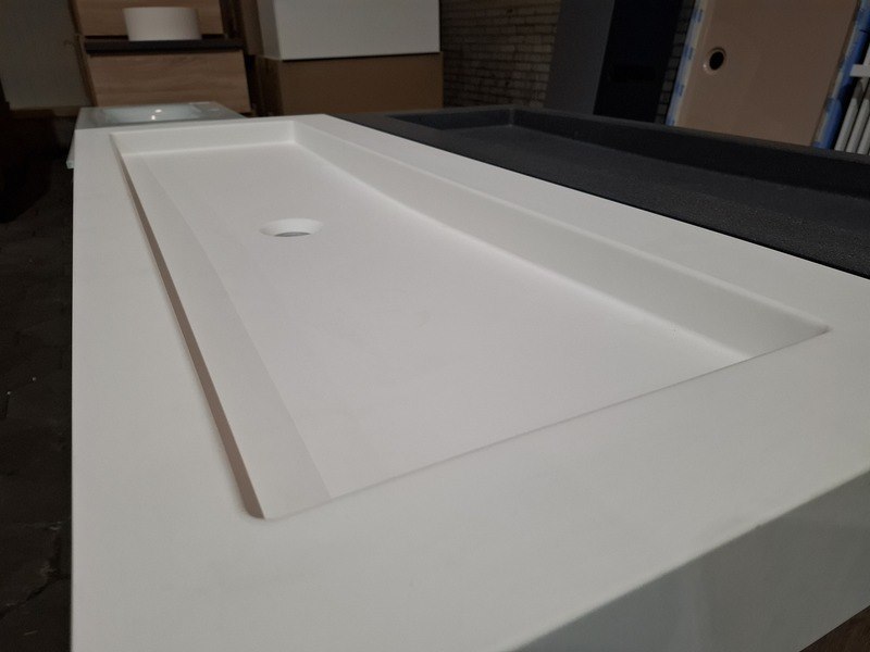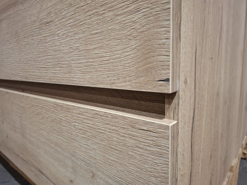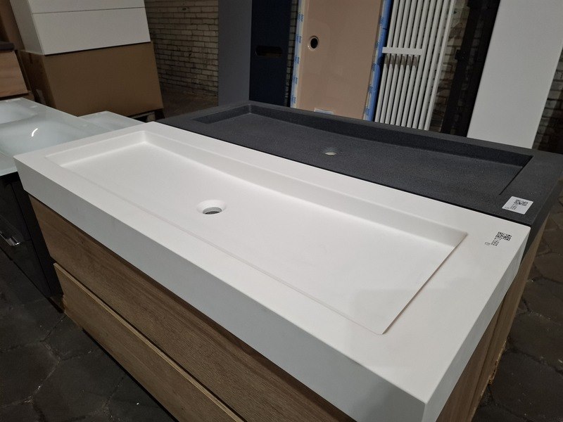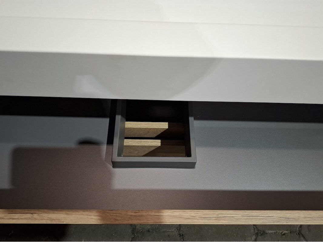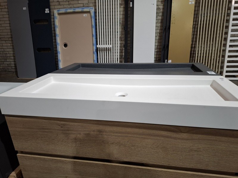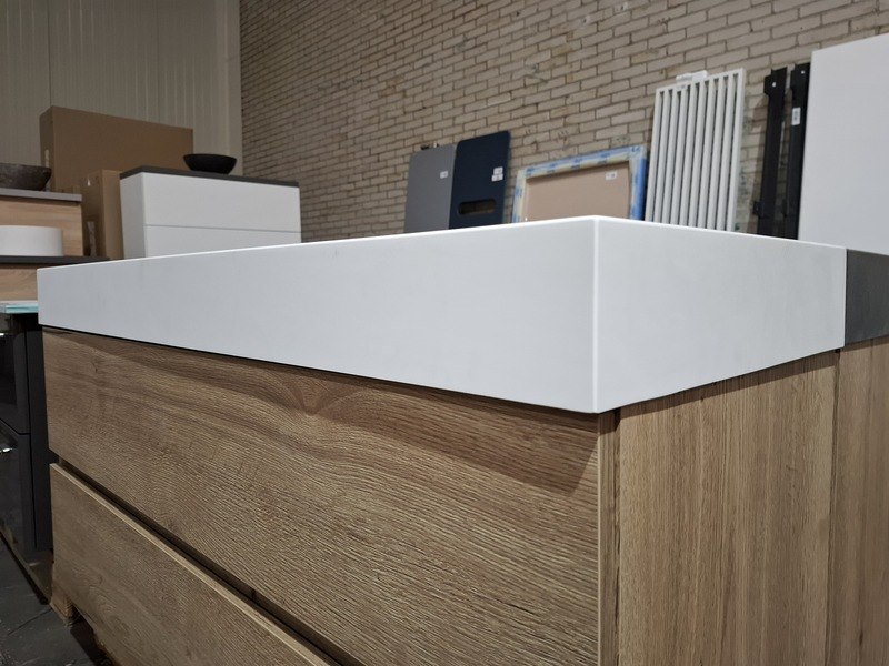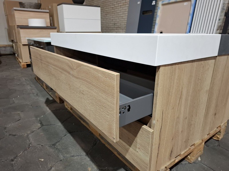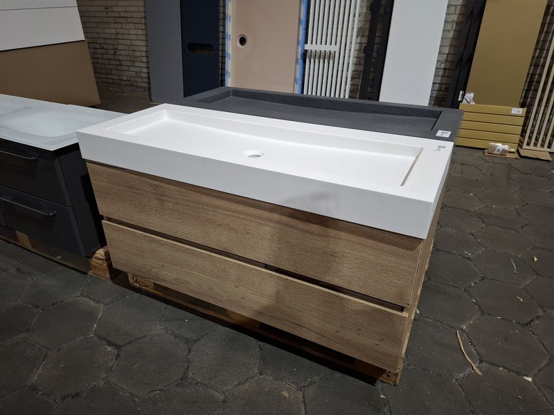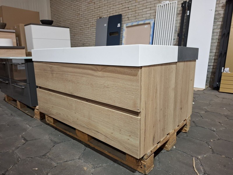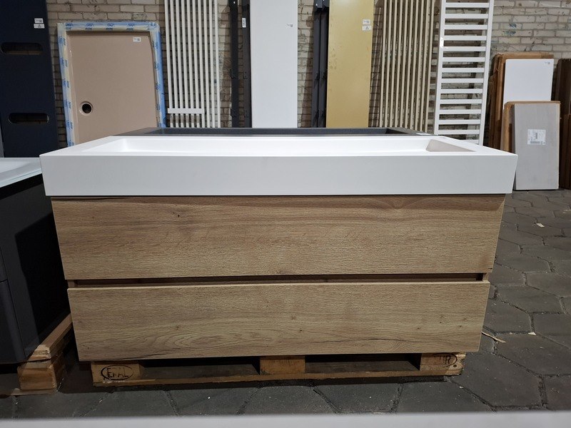 Merk: HR Badmeubelen Product: Badmeubel Kleur: natuur eiken Afmeting: 120x46cm Specificaties: 2 lades met softclose, met Blum geleidesysteem, polybeton topblad, mat wit