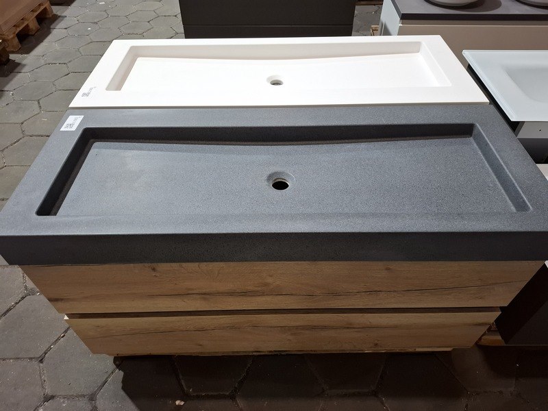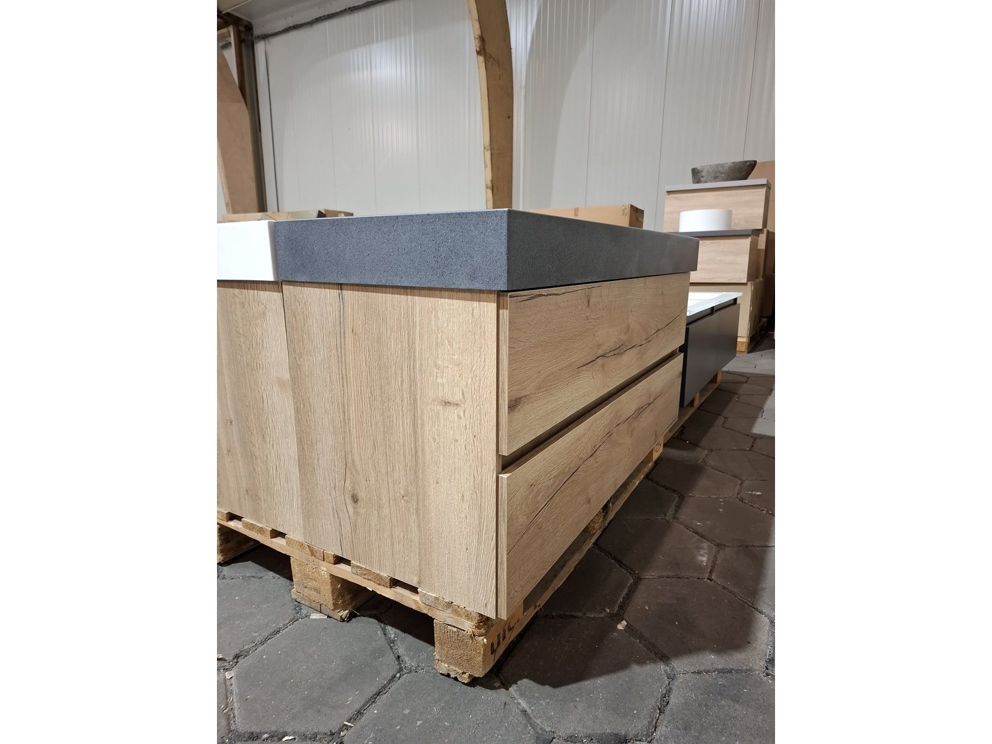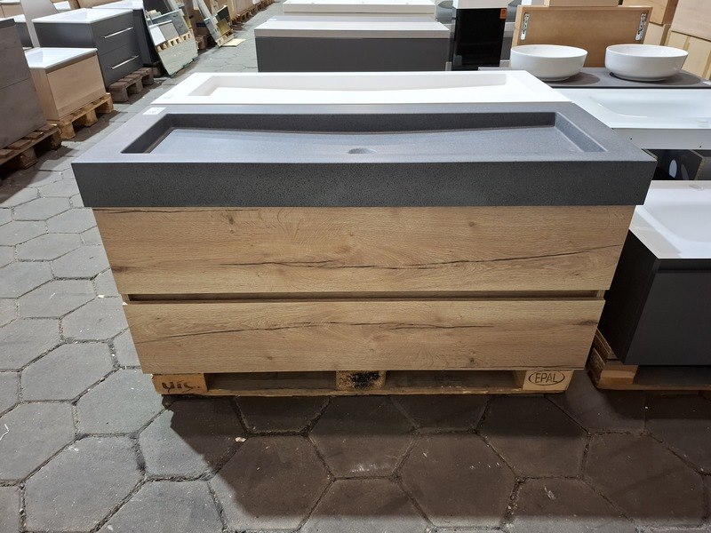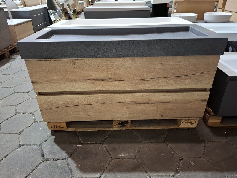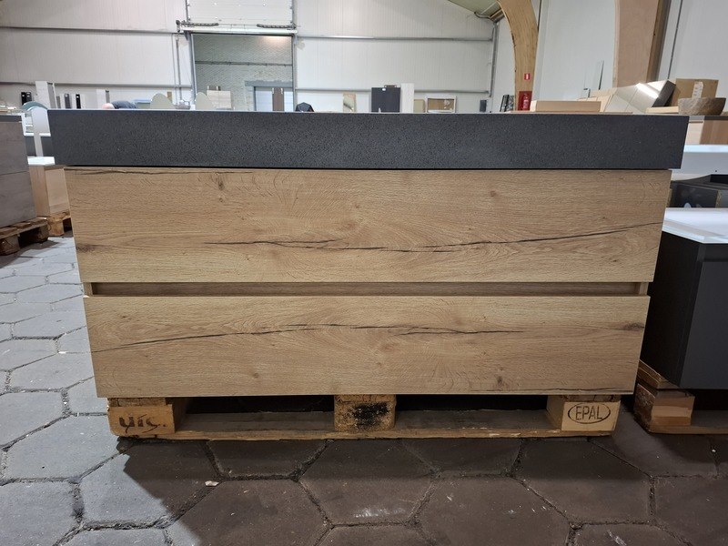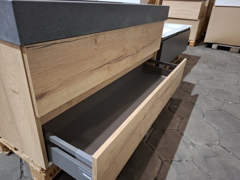 Merk: HR Badmeubelen Product: Badmeubel Kleur: natuur eiken Afmeting: 120x46cm Specificaties: 2 lades met softclose, met Blum geleidesysteem, polybeton topblad, mat antraciet