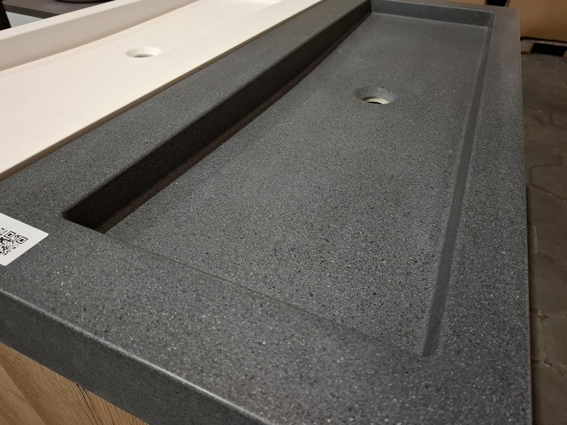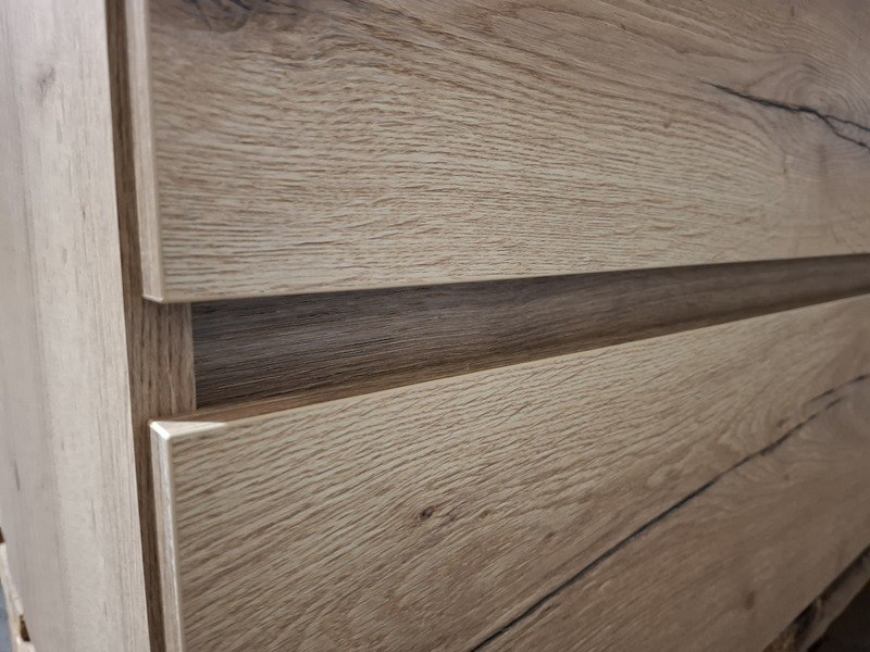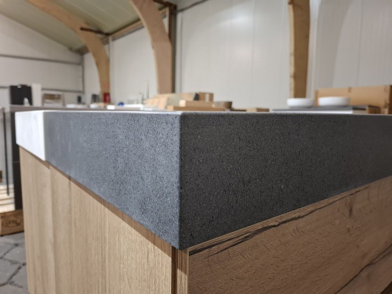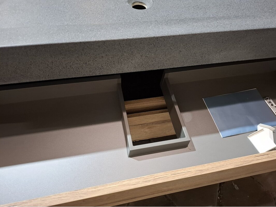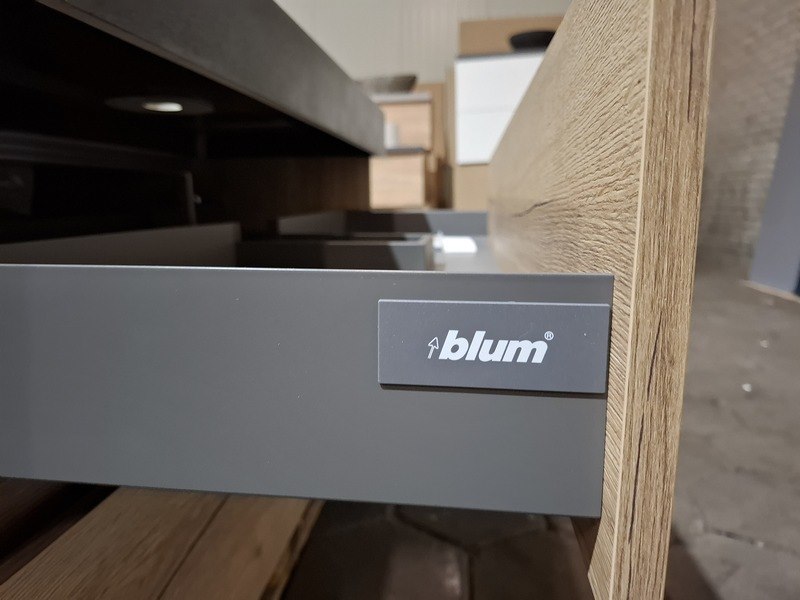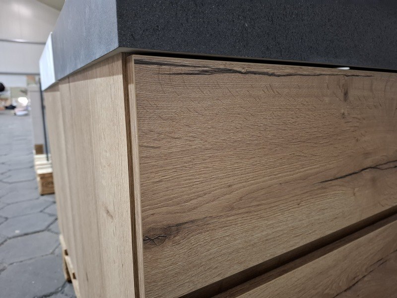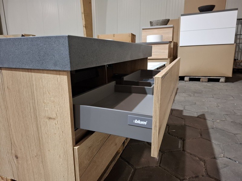 Merk: HR Badmeubelen Product: Badmeubel Kleur: natuur eiken Afmeting: 120x46cm Specificaties: 2 lades met softclose, met Blum geleidesysteem, polybeton topblad, mat antraciet