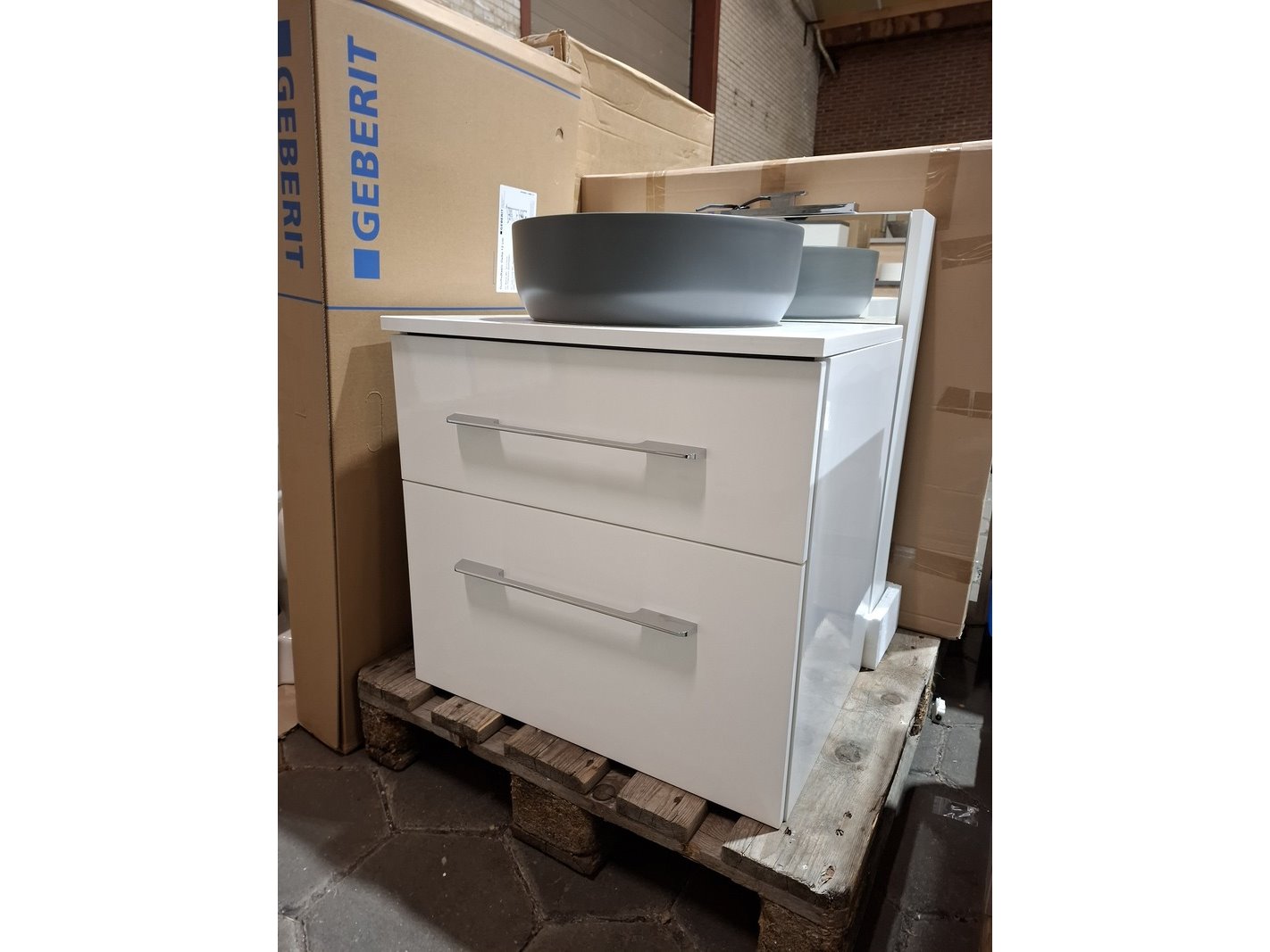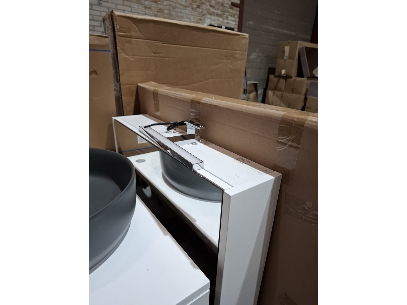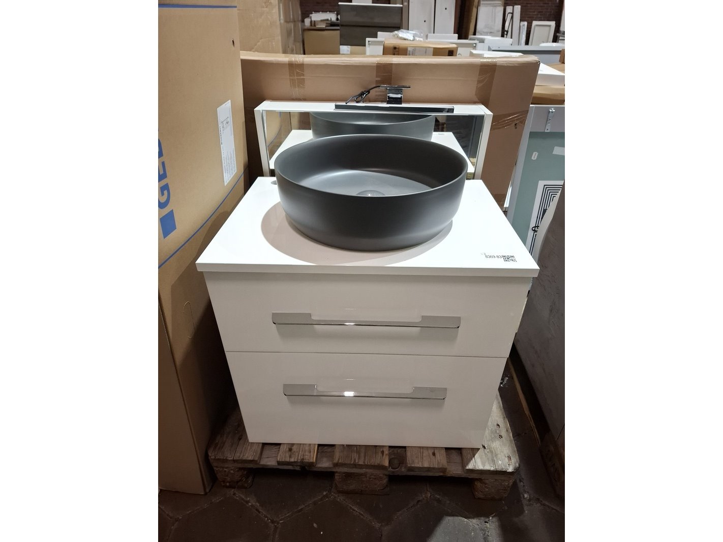 Product: Badmeubel Kleur: glans wit Afmeting: 60x42cm Specificaties: 2 lades, met softclose, met lade-verdeler, chromen grepen, topblad, glans wit, keramische waskom, Ø 40cm, mat zwart, waste, mat zwart, spiegelkast, 60cm, 1 deurtje, met softclose, spiegelverlichting