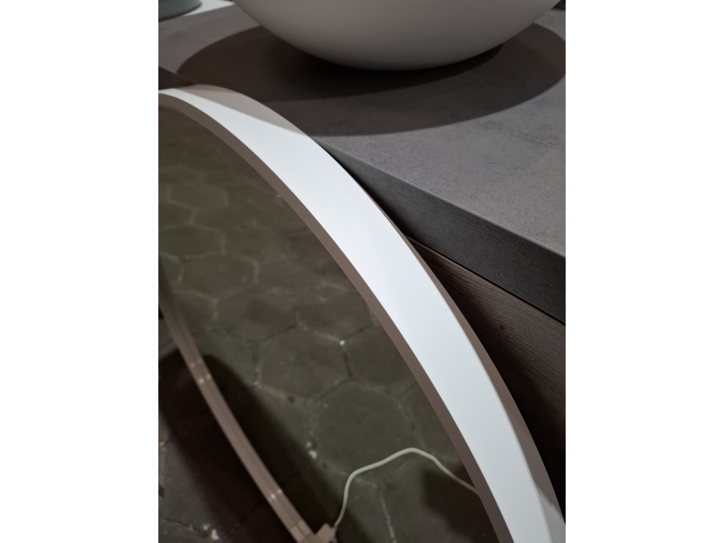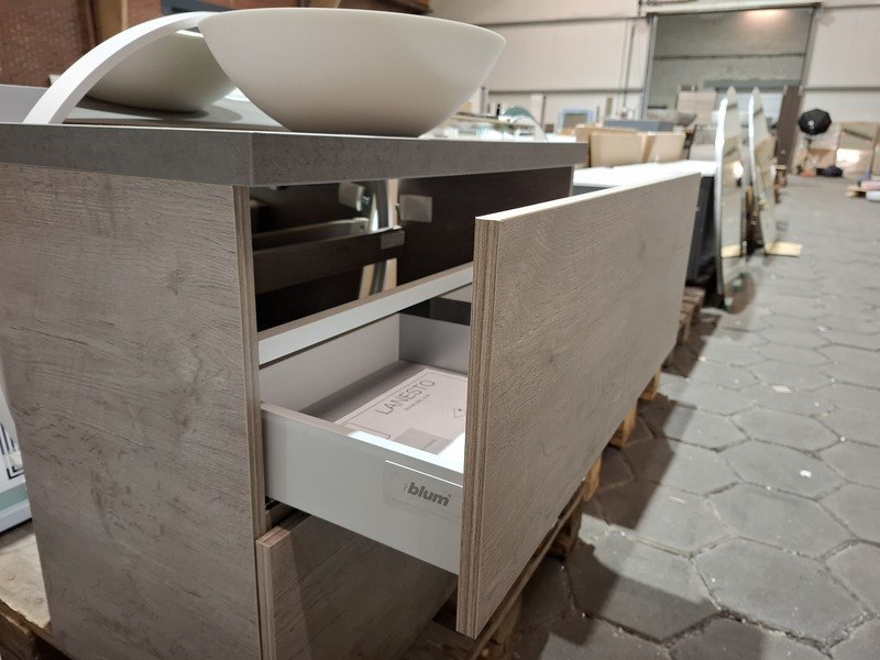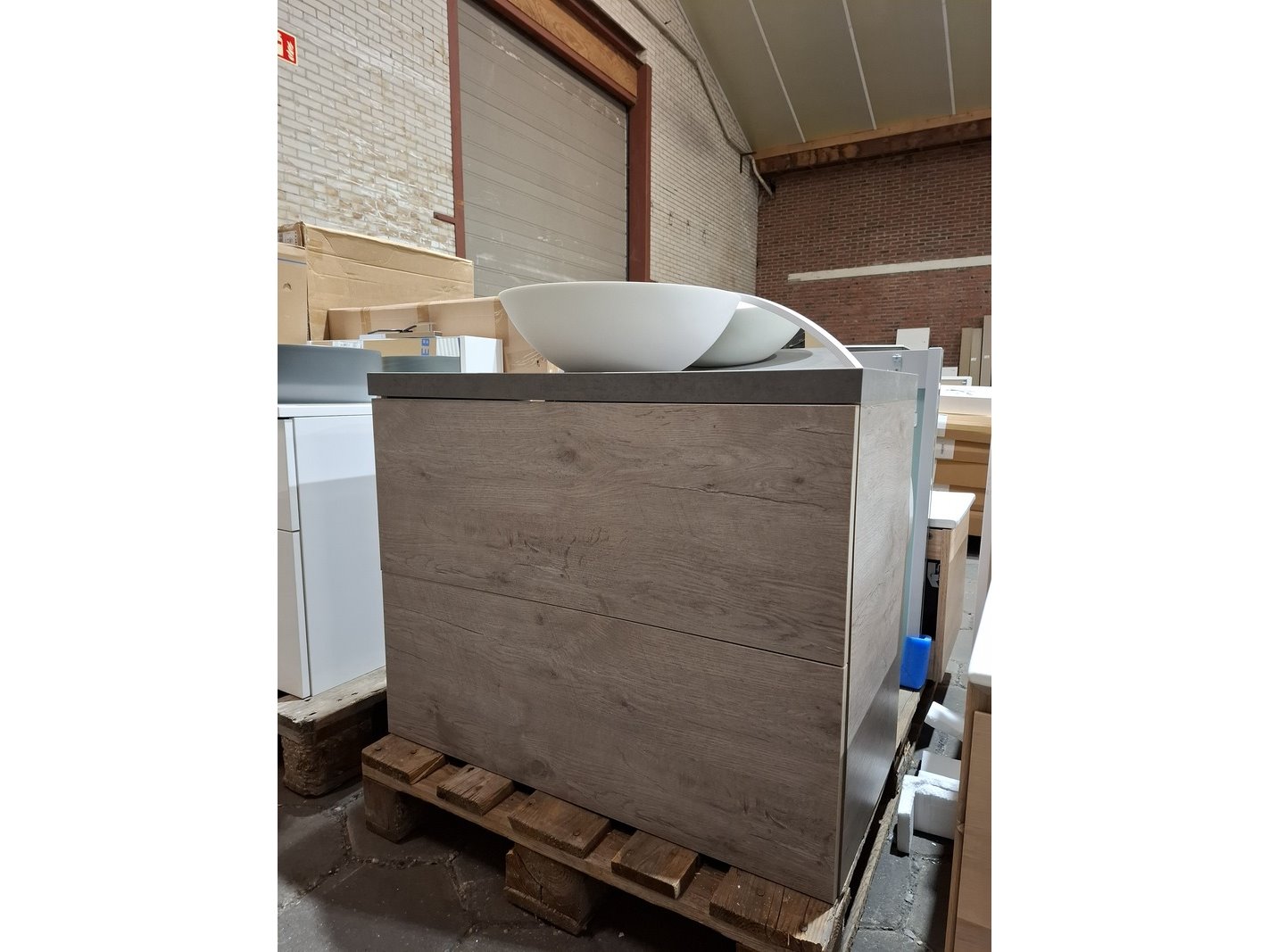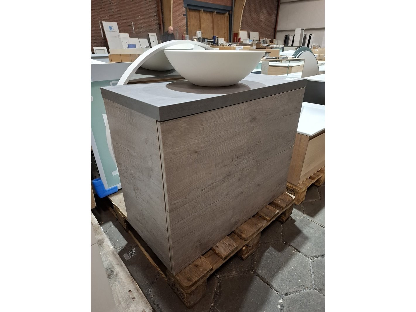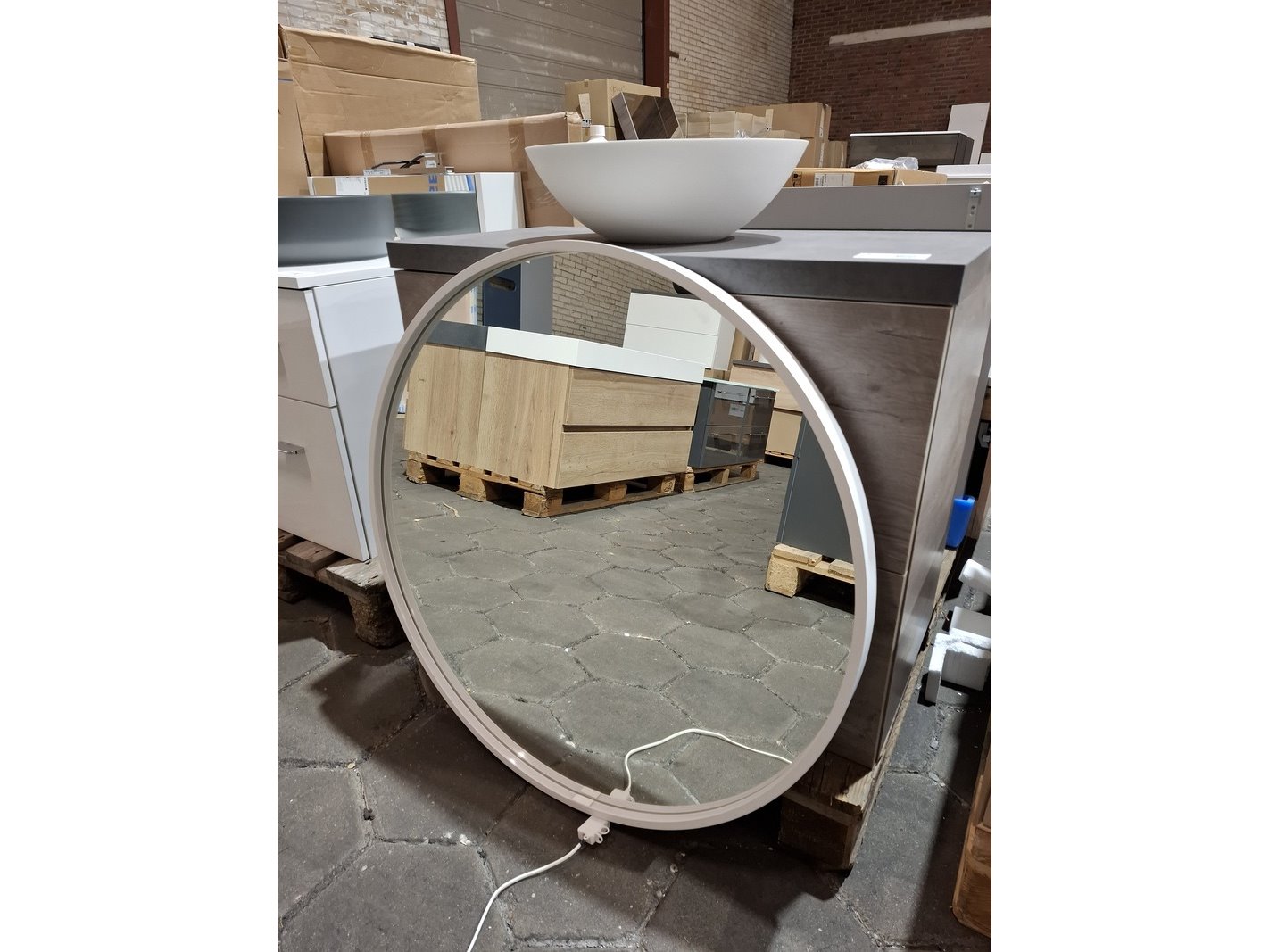 Product: Badmeubel Kleur: Lancelot grijs Afmeting: 80x40cm Specificaties: 2 lades met softclose, met Blum geleide systeem, push-to-open systeem, topblad, antraciet, solid surface waskom, mat wit, ronde spiegel, Ø 80cm, met mat wit kader, met LED verlichting rondom, met spiegelverwarming