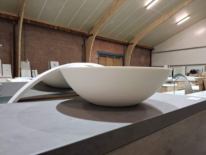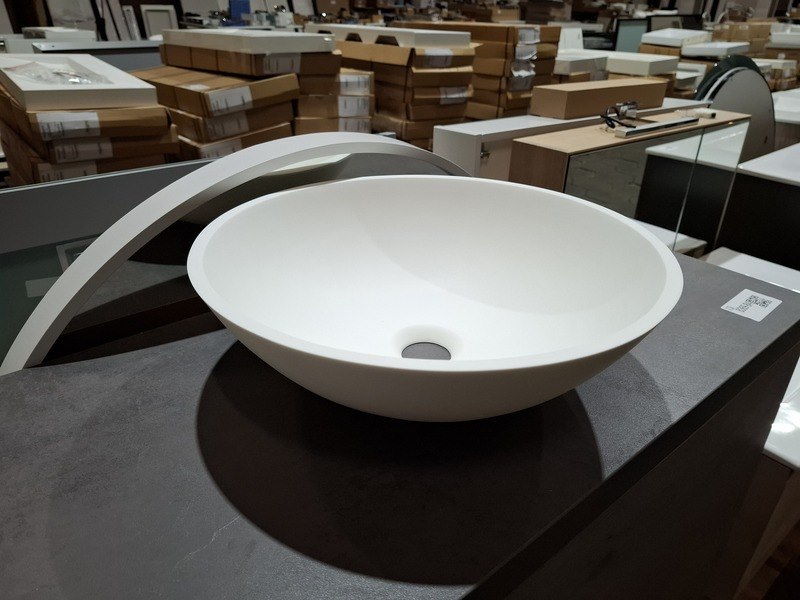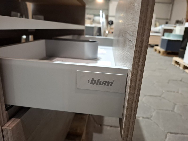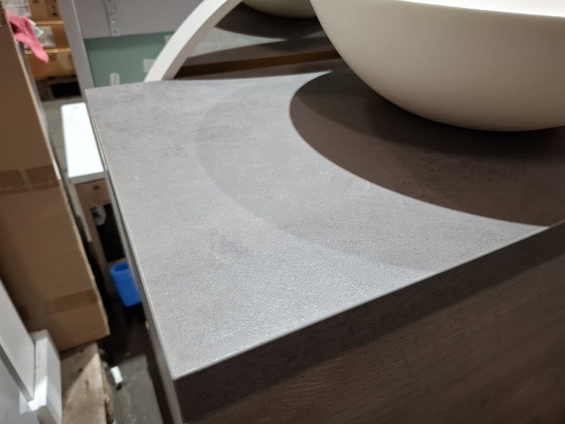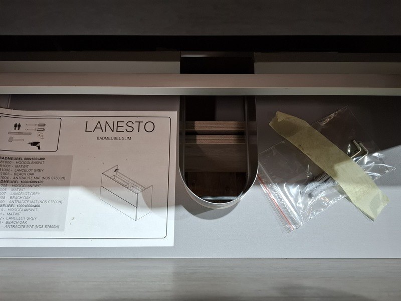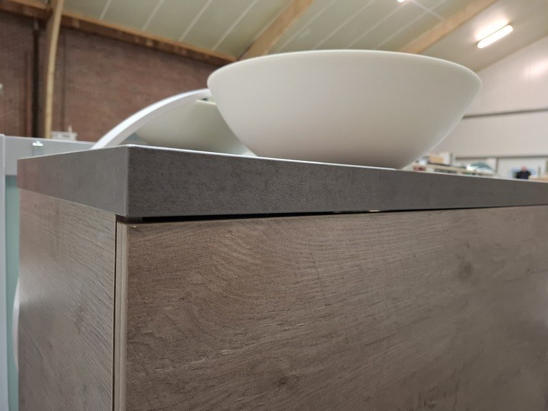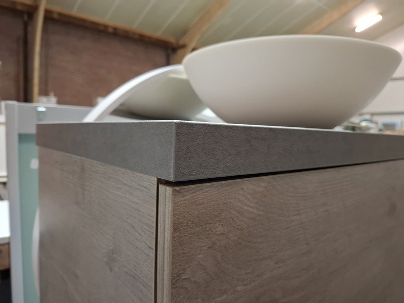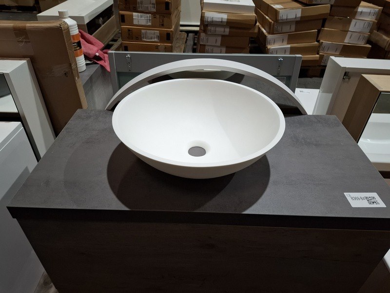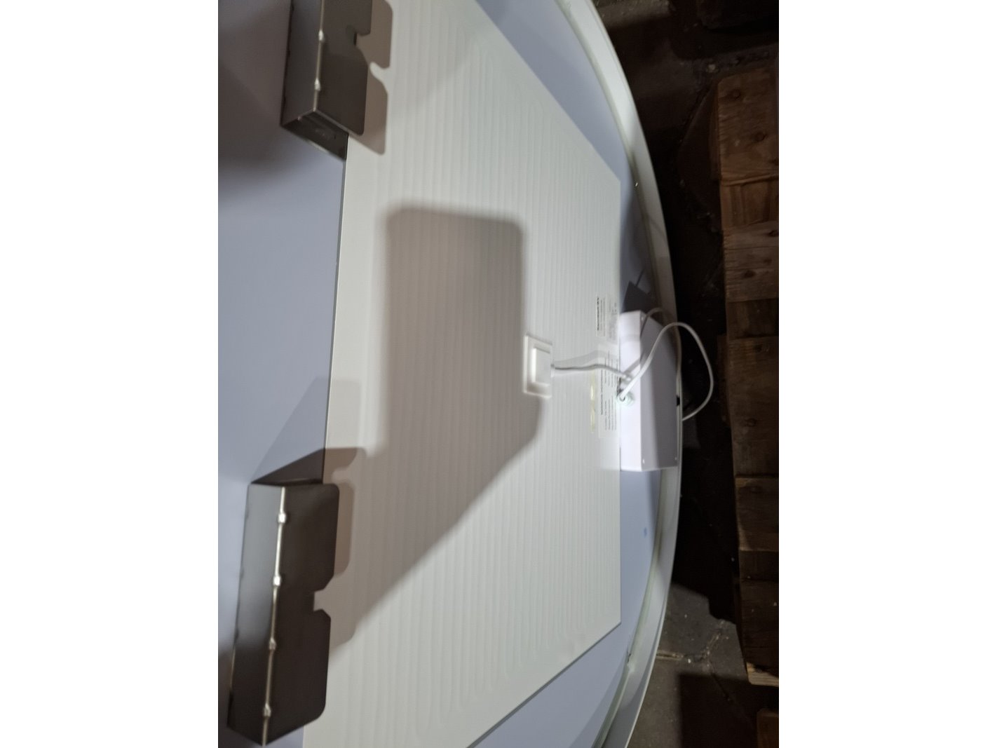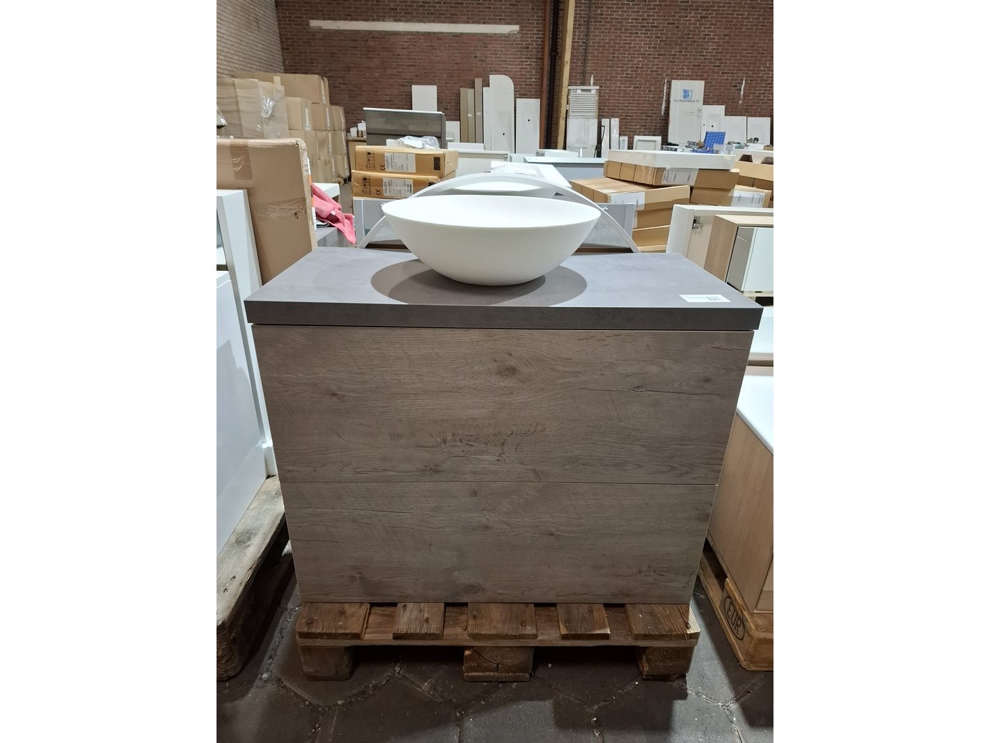 Product: Badmeubel Kleur: Lancelot grijs Afmeting: 80x40cm Specificaties: 2 lades met softclose, met Blum geleide systeem, push-to-open systeem, topblad, antraciet, solid surface waskom, mat wit, ronde spiegel, Ø 80cm, met mat wit kader, met LED verlichting rondom, met spiegelverwarming