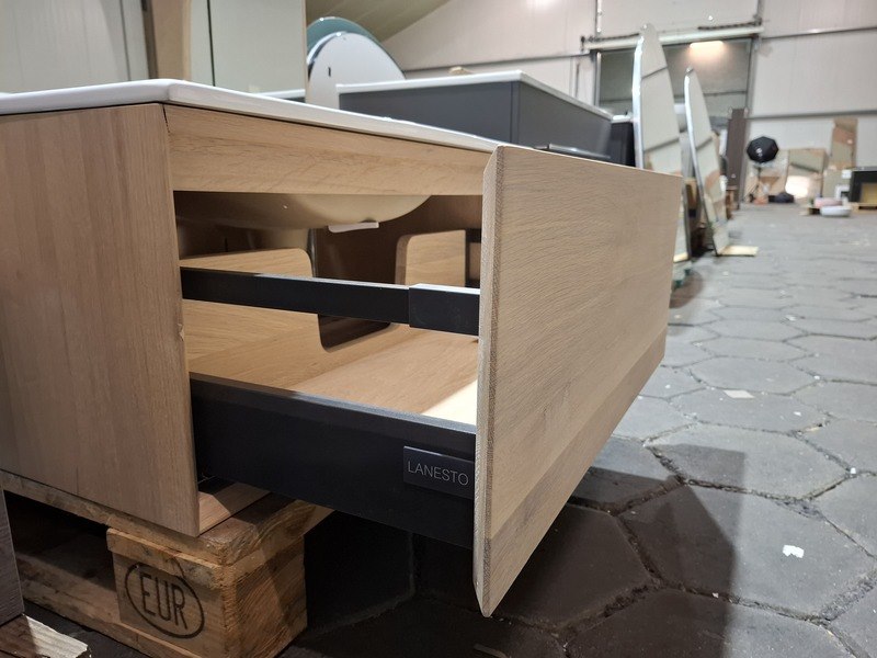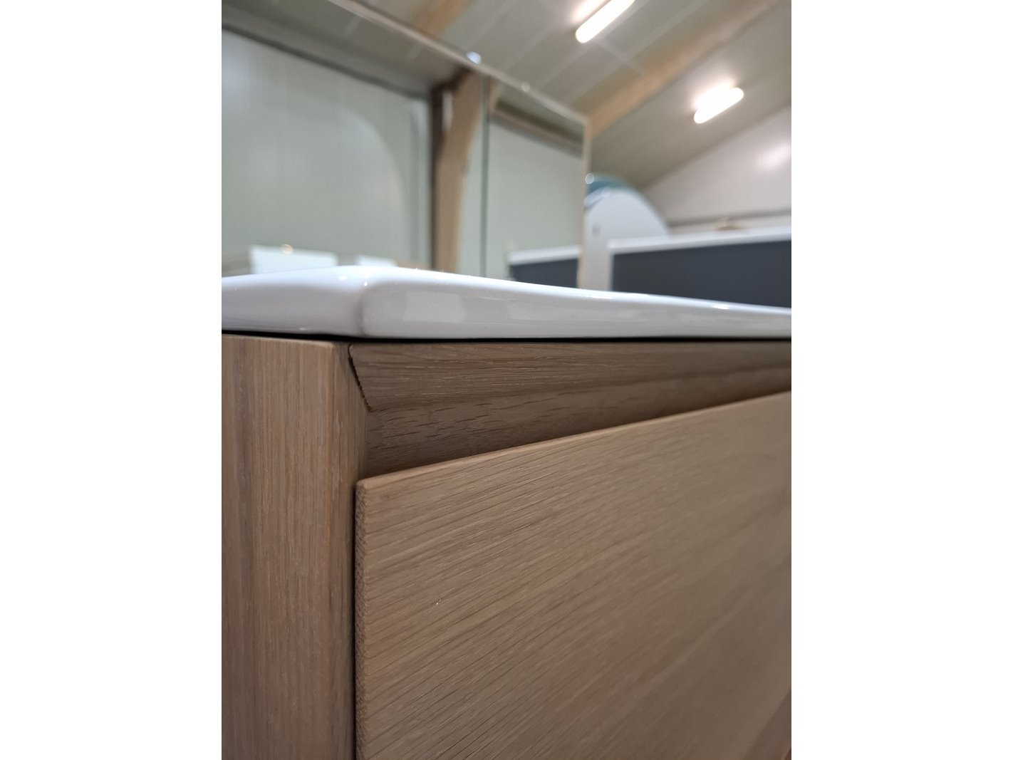 Product: Badmeubel Kleur: white wash Materiaal: massief eiken Afmeting: 75x46cm Specificaties: 1 lade met softclose, keramische wastafel, glans wit, spiegelkast, 75cm, massief eiken, white wash, 2 deurtjes met softclose, spiegelverlichting