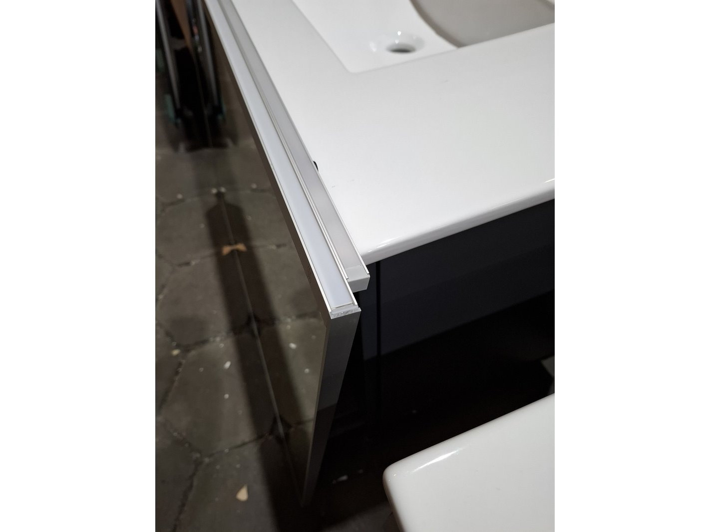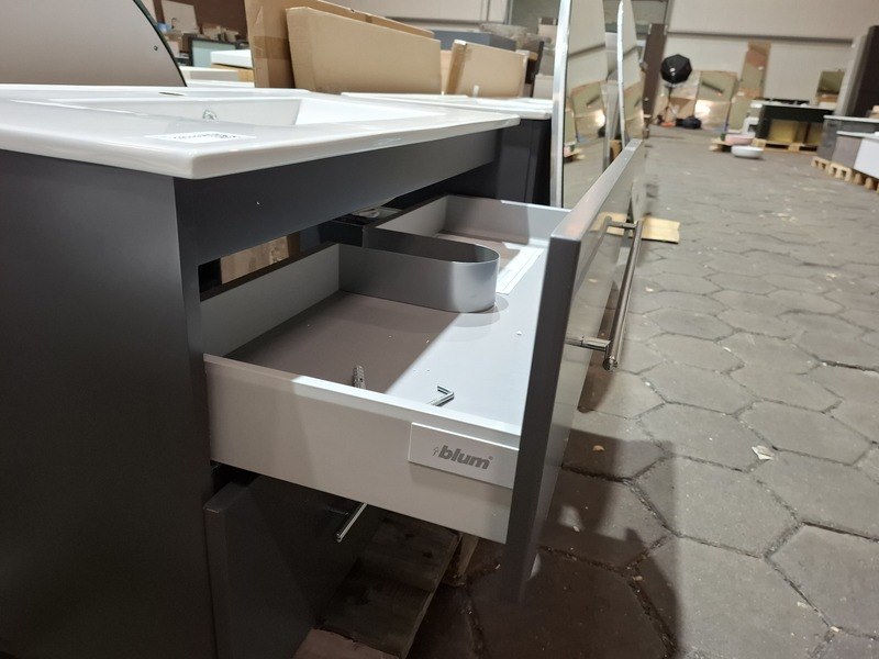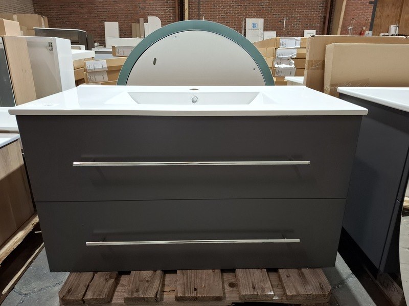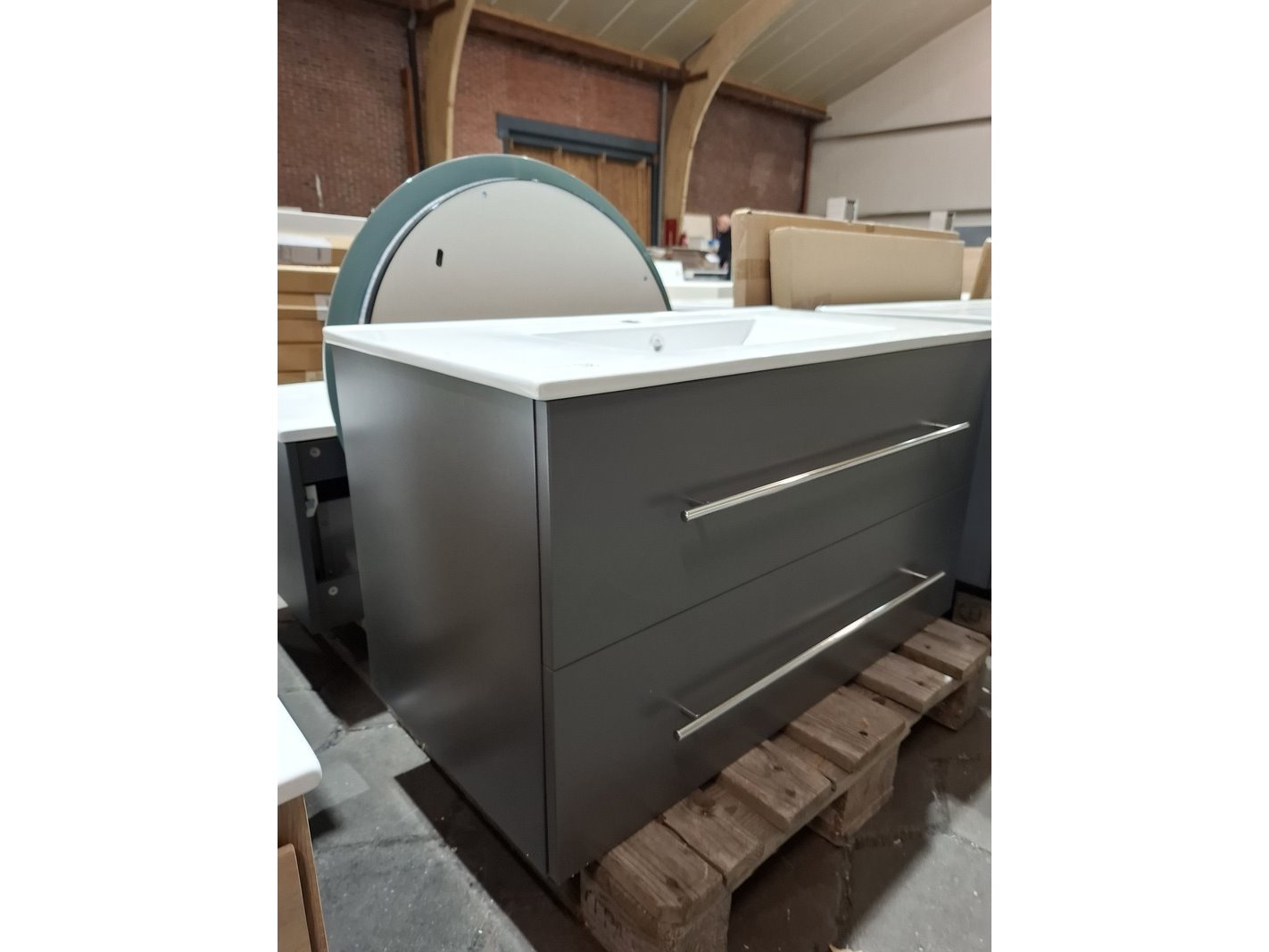 Product: Badmeubel Kleur: mat antraciet Afmeting: 90x46cm Specificaties: 2 lades met softclose, met Blum geleide systeem, chromen grepen, keramische wastafel, glans wit, ovale spiegel, 90x45cm, antraciet kader, LED verlichting rondom, spiegelverwarming, sensorbediening
