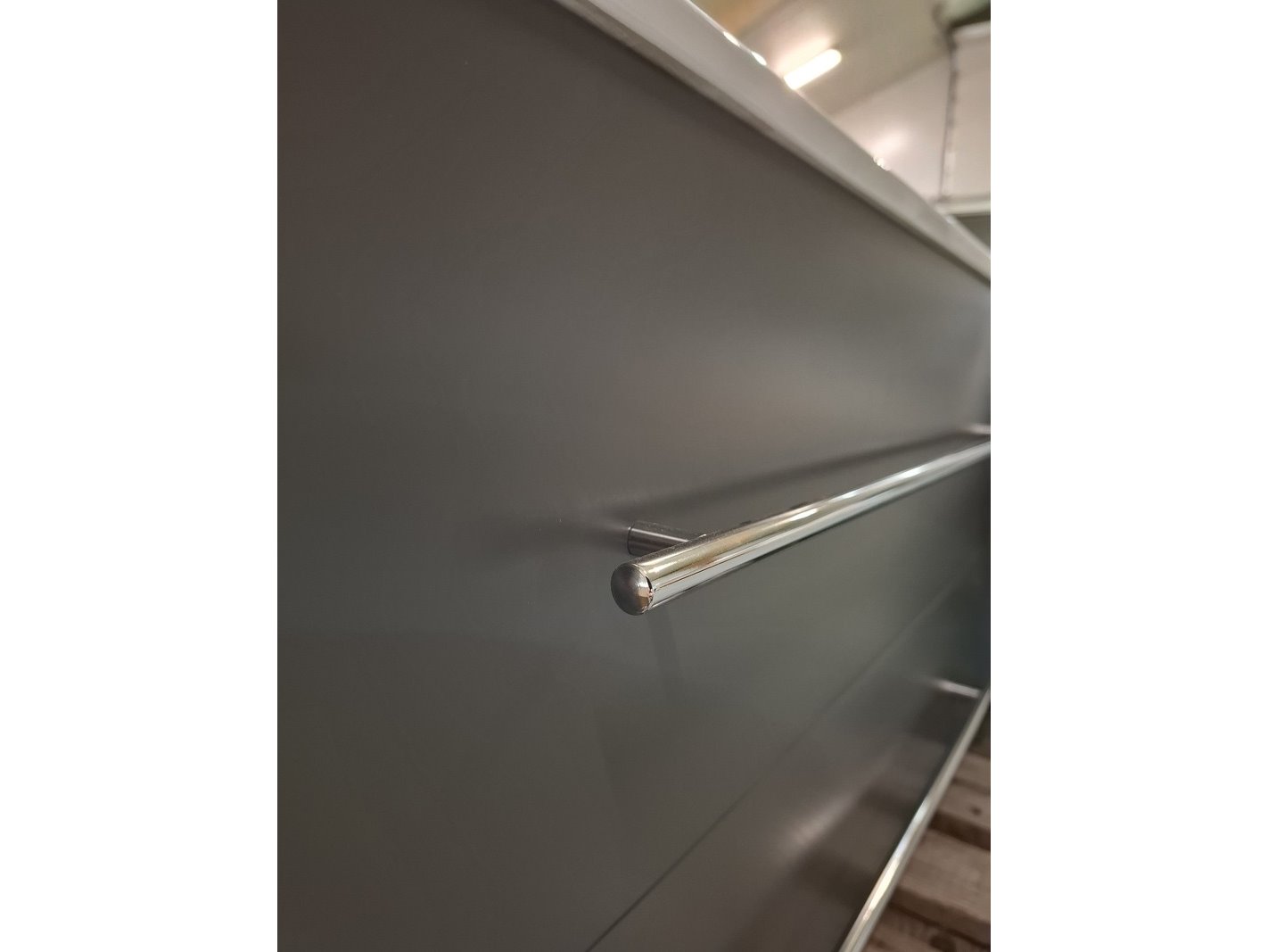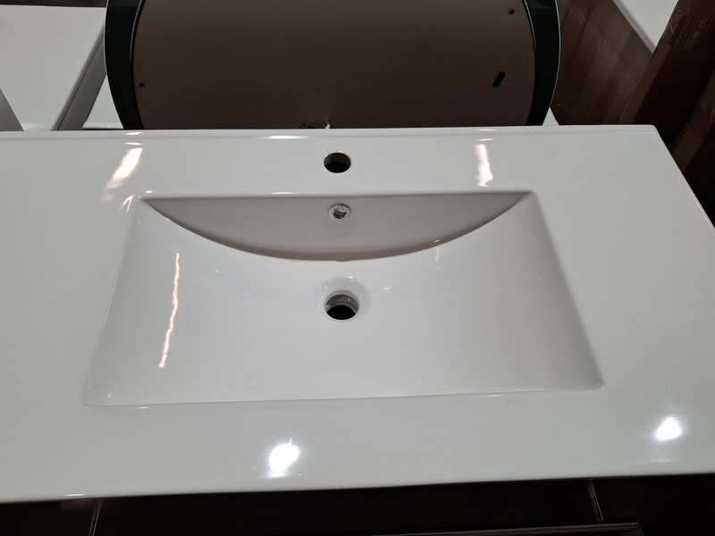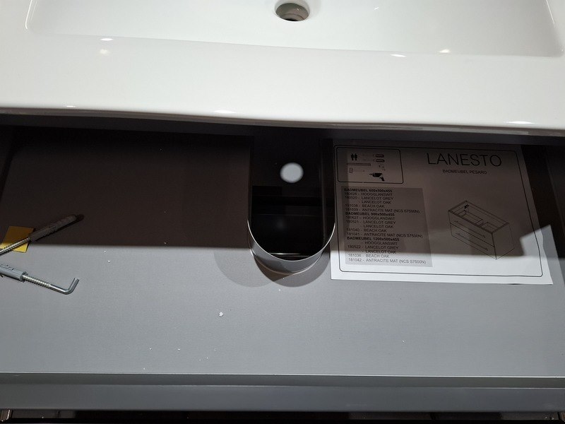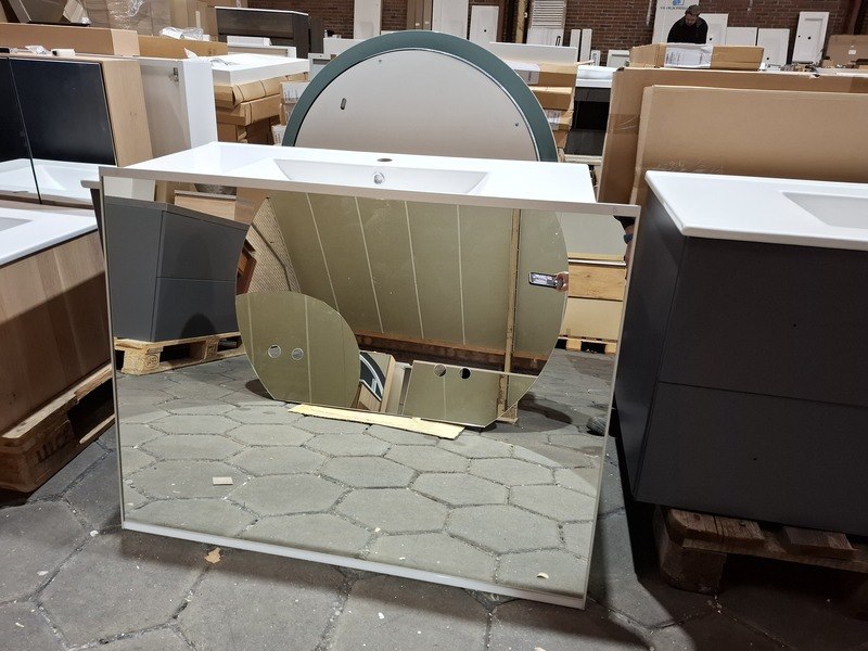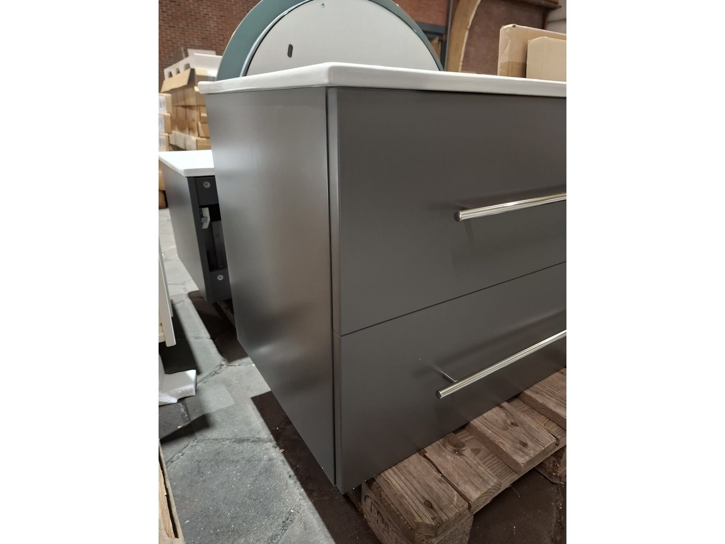 Product: Badmeubel Kleur: mat antraciet Afmeting: 90x46cm Specificaties: 2 lades met softclose, met Blum geleide systeem, chromen grepen, keramische wastafel, glans wit, ovale spiegel, 90x45cm, antraciet kader, LED verlichting rondom, spiegelverwarming, sensorbediening