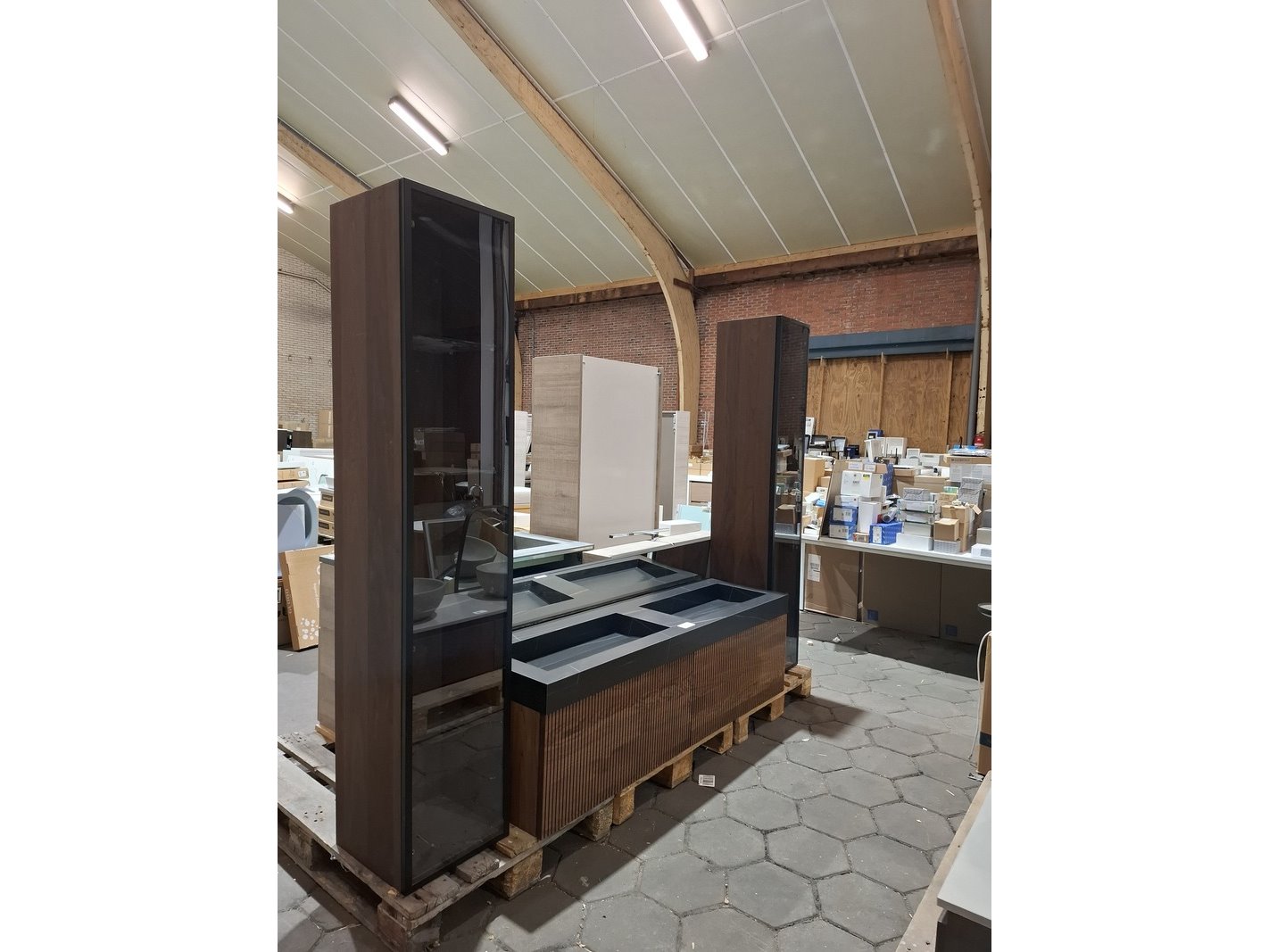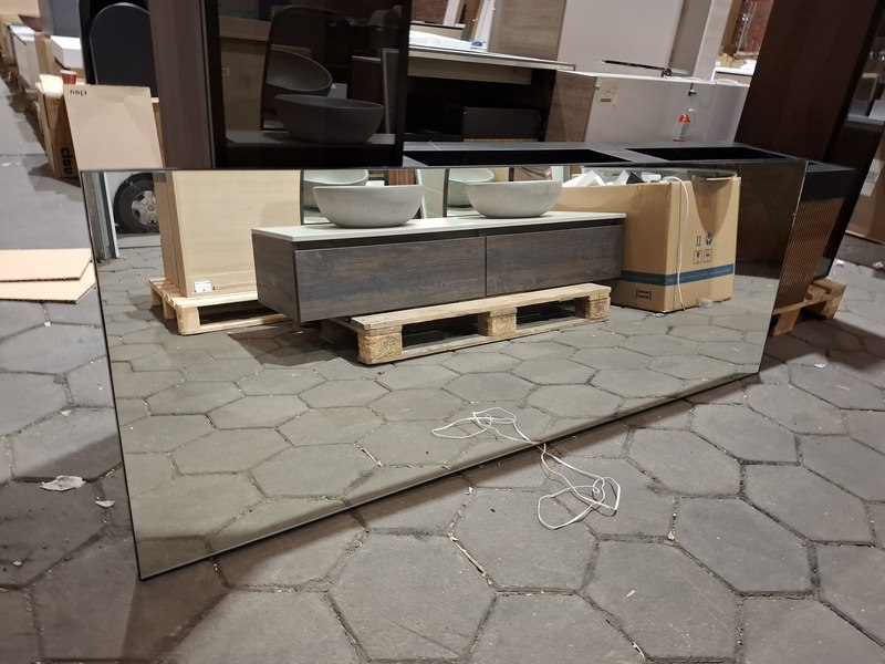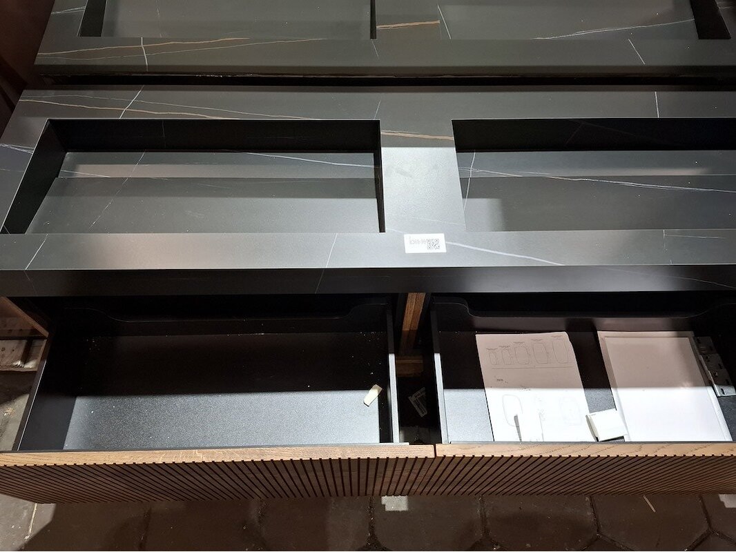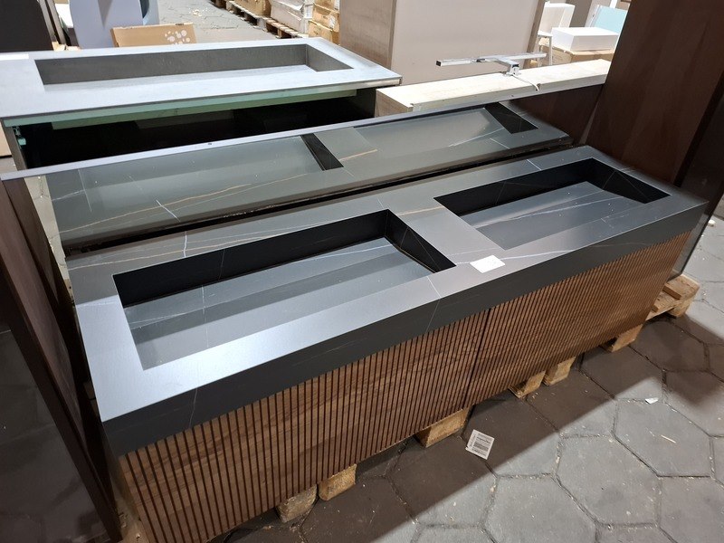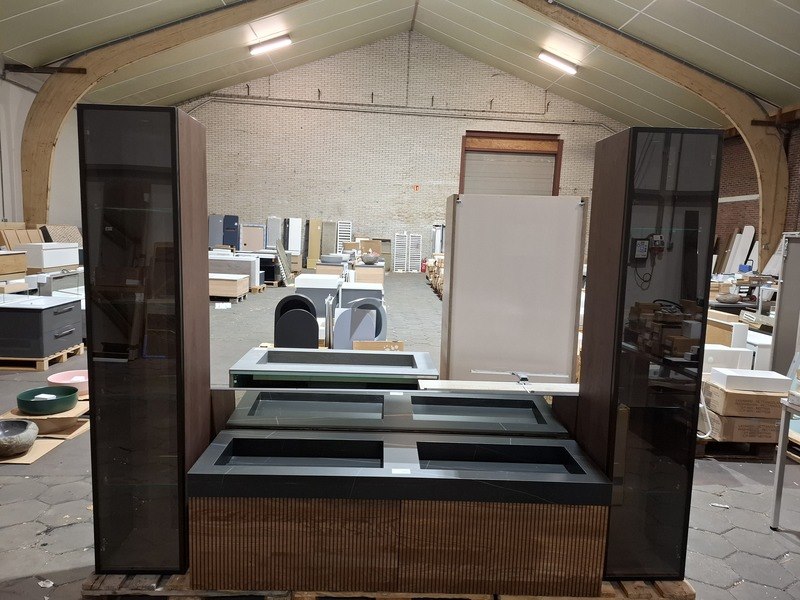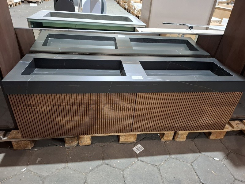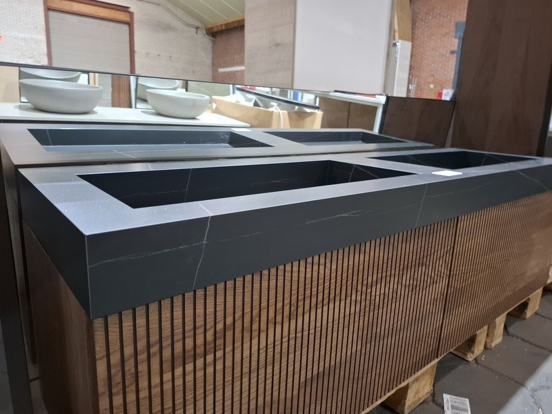 Merk: Elise Product: Badmeubel Kleur: palissander Afmeting: 160x45cm Specificaties: 2 lades met softclose, 3-D fronten, wastafel, zwart/marmer, 2 bakken, verdekte afvoer, spiegel, 160x80cm, mat zwart kader, 2x hoge kast, 180x35x35cm, glazen deur, 4 glazen leggers, LED verlichting