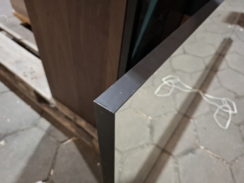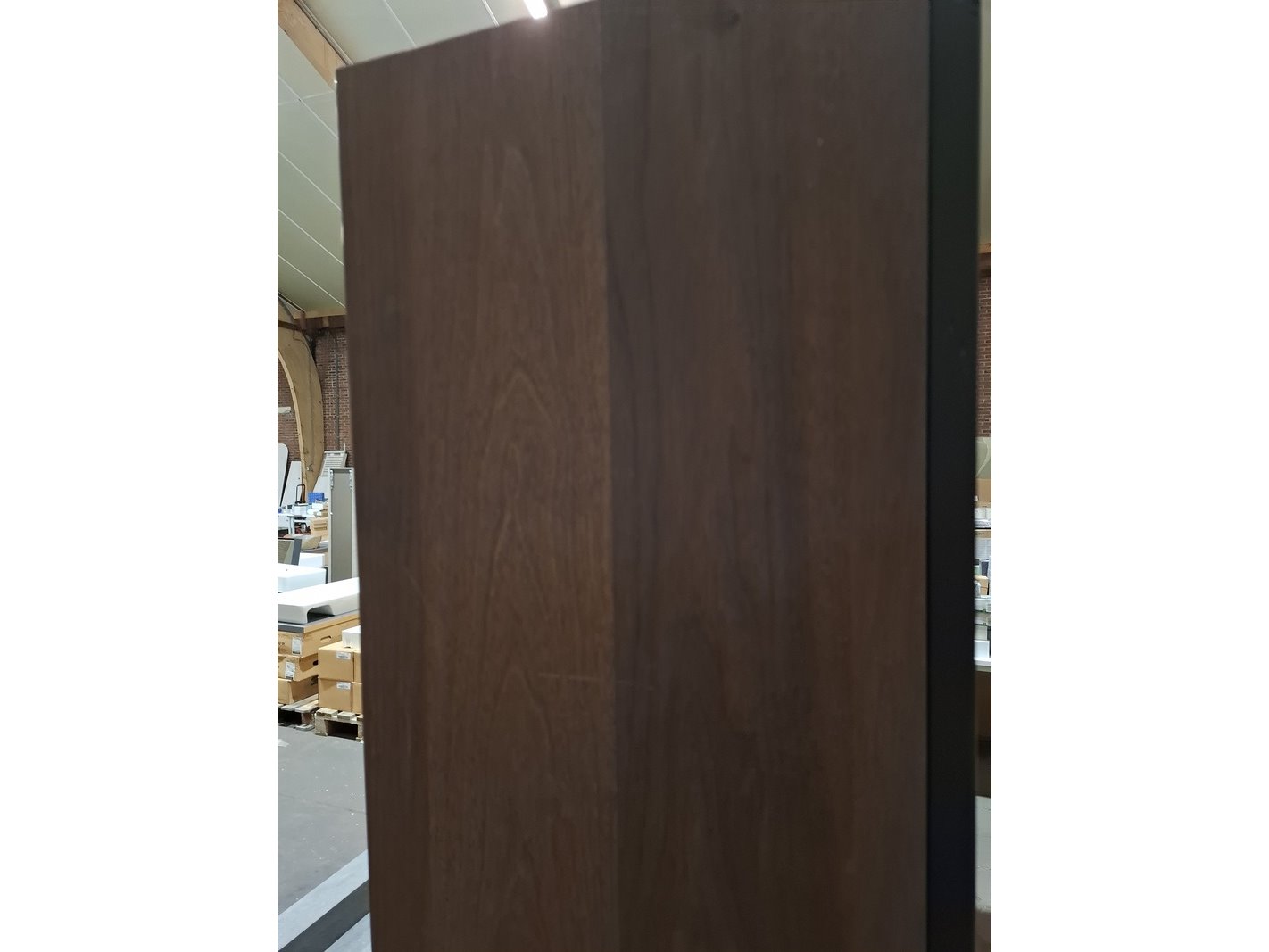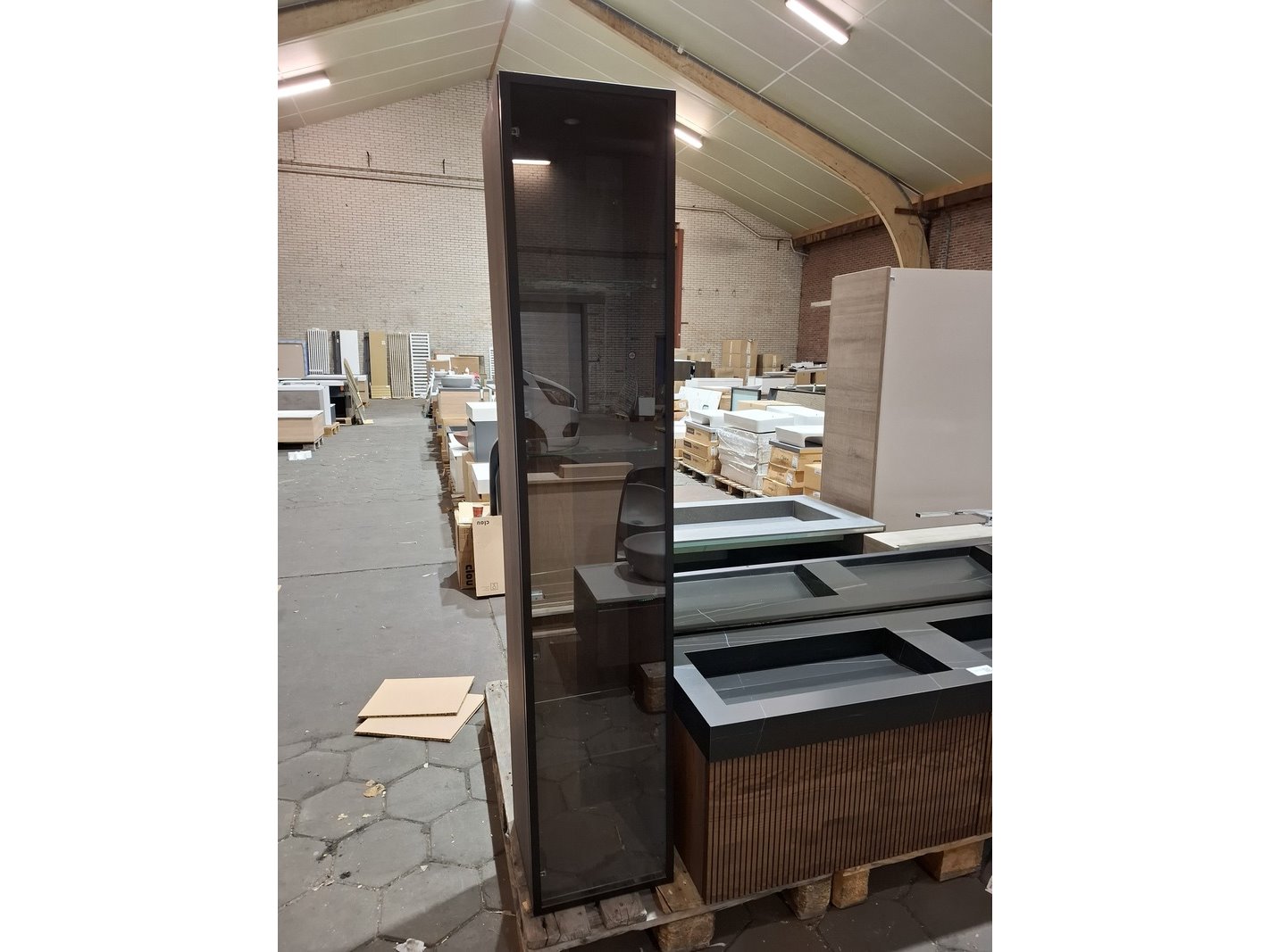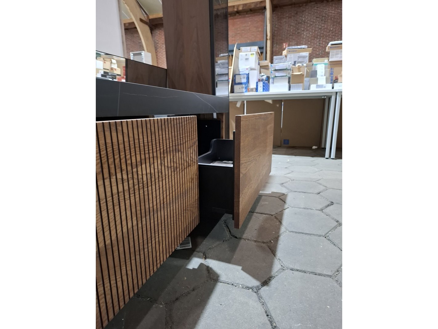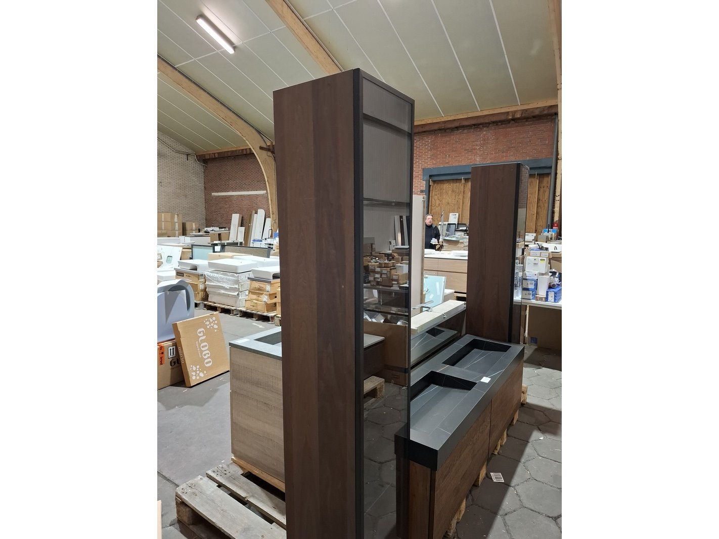 Merk: Elise Product: Badmeubel Kleur: palissander Afmeting: 160x45cm Specificaties: 2 lades met softclose, 3-D fronten, wastafel, zwart/marmer, 2 bakken, verdekte afvoer, spiegel, 160x80cm, mat zwart kader, 2x hoge kast, 180x35x35cm, glazen deur, 4 glazen leggers, LED verlichting