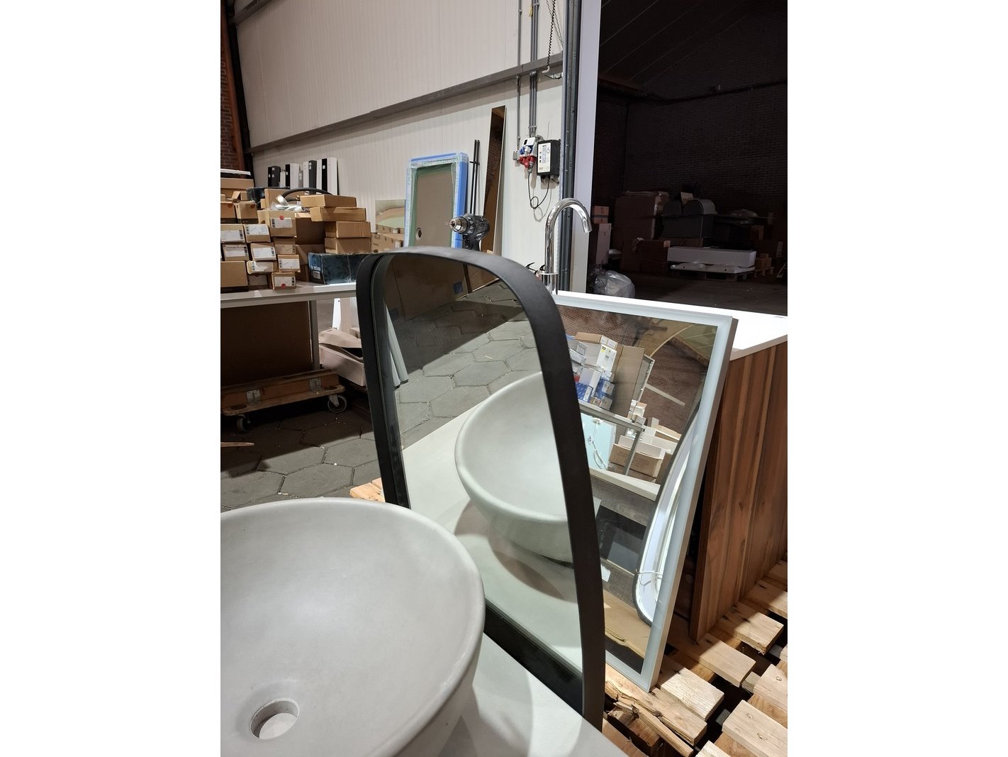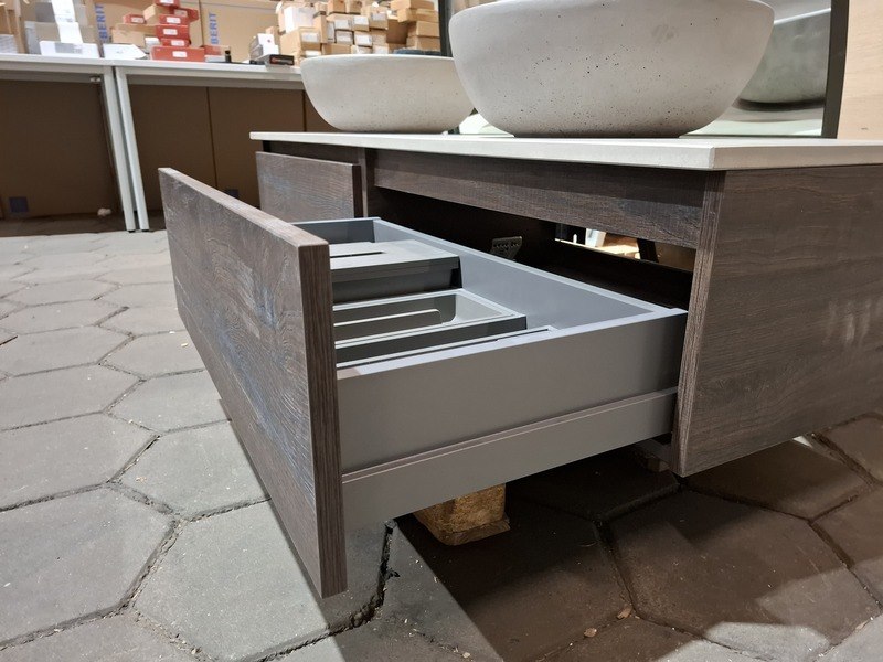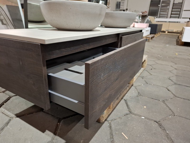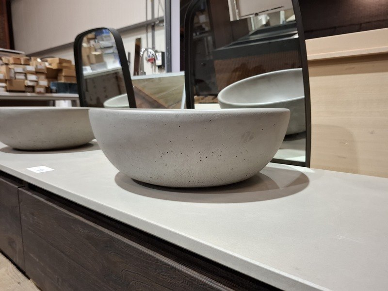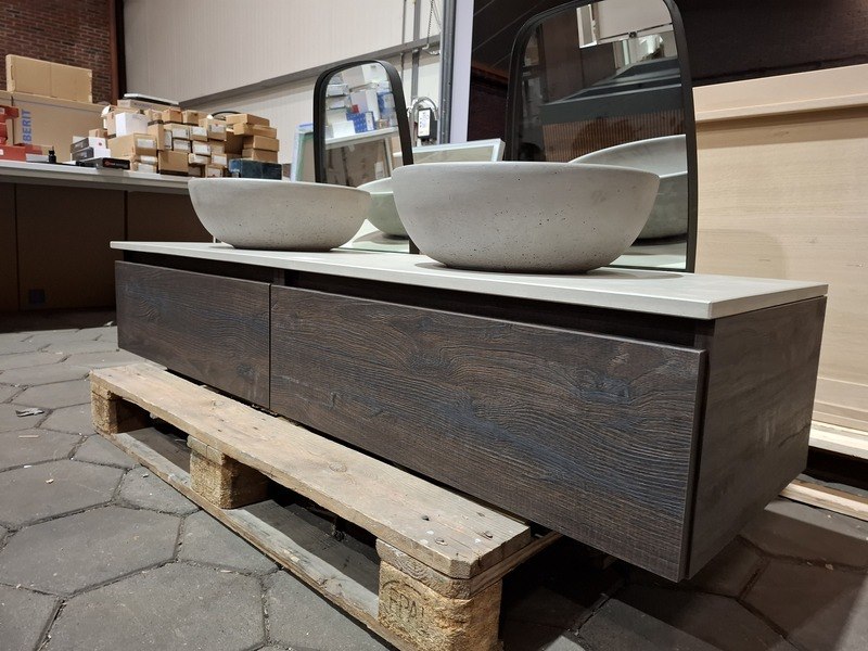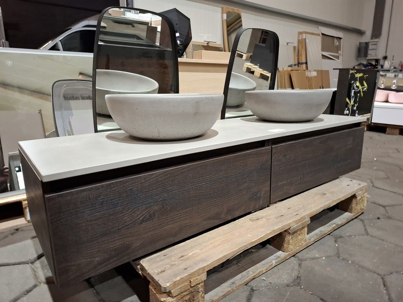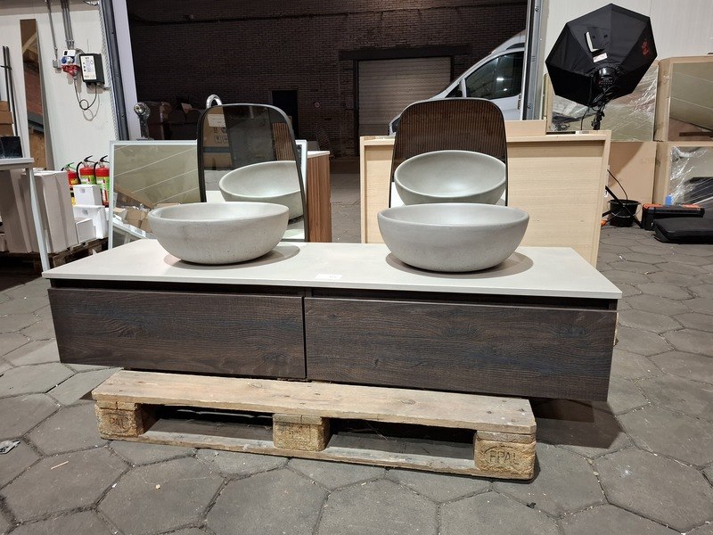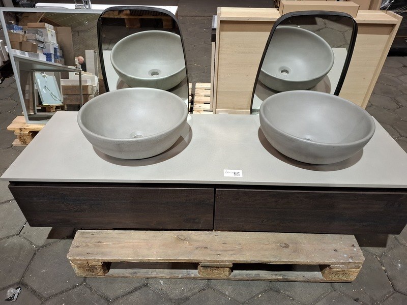Merk: Primabad Product: Badmeubel Afmeting: 160x50cm Specificaties: 2 lades met softclose, 8 ladeverdelers, divers, topblad, betongrijs, hardsteen, 2x waskom Ø43cm, 2x spiegel 80x40cm, LED verlichting rondom, spiegelverwarming