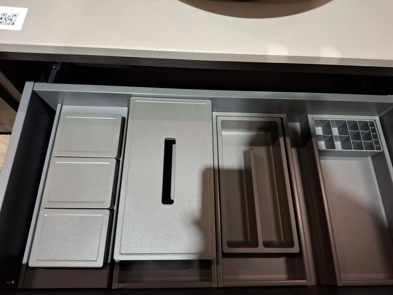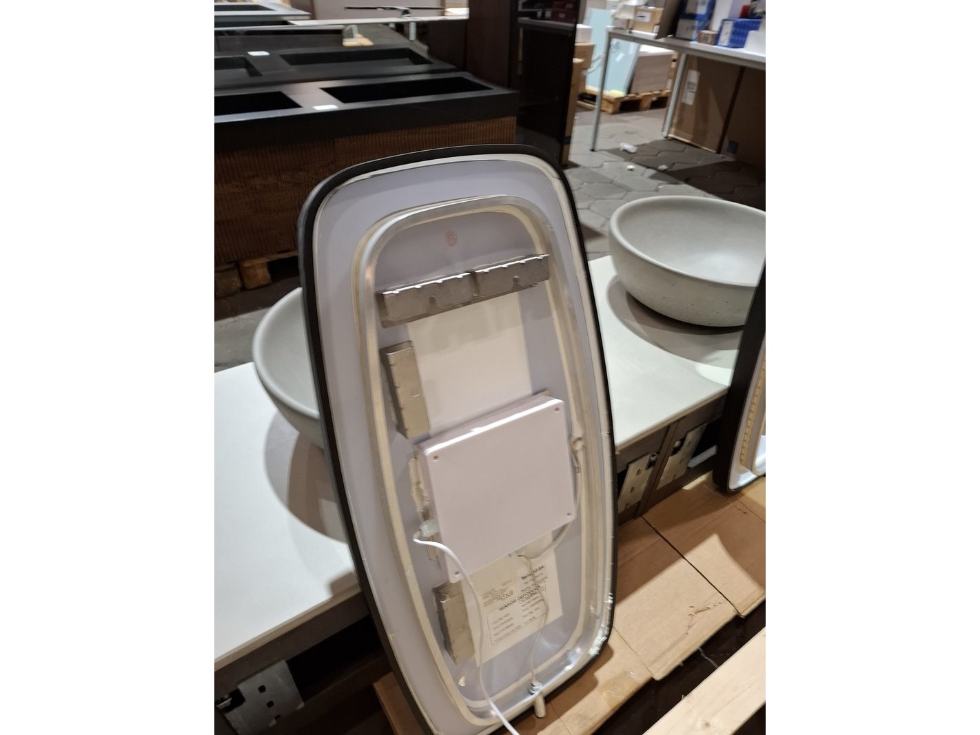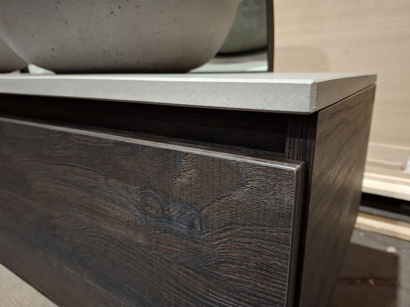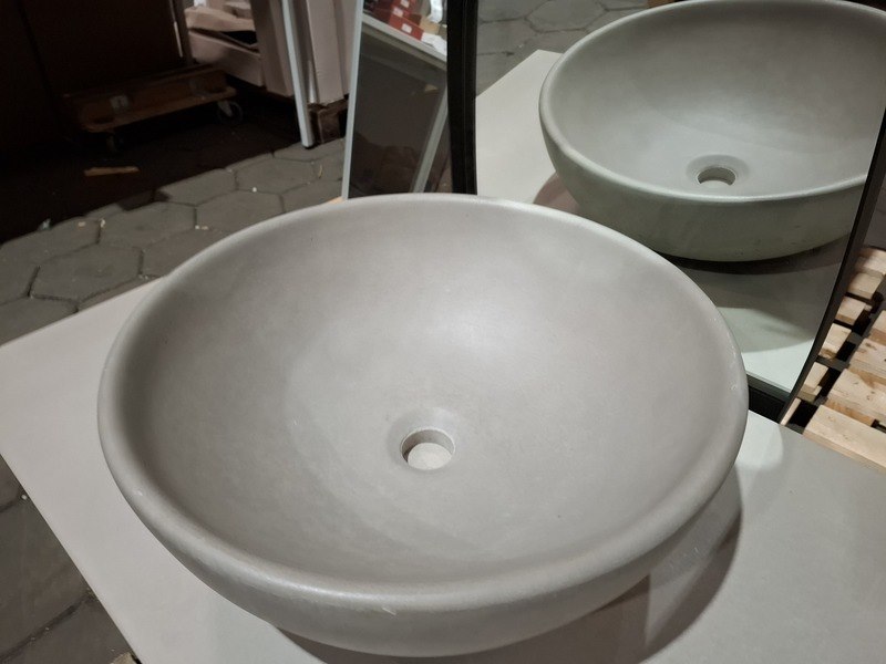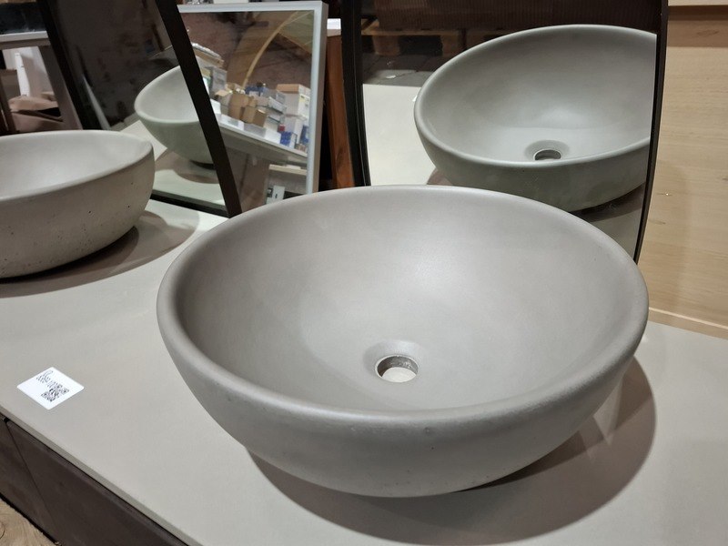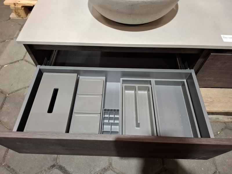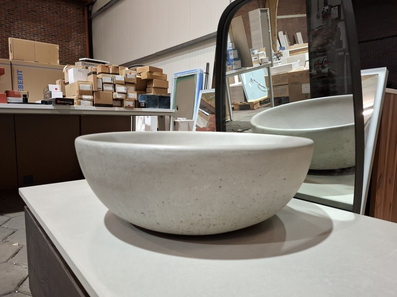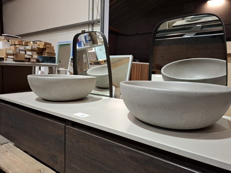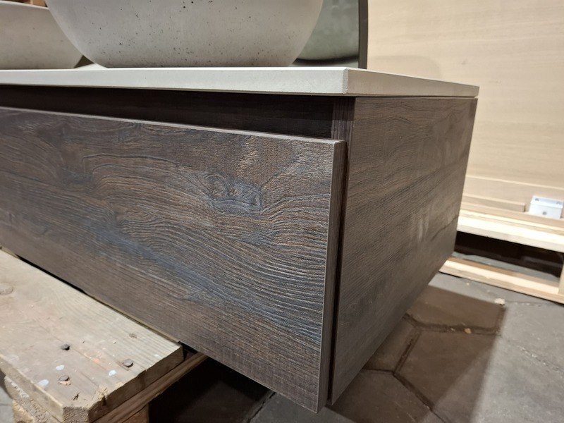 Merk: Primabad Product: Badmeubel Afmeting: 160x50cm Specificaties: 2 lades met softclose, 8 ladeverdelers, divers, topblad, betongrijs, hardsteen, 2x waskom Ø43cm, 2x spiegel 80x40cm, LED verlichting rondom, spiegelverwarming
