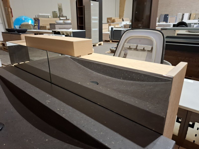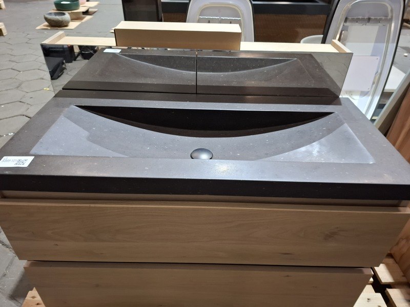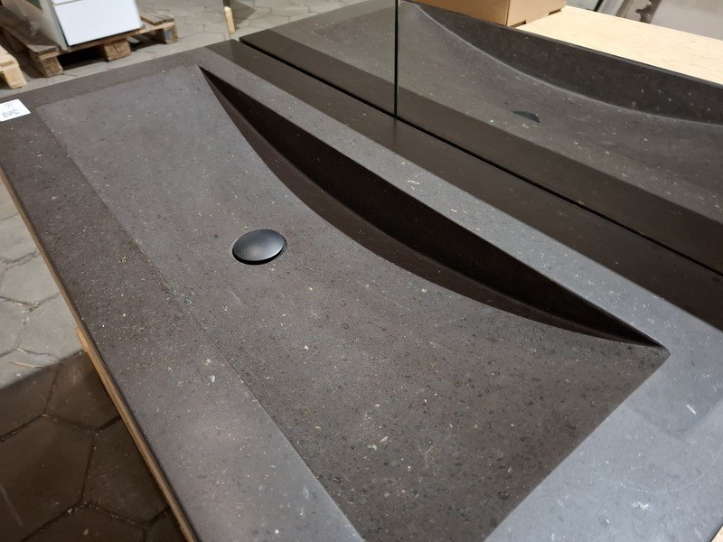 Merk: Solution 100 Product: Badmeubel Kleur: smoked oak Materiaal: massief eiken Afmeting: 100x45cm Specificaties: wastafel, corestone, zwart, waste, matzwart, spiegelkast, Plain 100, smoked oak, 2 deurtjes met softclose, spiegelkast verlichting