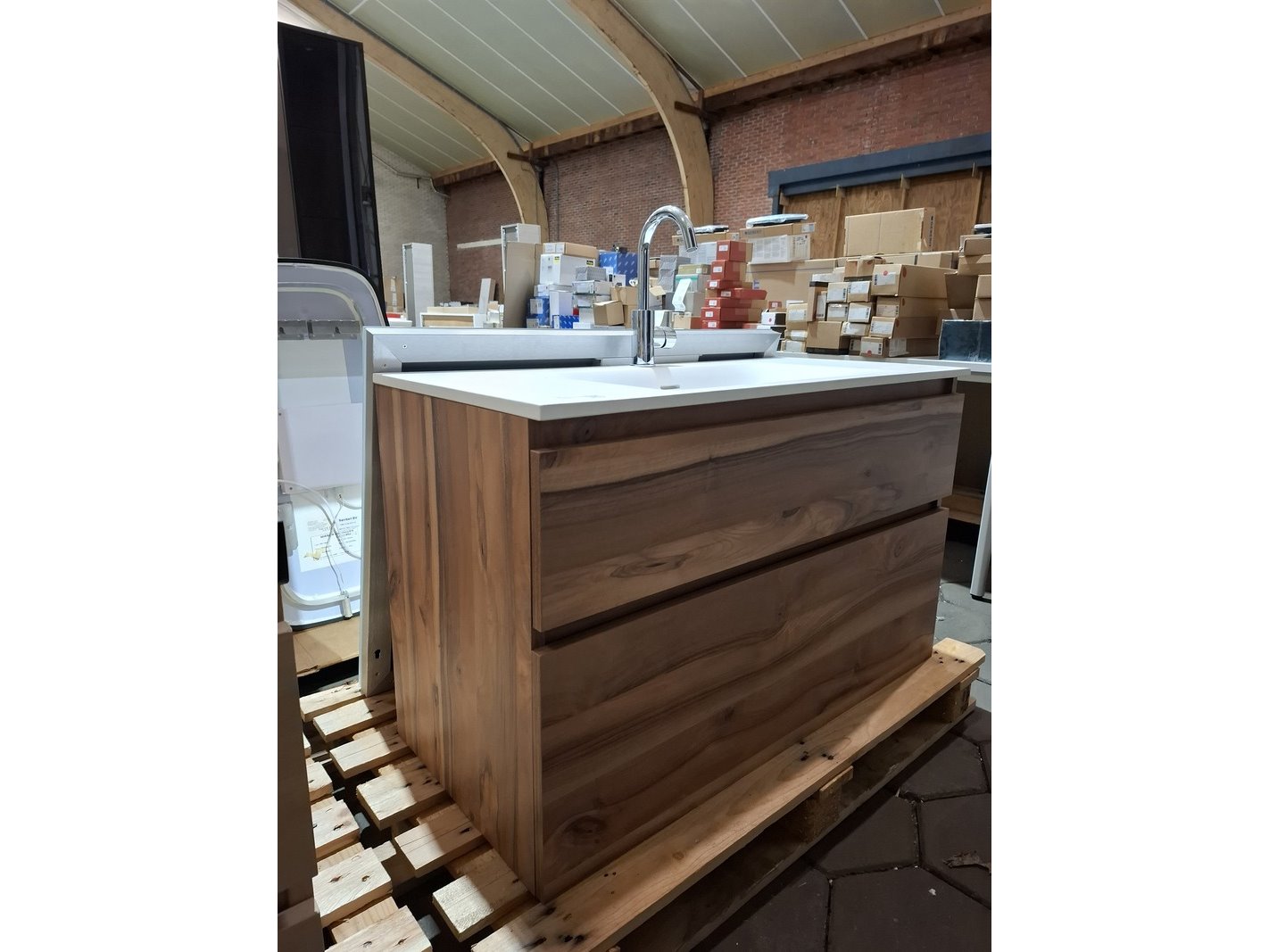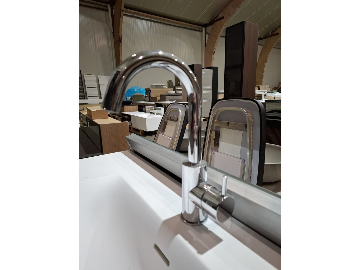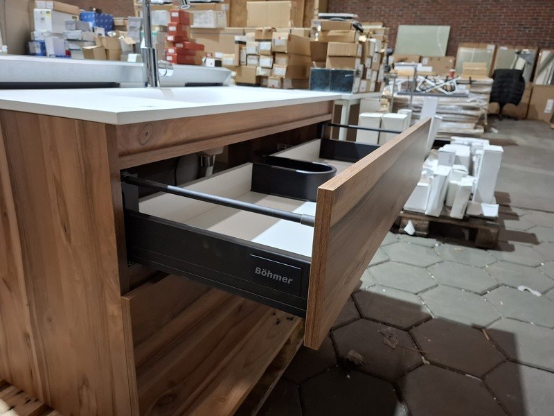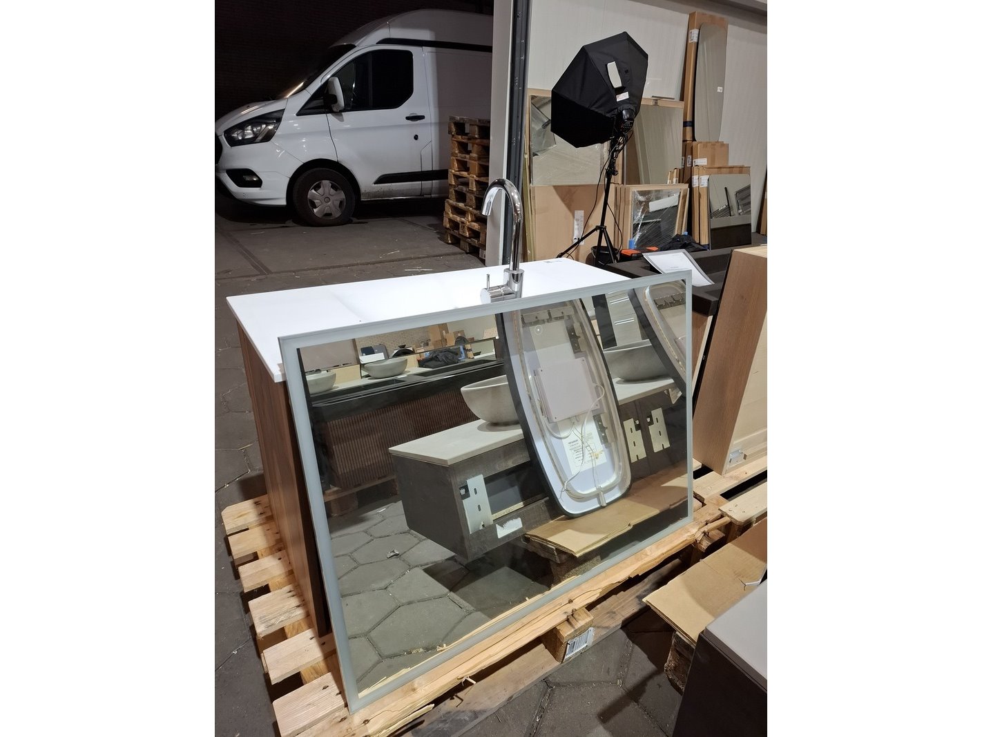 Merk: Böhmer Advance Product: Badmeubel Kleur: almond Afmeting: 100x46cm Specificaties: 2 lades met softclose, wastafel, solid surface, mat wit, wastafelkraan, Hotbath, met draaibare uitloop, chroom, click waste, mat wit, spiegel, LED verlichting rondom