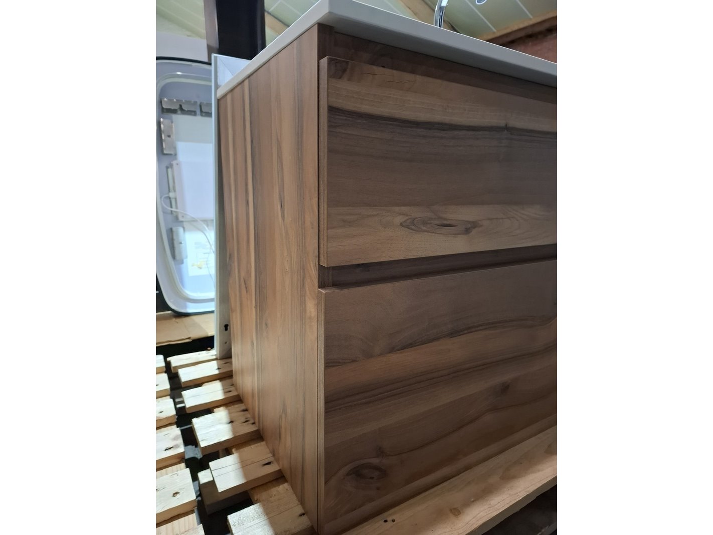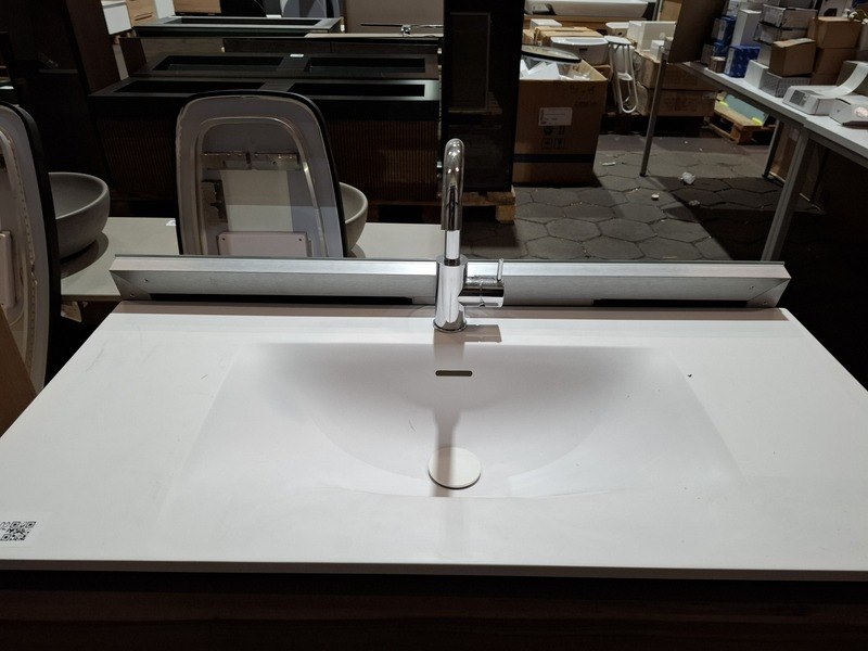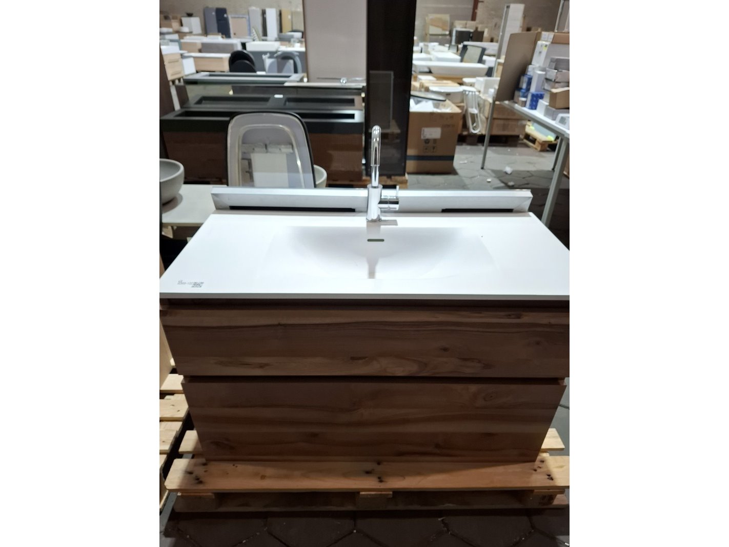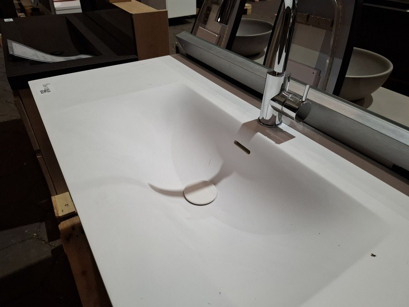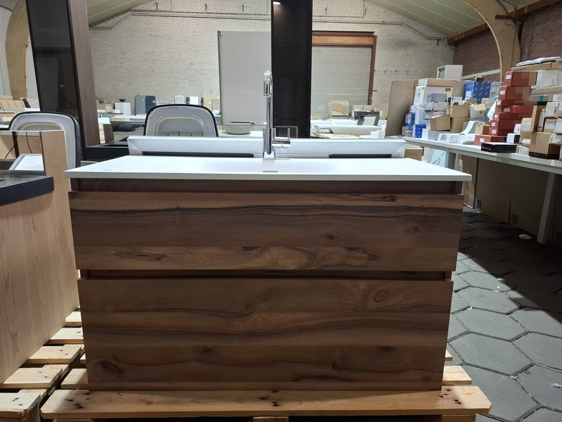 Merk: Böhmer Advance Product: Badmeubel Kleur: almond Afmeting: 100x46cm Specificaties: 2 lades met softclose, wastafel, solid surface, mat wit, wastafelkraan, Hotbath, met draaibare uitloop, chroom, click waste, mat wit, spiegel, LED verlichting rondom