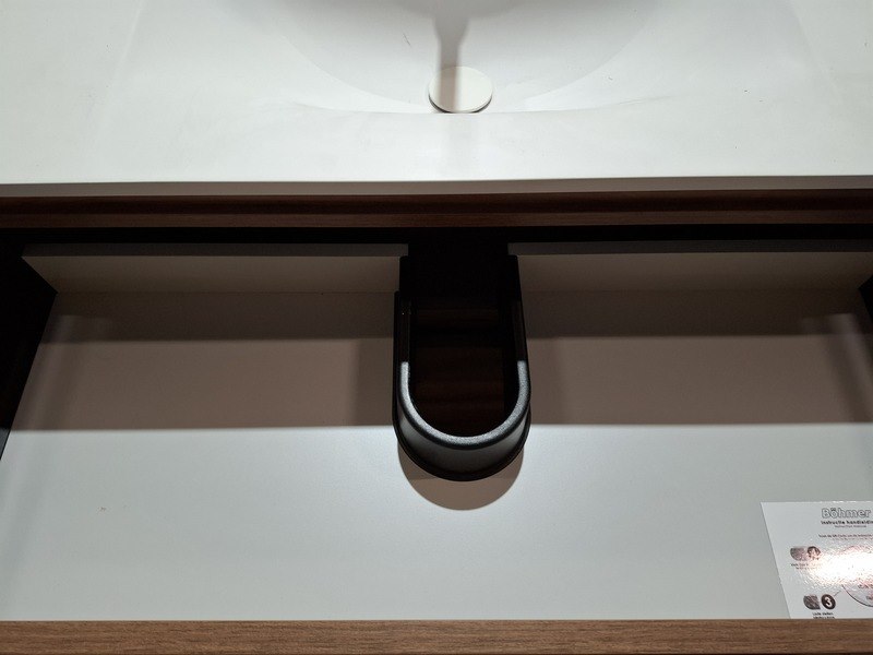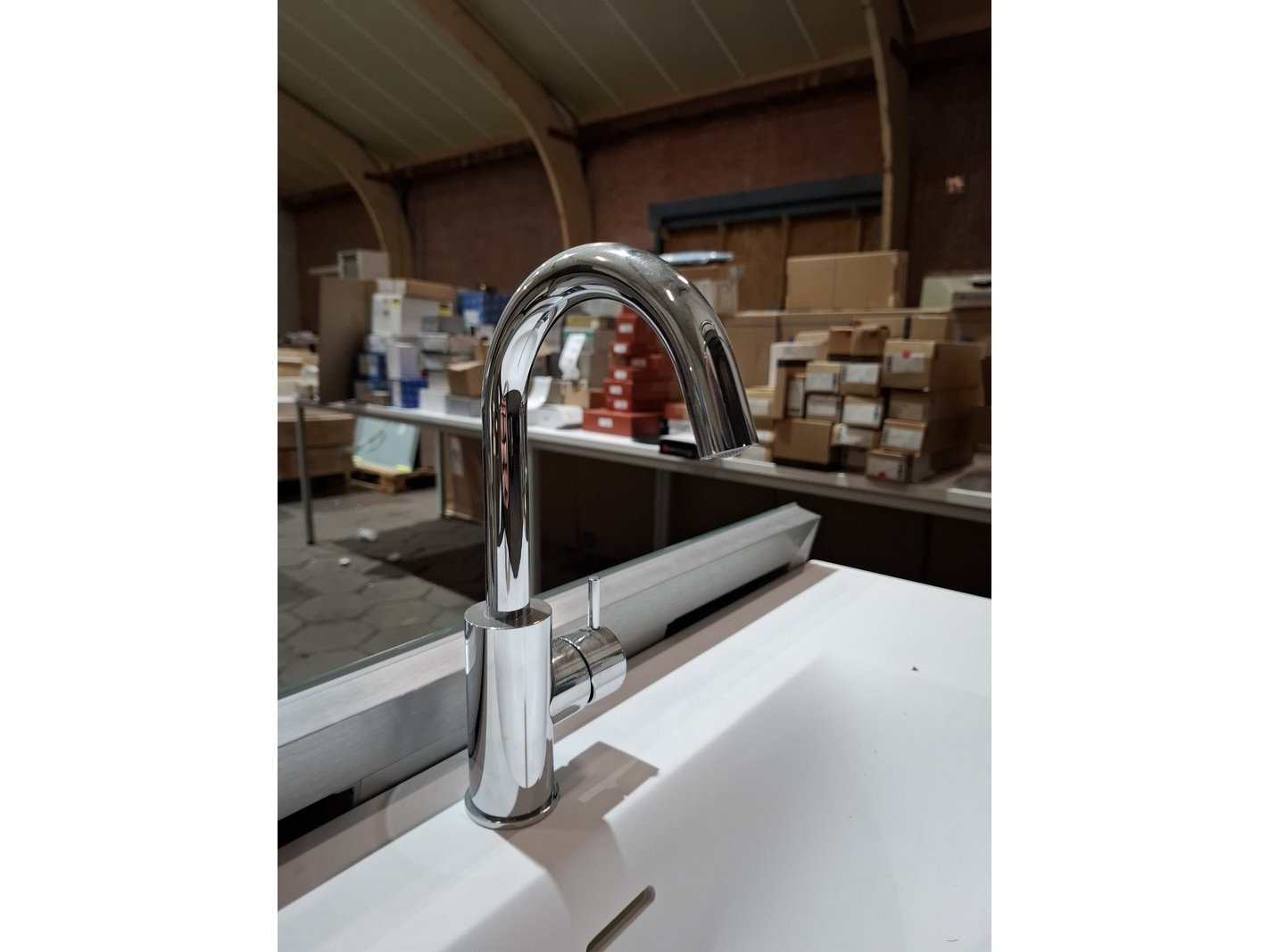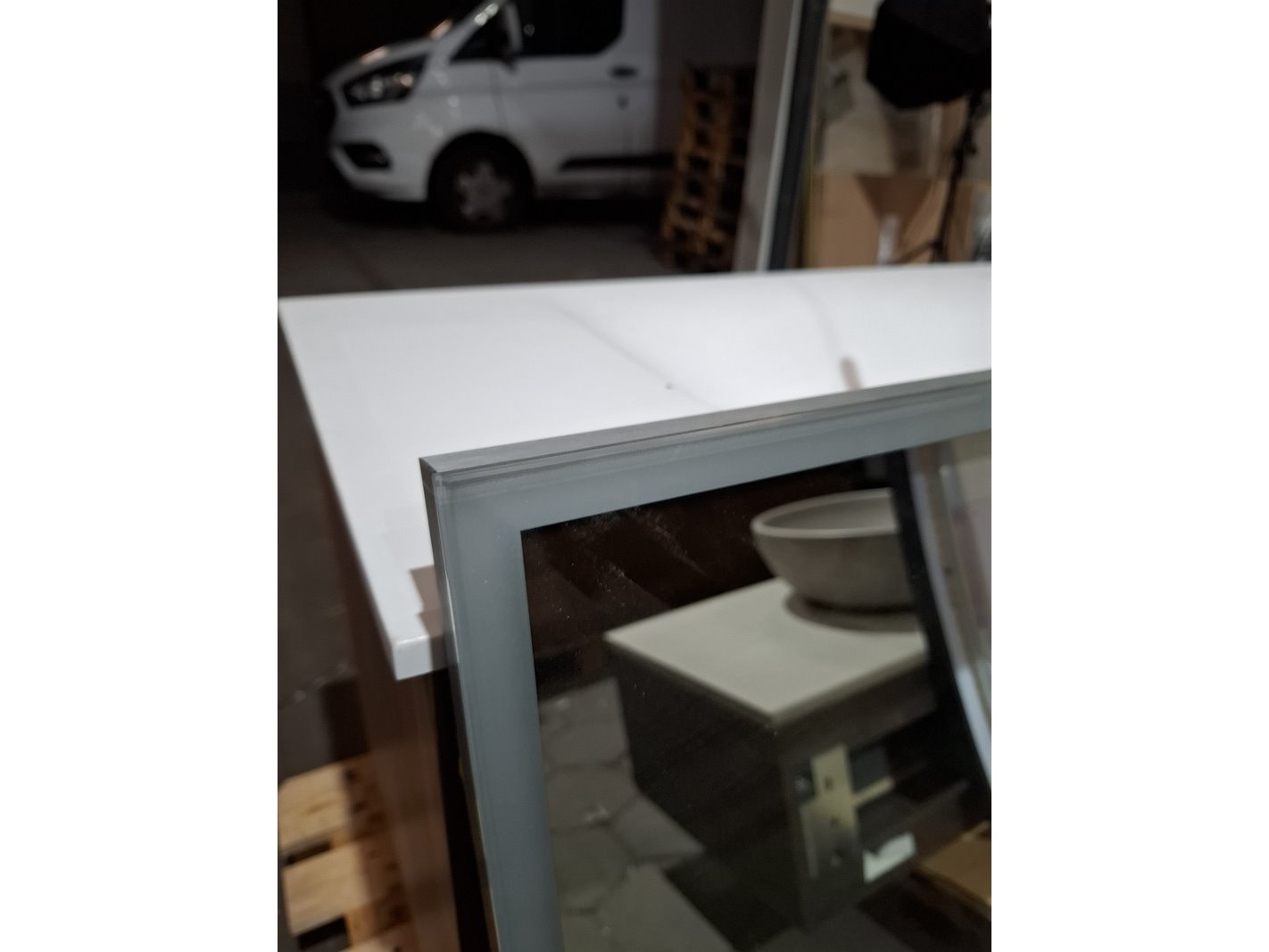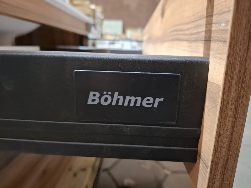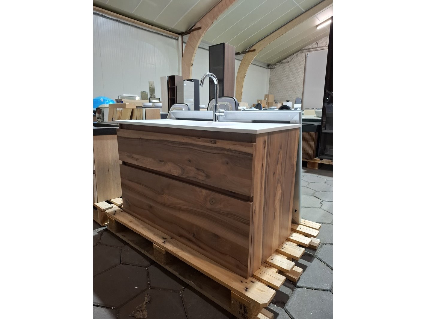 Merk: Böhmer Advance Product: Badmeubel Kleur: almond Afmeting: 100x46cm Specificaties: 2 lades met softclose, wastafel, solid surface, mat wit, wastafelkraan, Hotbath, met draaibare uitloop, chroom, click waste, mat wit, spiegel, LED verlichting rondom