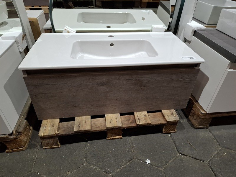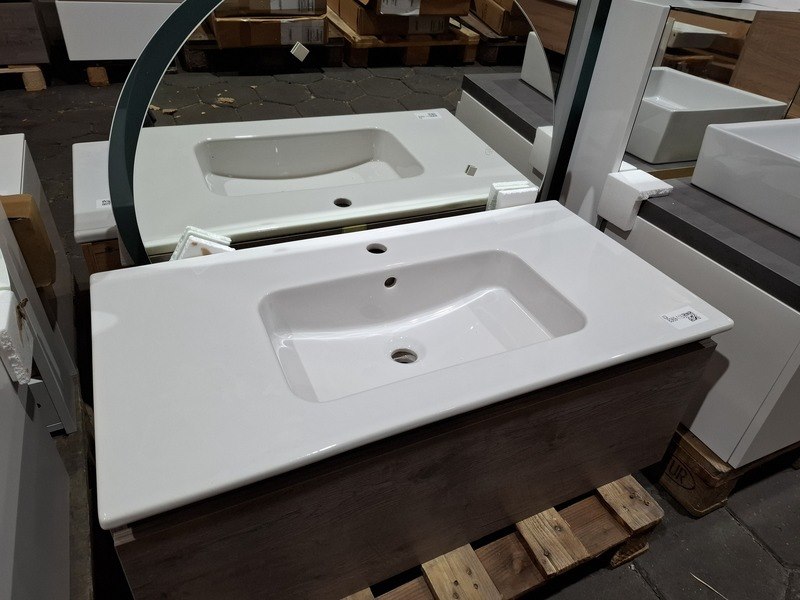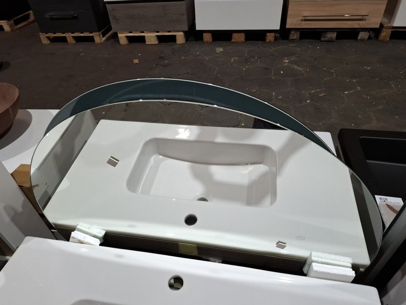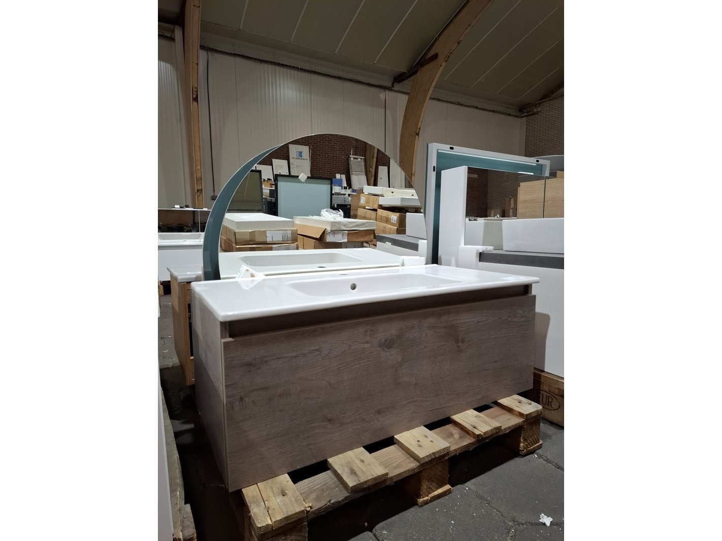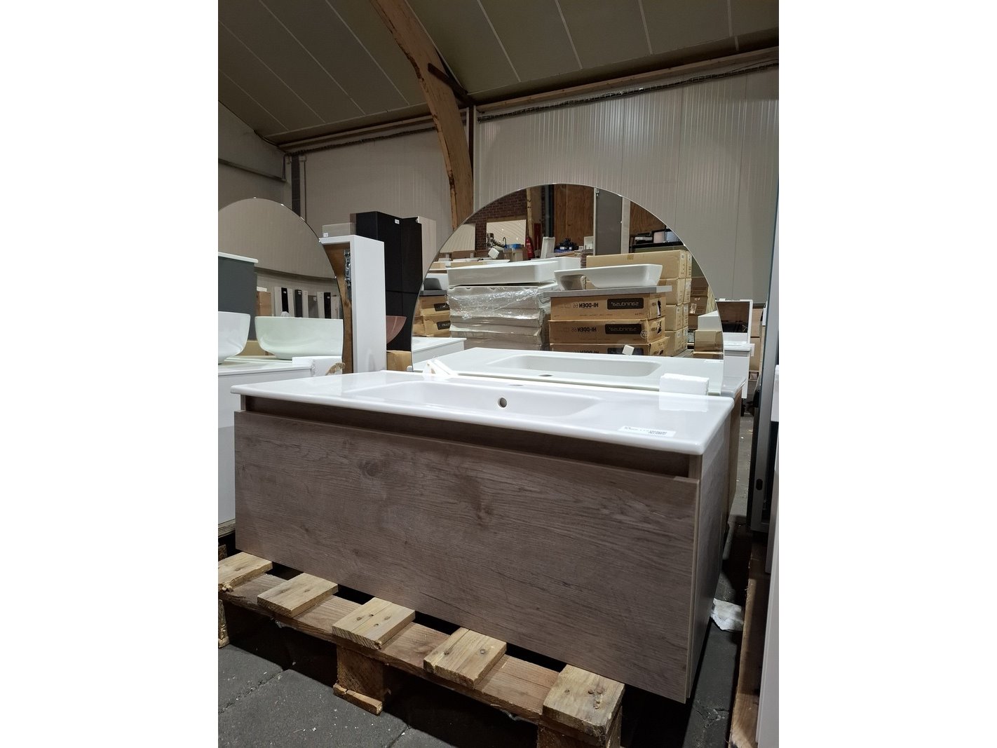 Product: Badmeubel Kleur: Lancelot grijs Afmeting: 90x46cm Specificaties: 1 lade met softclose, met Blum geleidesysteem, keramische wastafel, glans wit, spiegel Ø80cm, LED verlichting rondom, spiegelverwarming, sensorbediening, dimbaar