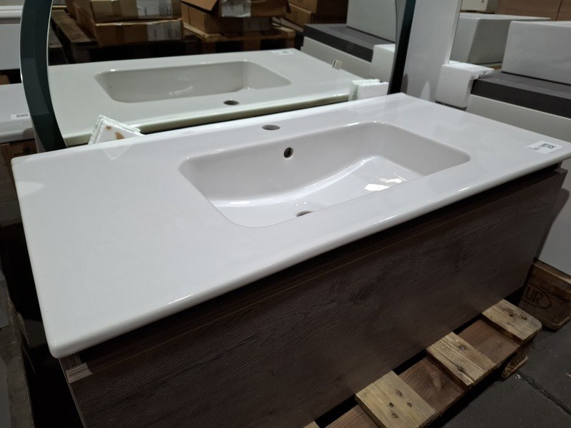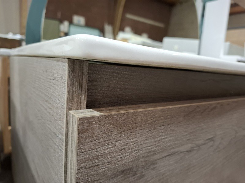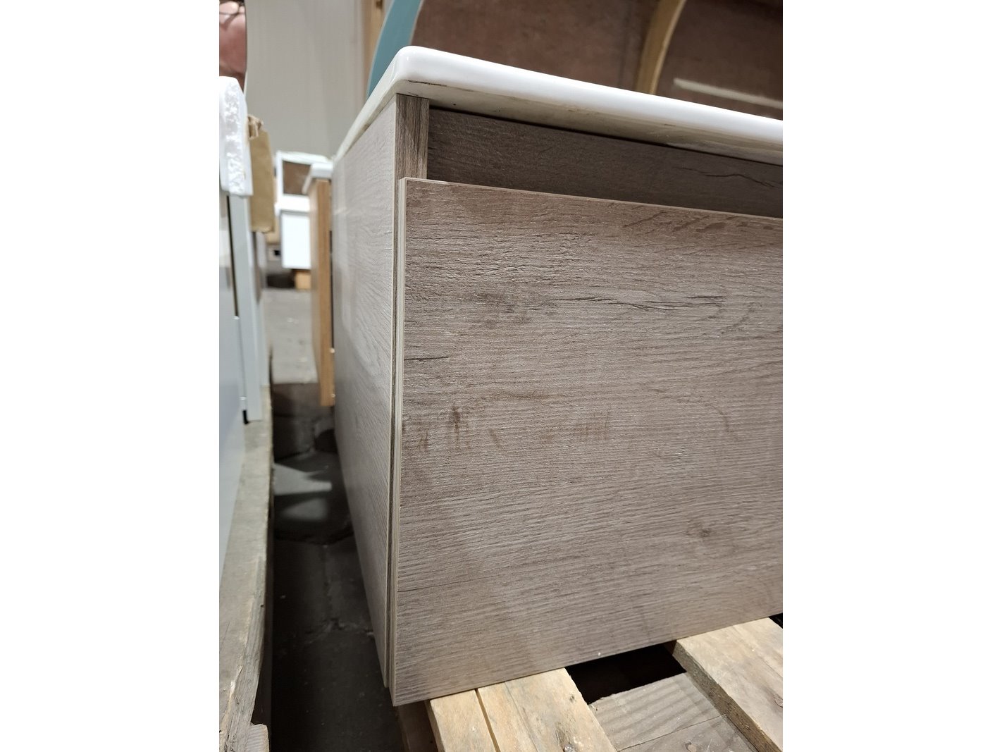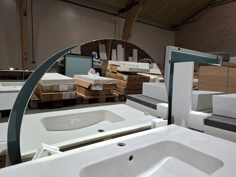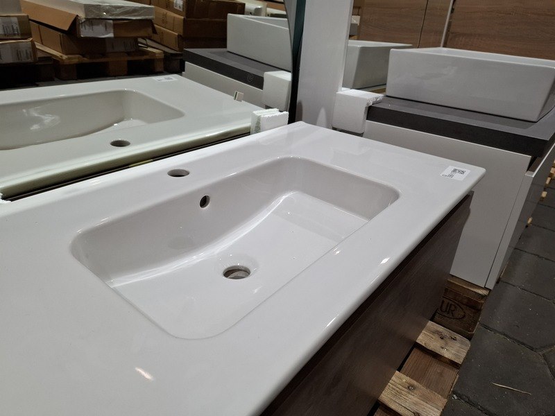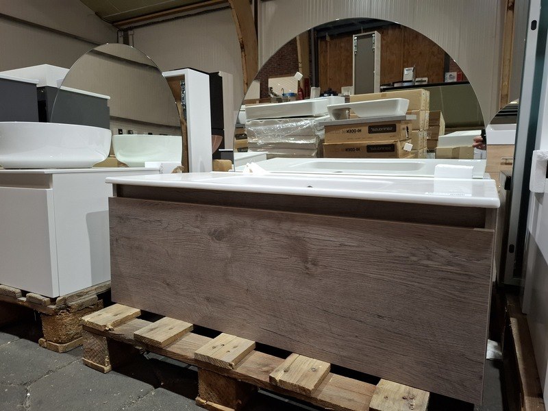 Product: Badmeubel Kleur: Lancelot grijs Afmeting: 90x46cm Specificaties: 1 lade met softclose, met Blum geleidesysteem, keramische wastafel, glans wit, spiegel Ø80cm, LED verlichting rondom, spiegelverwarming, sensorbediening, dimbaar