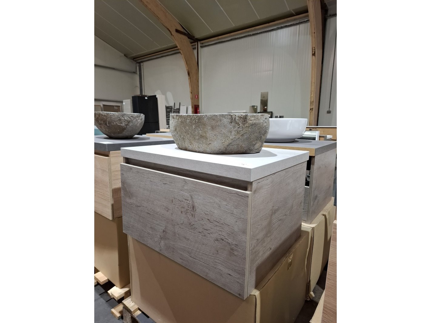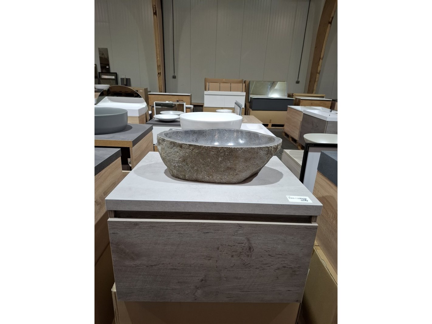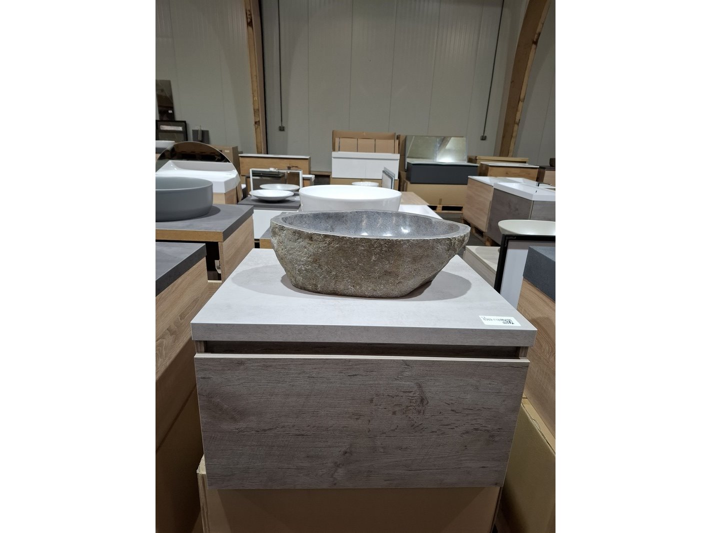 Product: Badmeubel Kleur: Lancelot grijs Afmeting: 65x50cm Specificaties: 1 lade met softclose, met Blum geleidesysteem, topblad, betongrijs, Riverstone waskom, grey