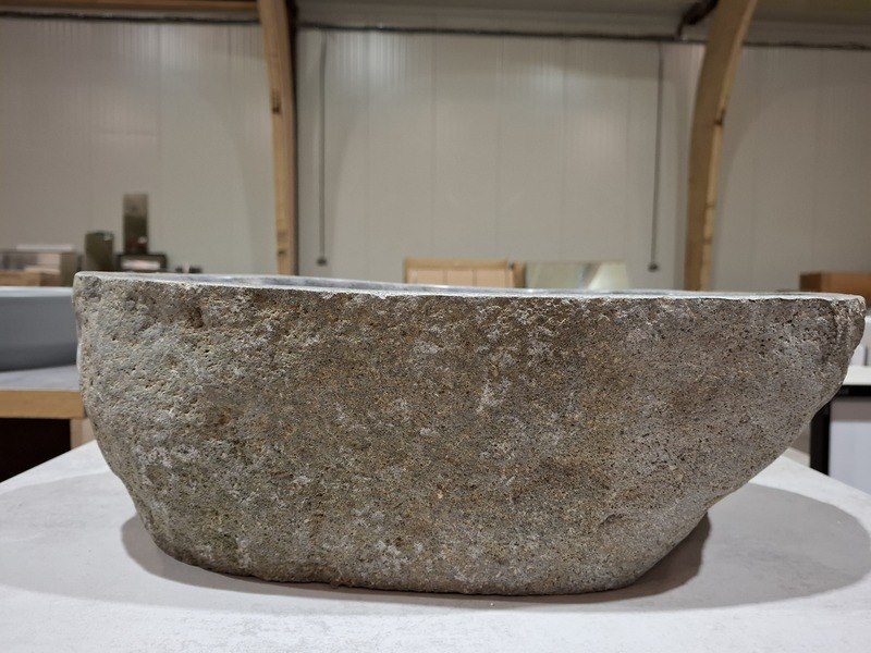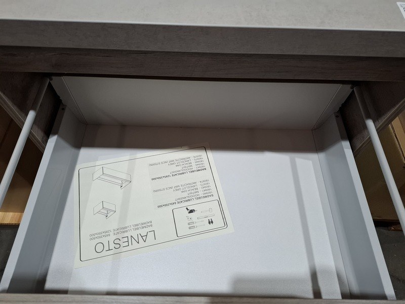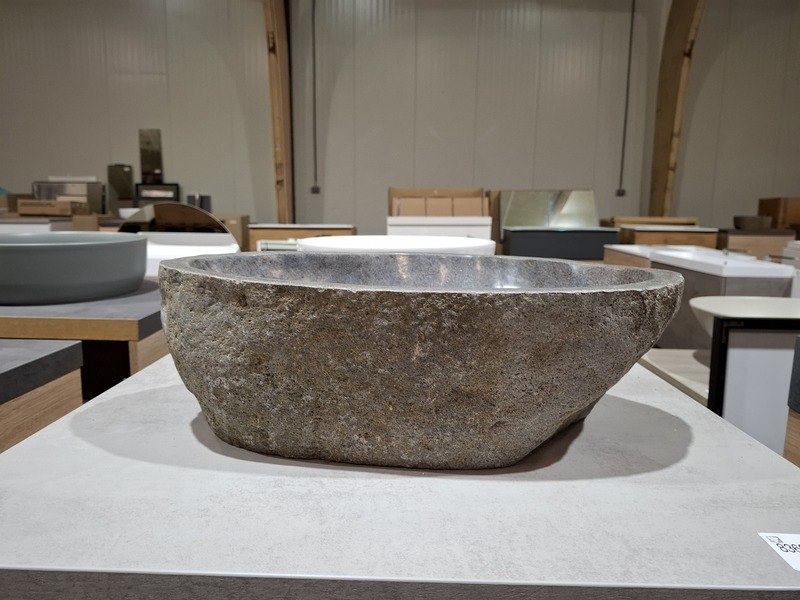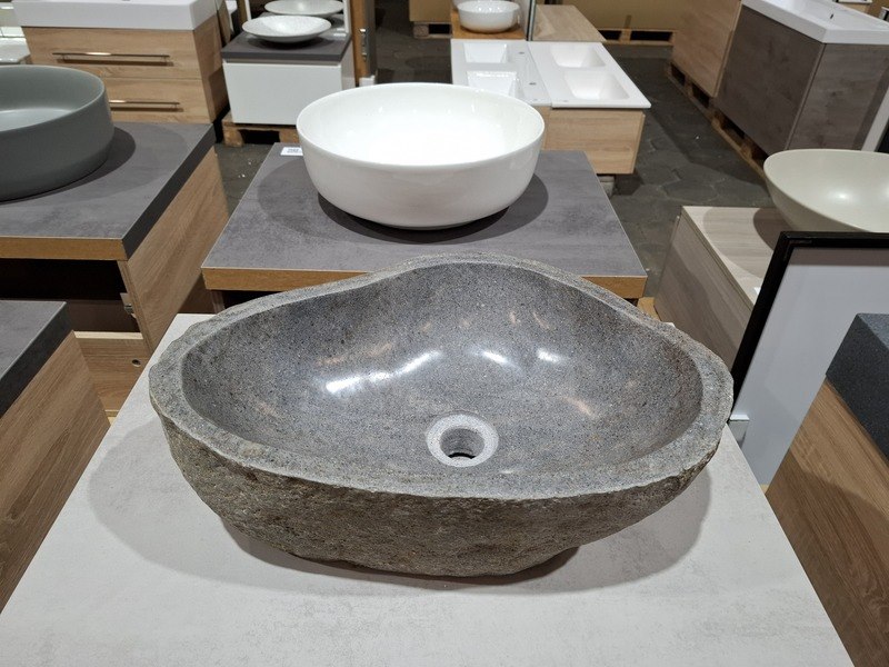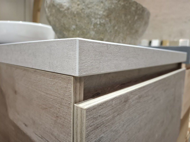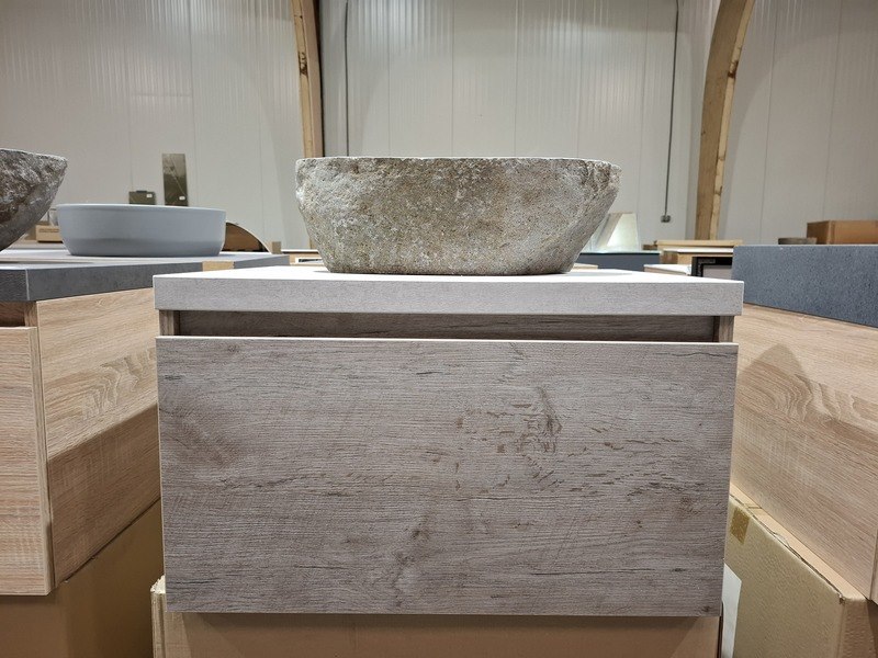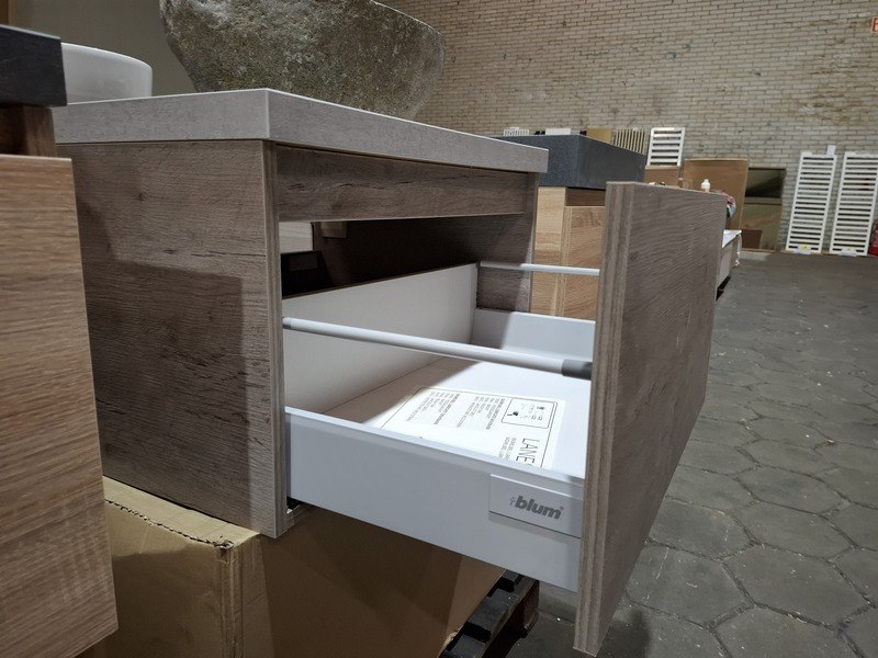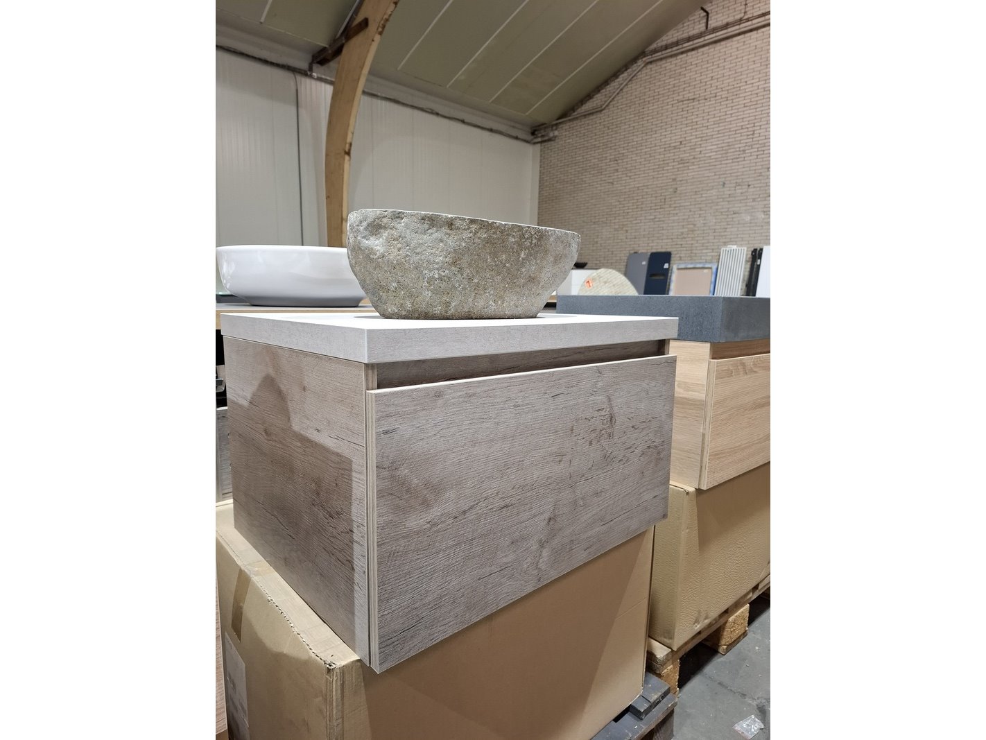 Product: Badmeubel Kleur: Lancelot grijs Afmeting: 65x50cm Specificaties: 1 lade met softclose, met Blum geleidesysteem, topblad, betongrijs, Riverstone waskom, grey
