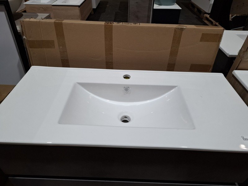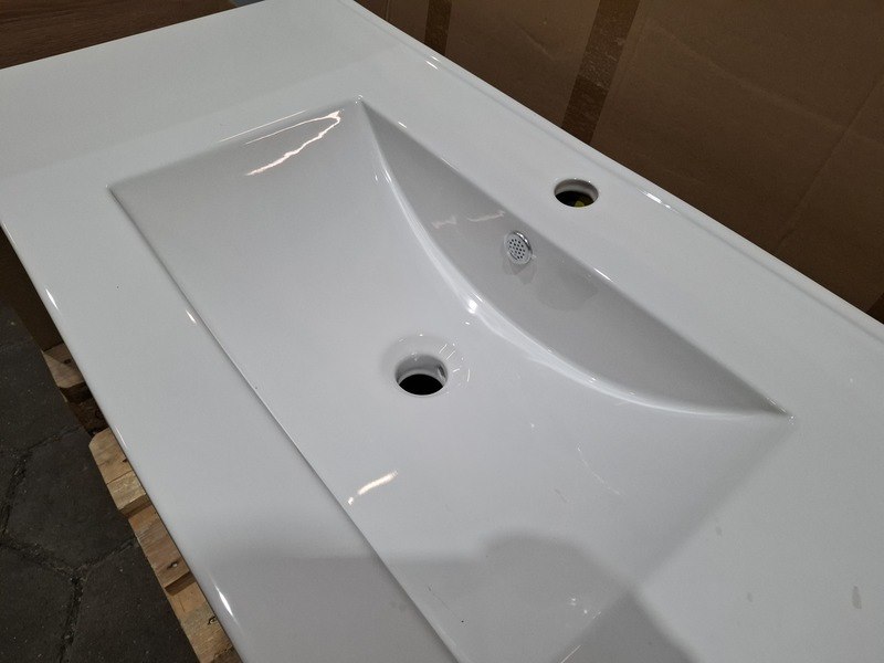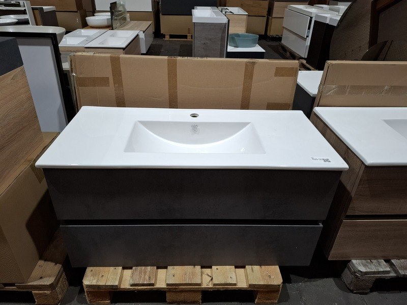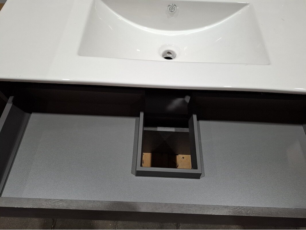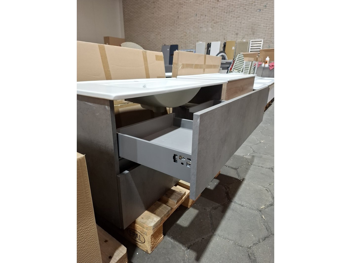 Merk: HR badmeubelen Product: Badmeubel Kleur: beton antraciet Afmeting: 100x46cm Specificaties: 2 lades met softclose, met Blum geleidesysteem, keramische wastafel, glans wit, spiegel Ø80cm, LED verlichting rondom, spiegelverwarming, sensorbediening, dimbaar