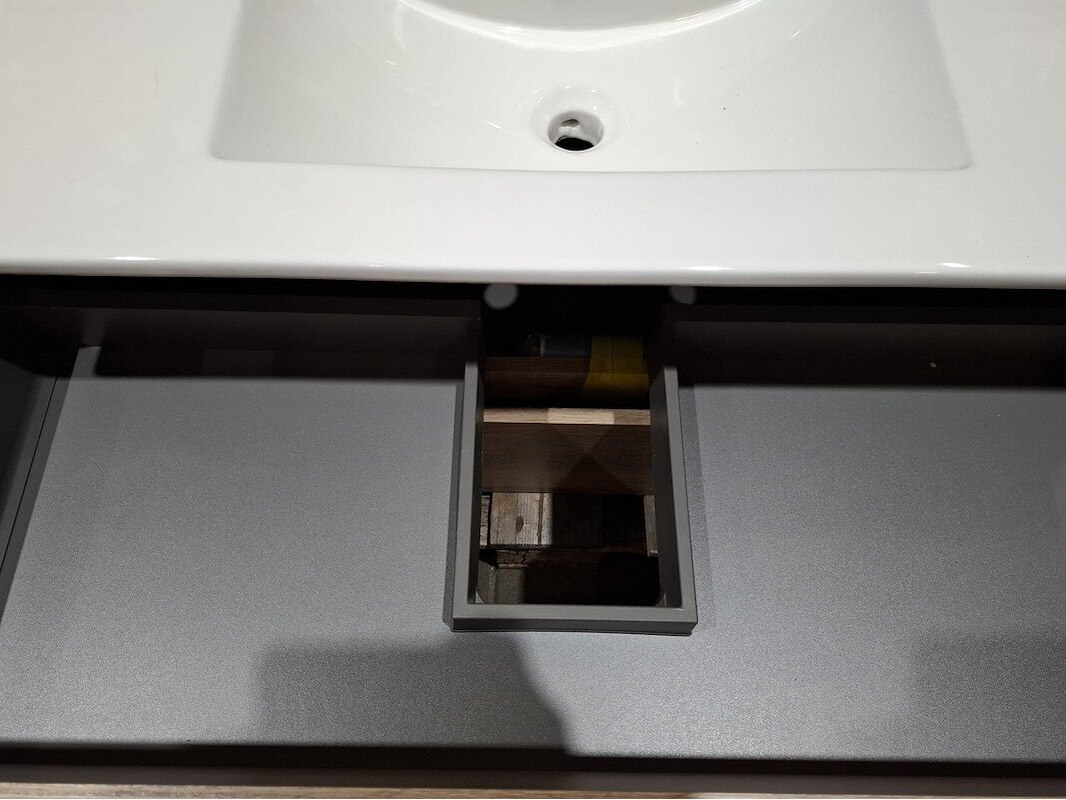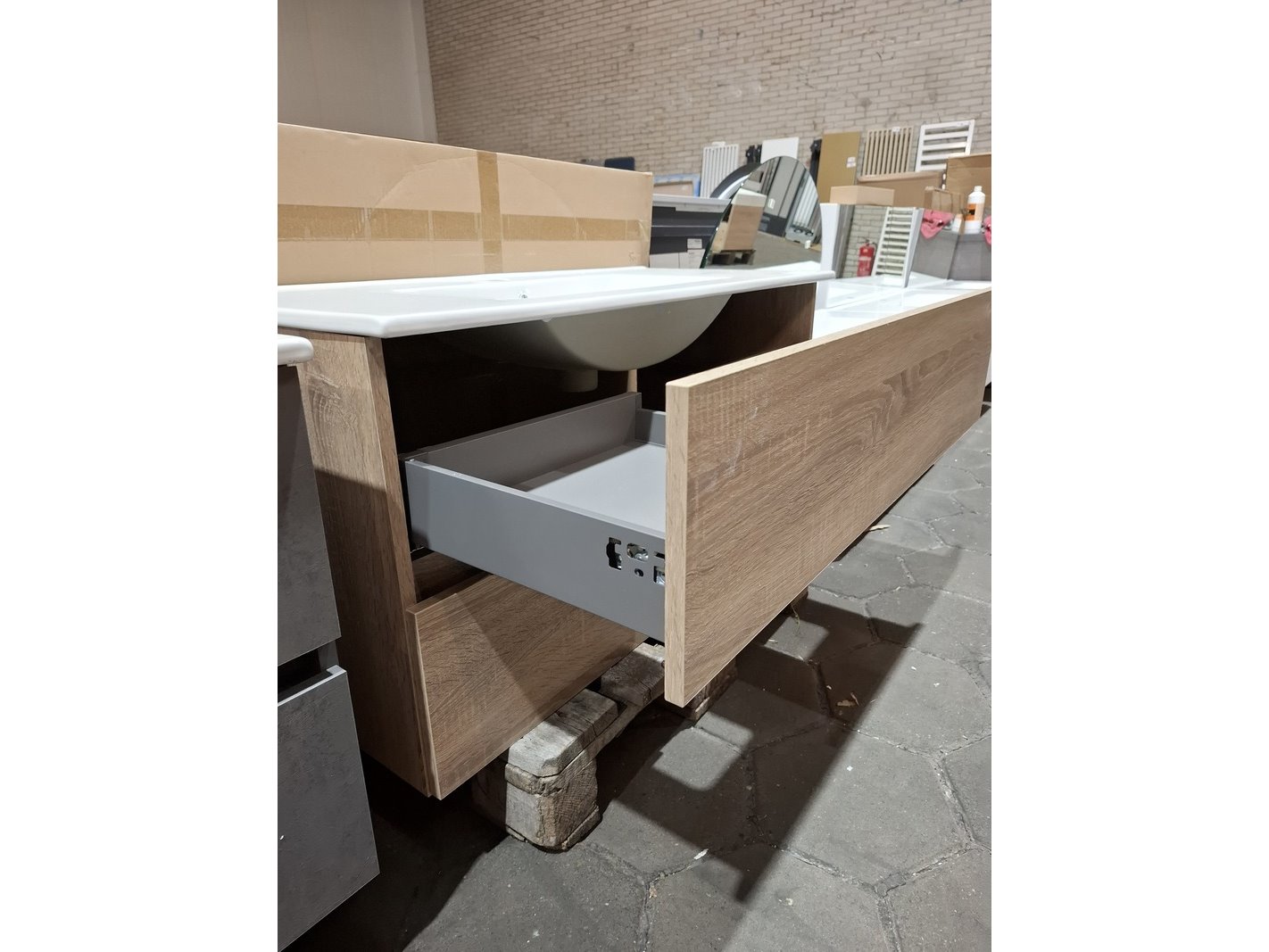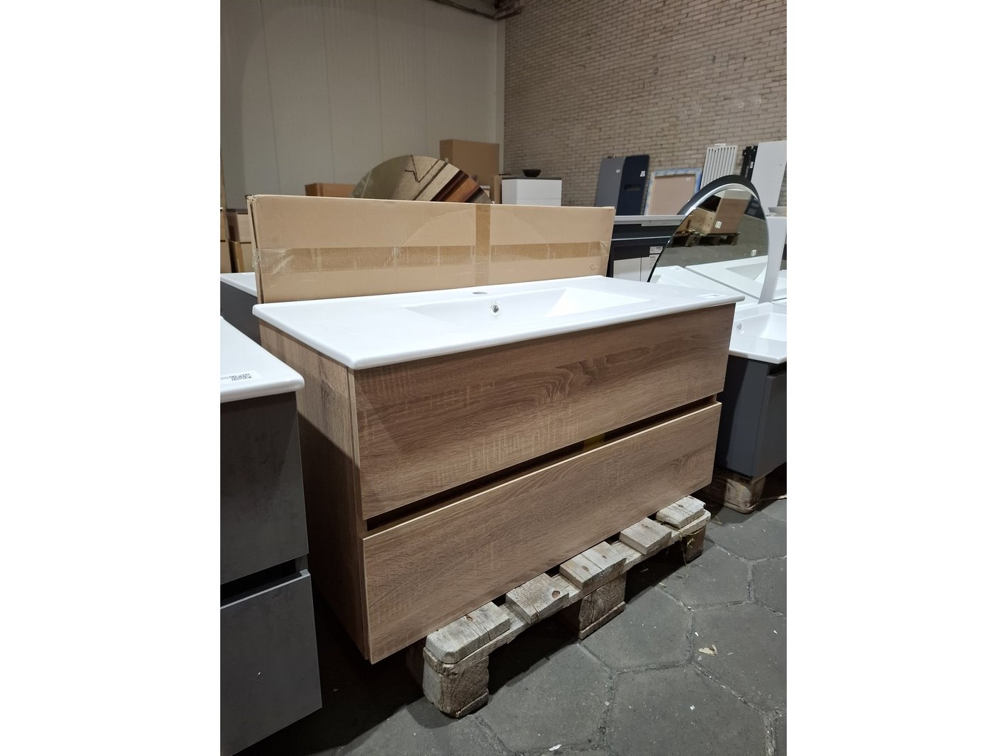 Merk: HR badmeubelen Product: Badmeubel Kleur: grijs eiken Afmeting: 100x46cm Specificaties: 2 lades met softclose, met Blum geleidesysteem, keramische wastafel, glans wit, spiegel 100x70cm, LED verlichting rondom, spiegelverwarming, sensorbediening, dimbaar