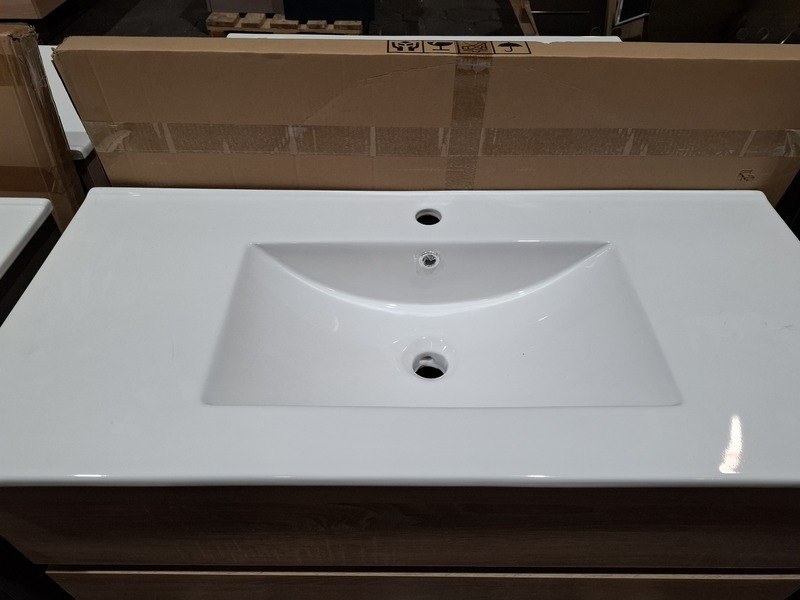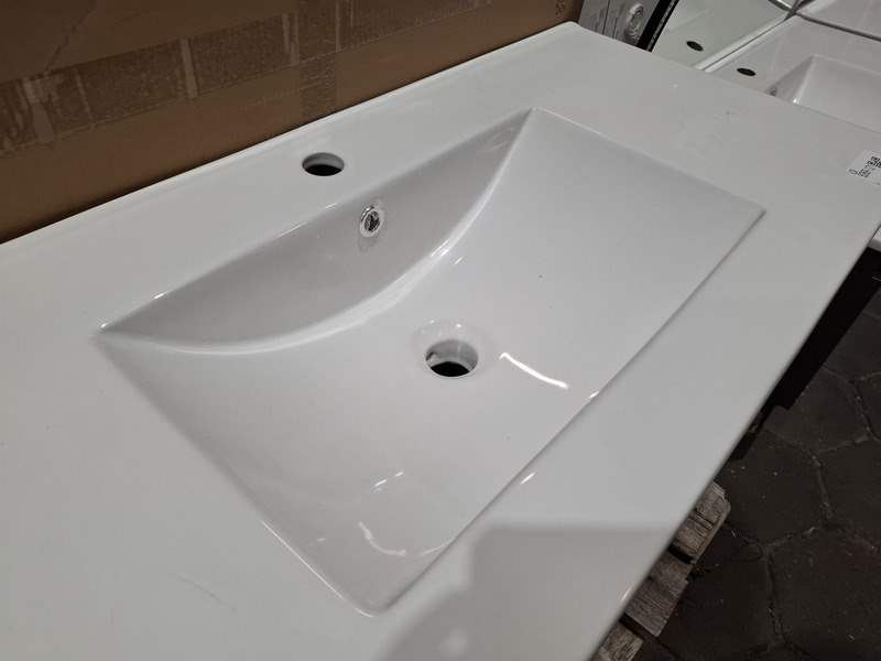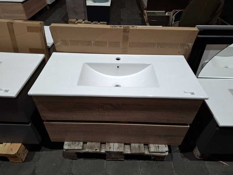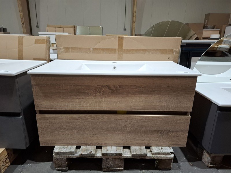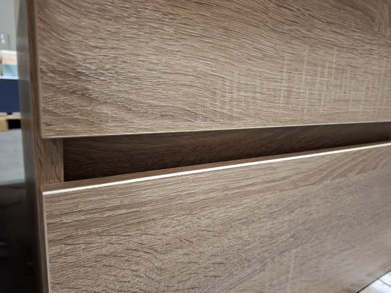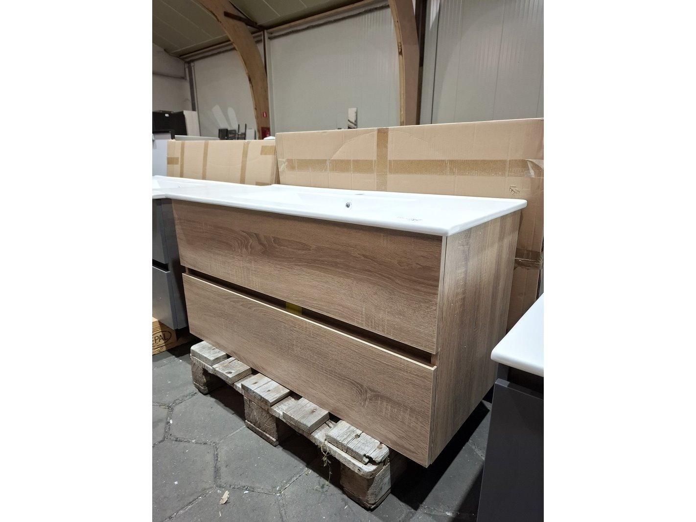 Merk: HR badmeubelen Product: Badmeubel Kleur: grijs eiken Afmeting: 100x46cm Specificaties: 2 lades met softclose, met Blum geleidesysteem, keramische wastafel, glans wit, spiegel 100x70cm, LED verlichting rondom, spiegelverwarming, sensorbediening, dimbaar