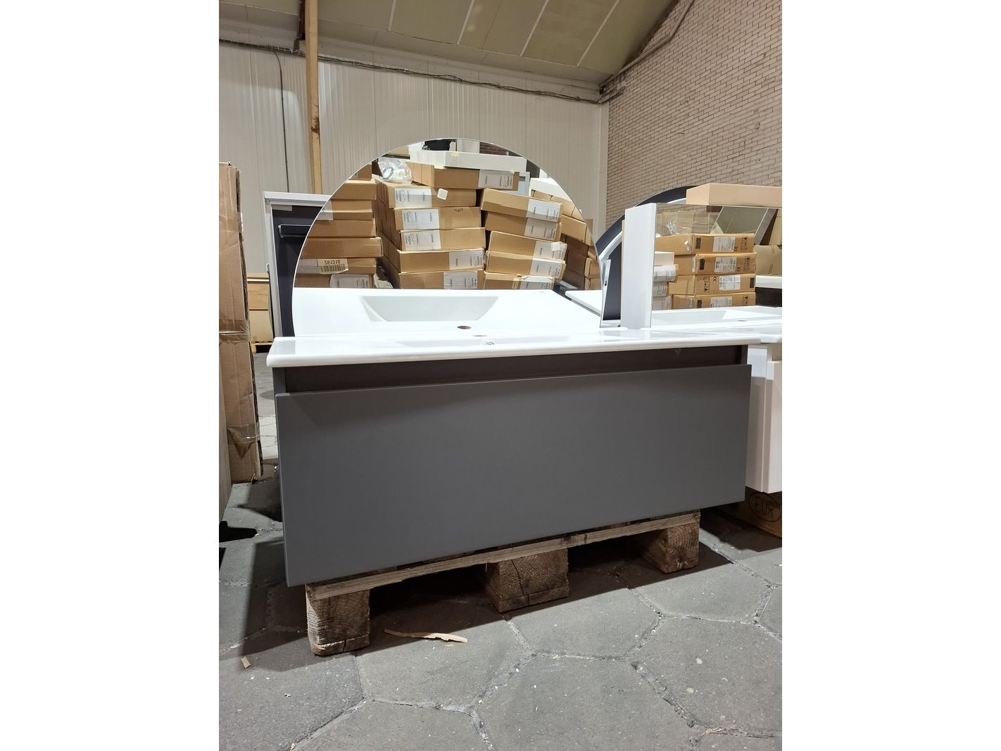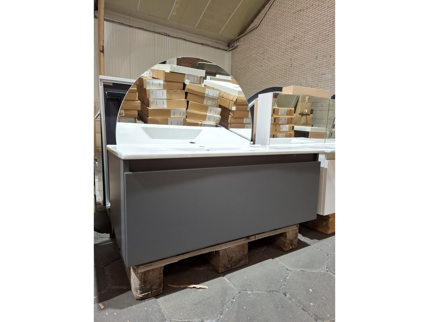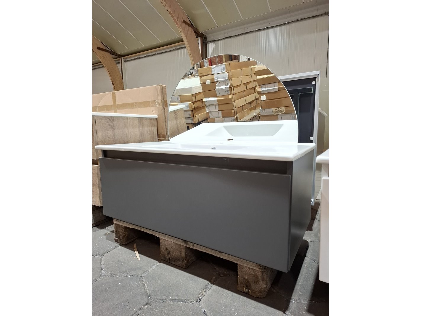 Product: Badmeubel Kleur: mat antraciet Afmeting: 90x46cm Specificaties: 1 lade met softclose, met Blum geleidesysteem, keramische wastafel, glans wit, spiegel Ø80cm, LED verlichting rondom, spiegelverwarming, sensorbediening, dimbaar