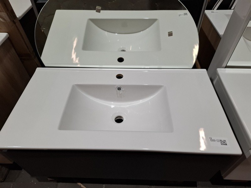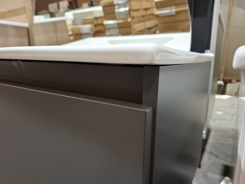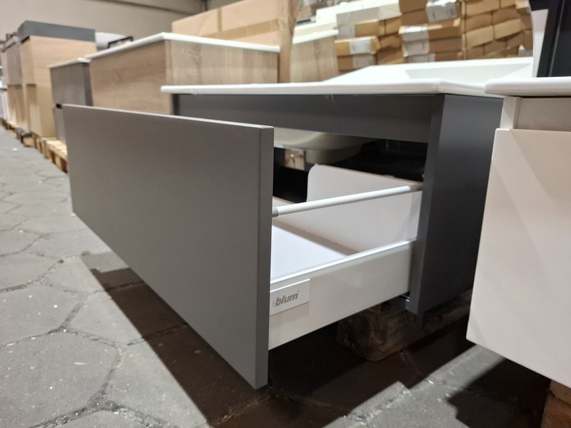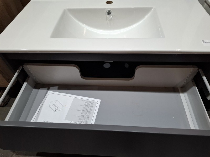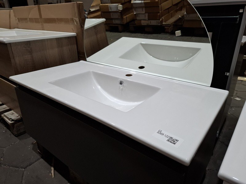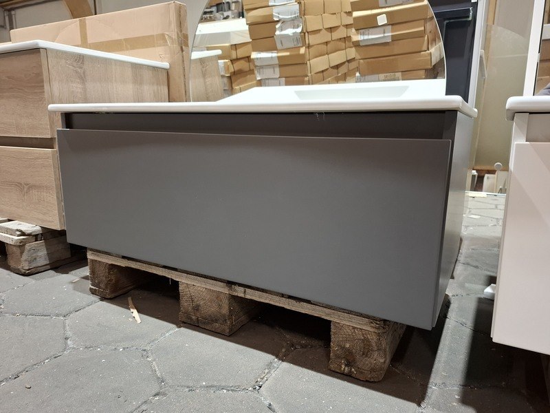 Product: Badmeubel Kleur: mat antraciet Afmeting: 90x46cm Specificaties: 1 lade met softclose, met Blum geleidesysteem, keramische wastafel, glans wit, spiegel Ø80cm, LED verlichting rondom, spiegelverwarming, sensorbediening, dimbaar