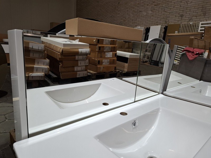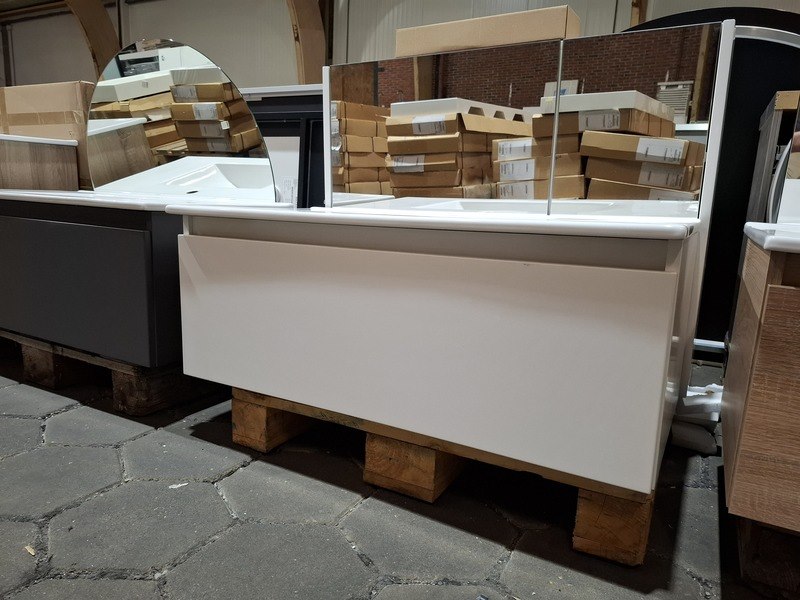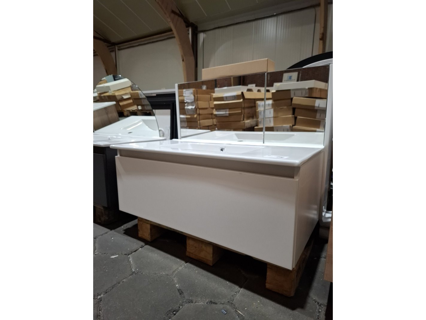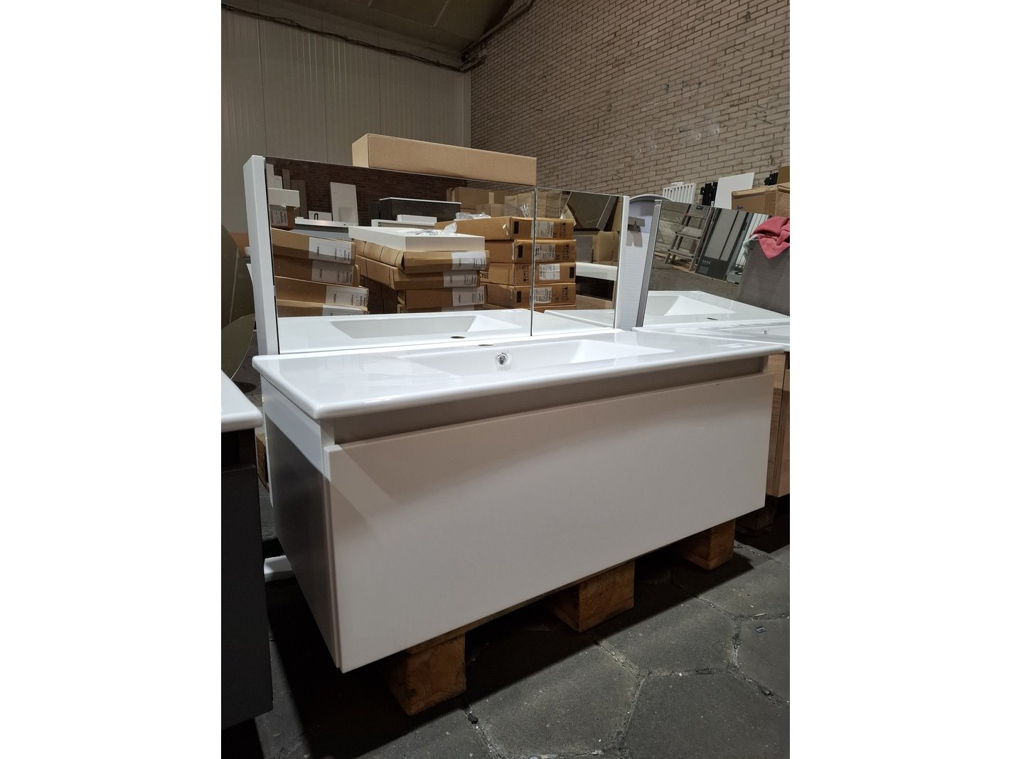 Product: Badmeubel Kleur: wit Afmeting: 90x46cm Specificaties: 1 lade met softclose, met Blum geleidesysteem, keramische wastafel, glans wit, spiegelkast 90cm, 2 deurtjes, dubbel spiegelend, spiegelverwarming