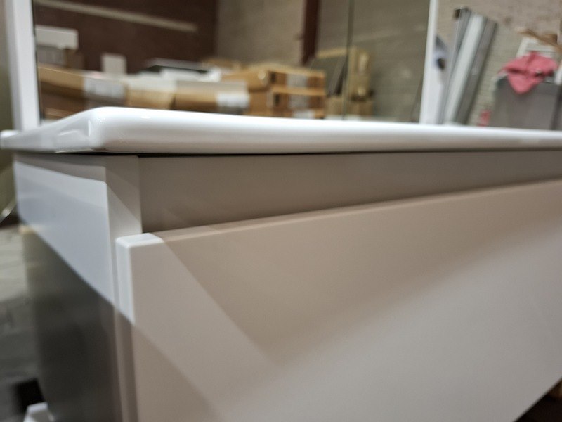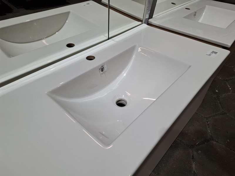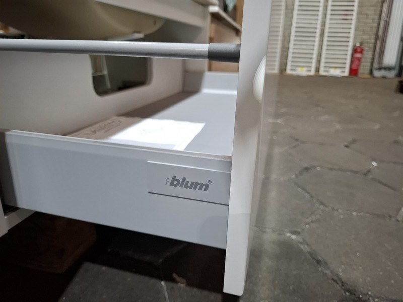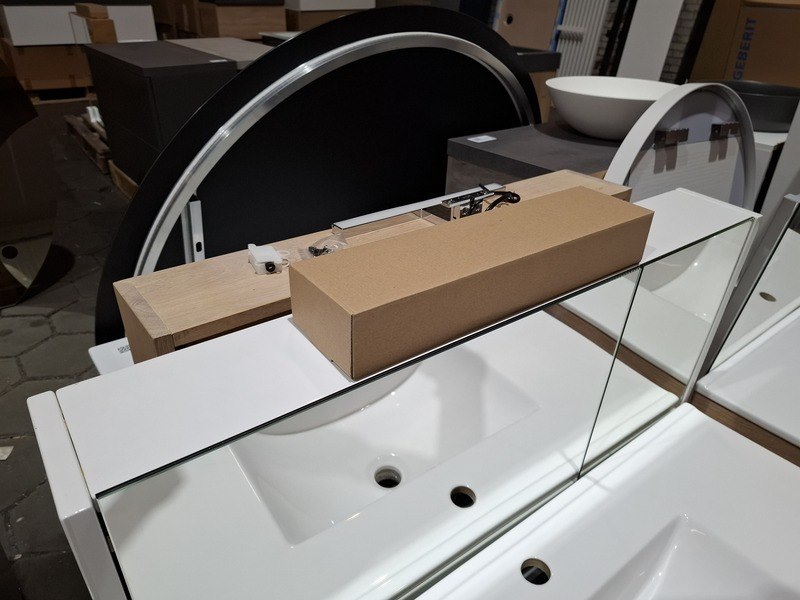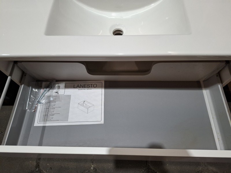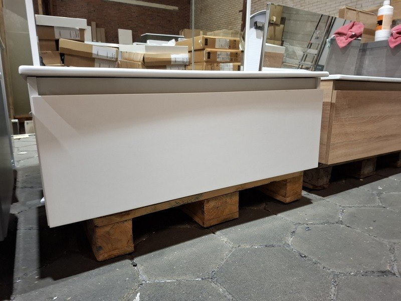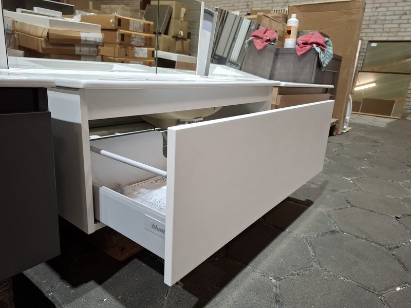 Product: Badmeubel Kleur: wit Afmeting: 90x46cm Specificaties: 1 lade met softclose, met Blum geleidesysteem, keramische wastafel, glans wit, spiegelkast 90cm, 2 deurtjes, dubbel spiegelend, spiegelverwarming
