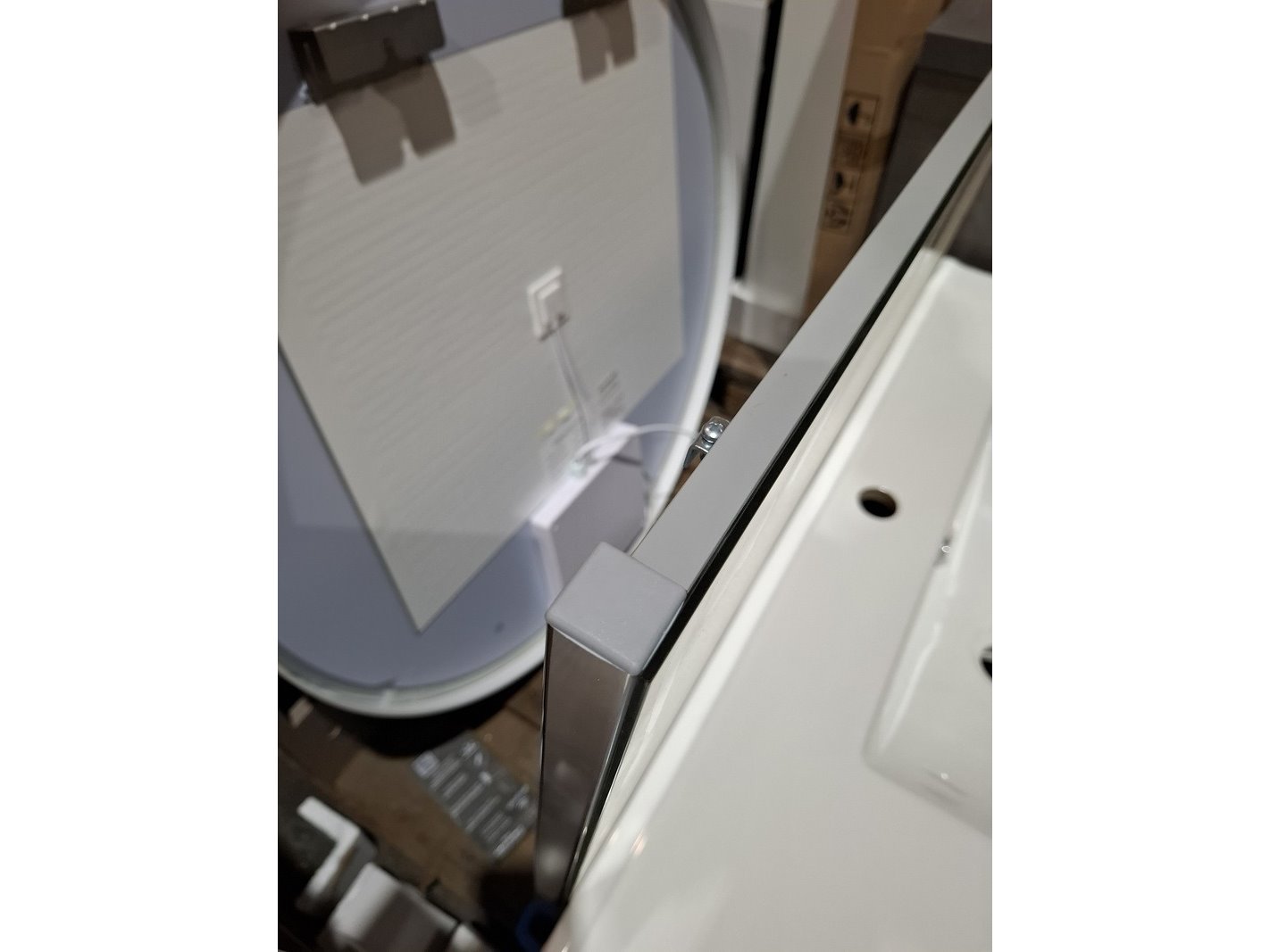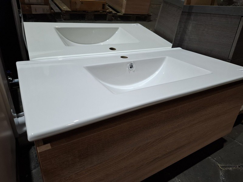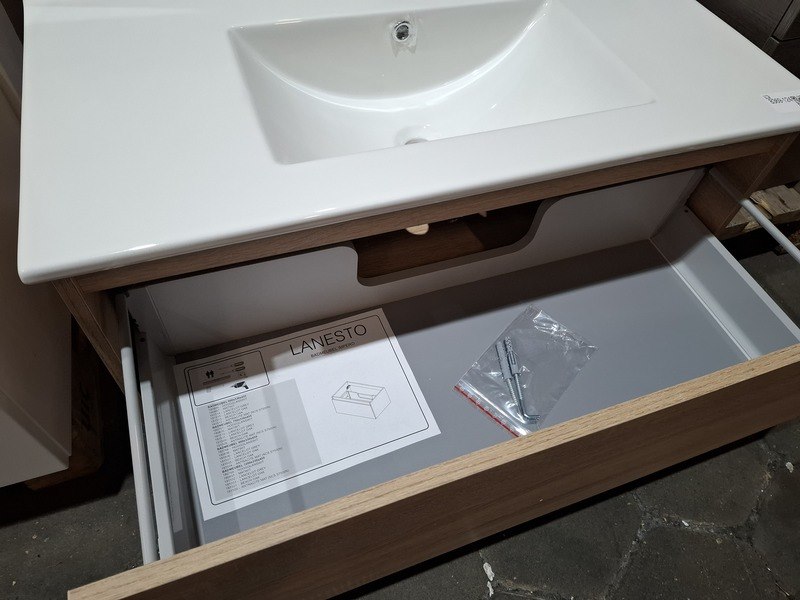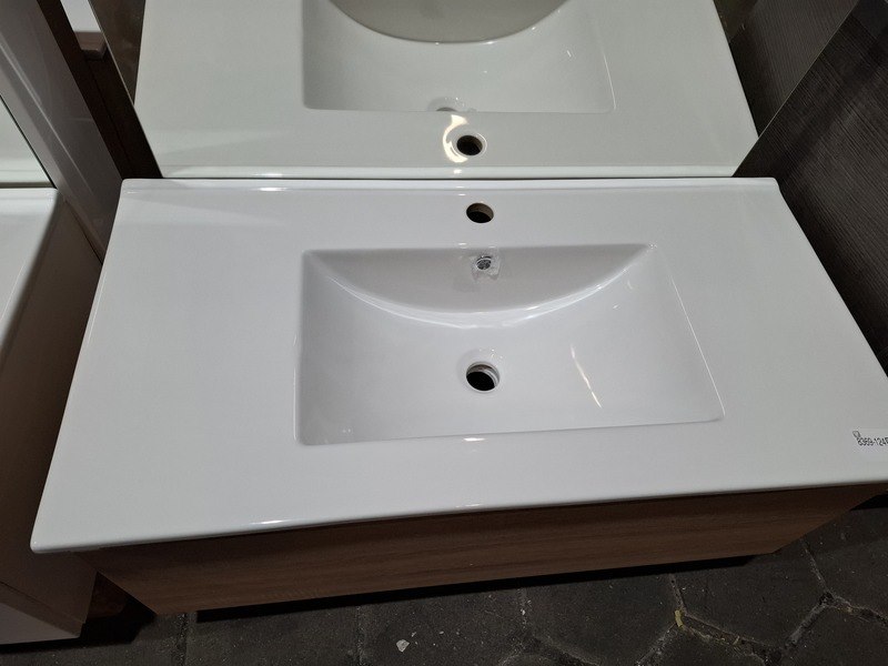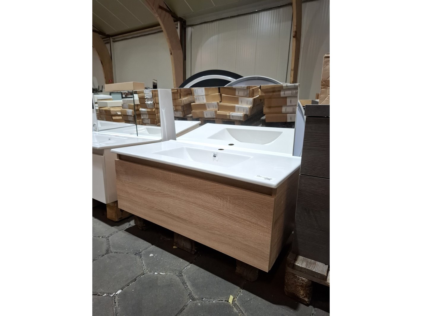 Product: Badmeubel Kleur: beach oak Afmeting: 90x46cm Specificaties: 1 lade met softclose, met Blum geleidesysteem, keramische wastafel, glans wit, spiegel met verwarming