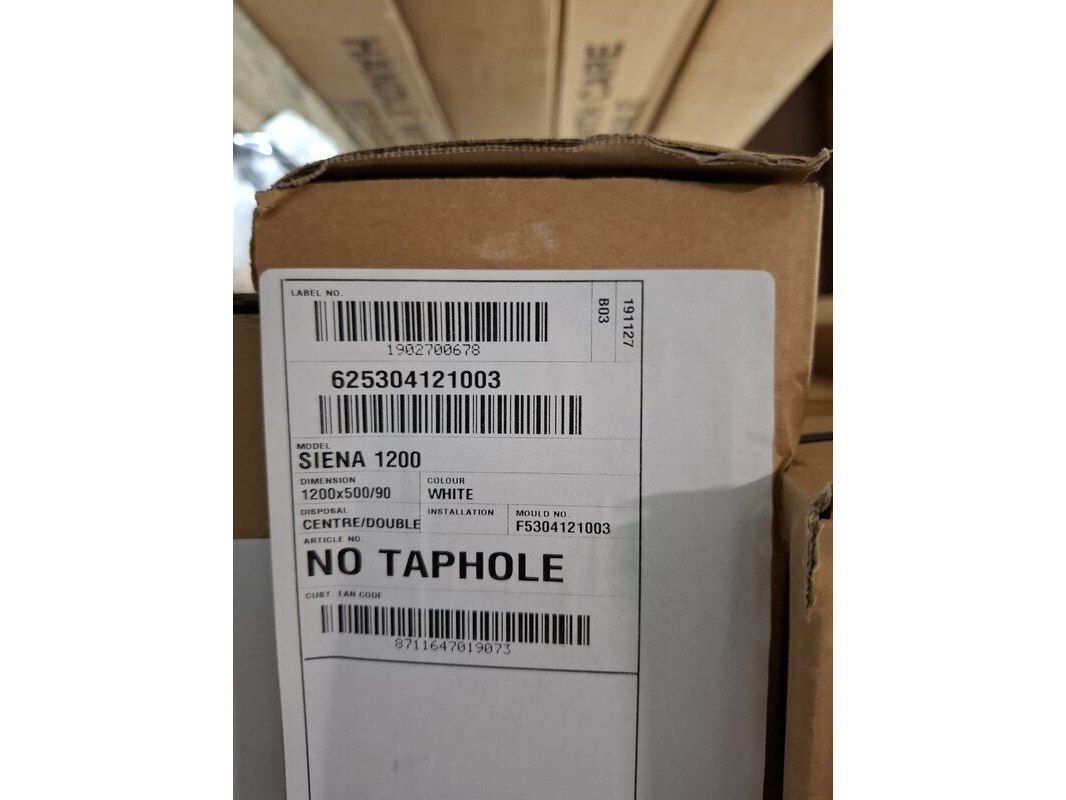 Merk: Sienna 1200 Product: Wastafel Kleur: mat wit Materiaal: polybeton Afmeting: 120x50cm Specificaties: met verdekte afvoer