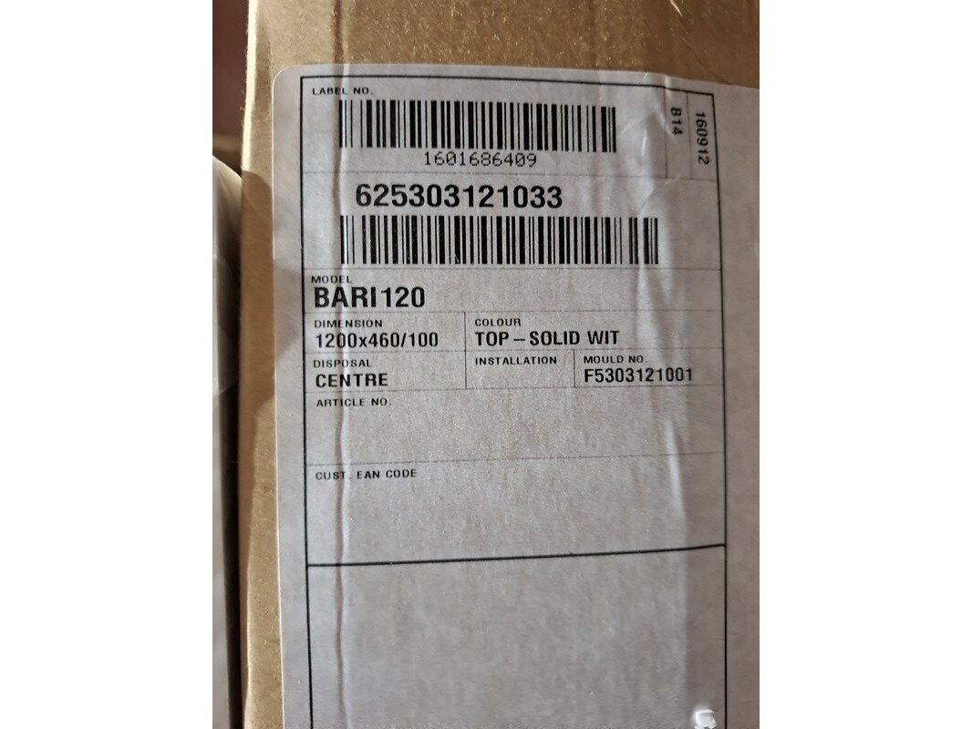 Merk: Bari 120 Product: Wastafel Kleur: mat wit Materiaal: polybeton Afmeting: 120x46cm Specificaties: afvoer midden