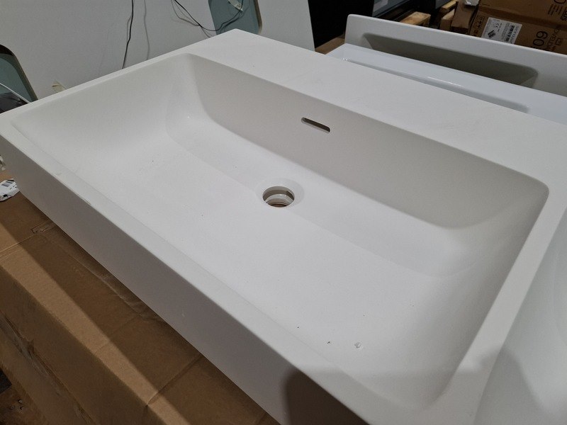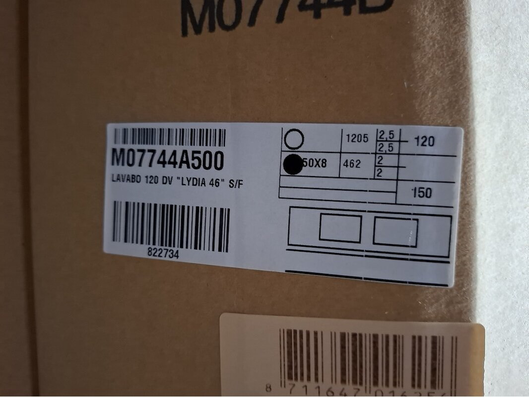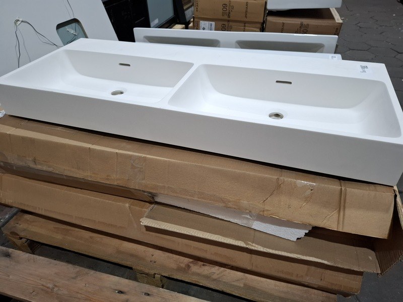 Product: Wastafel Kleur: mat wit Materiaal: polybeton Afmeting: 120x46x11cm Specificaties: 2 bakken