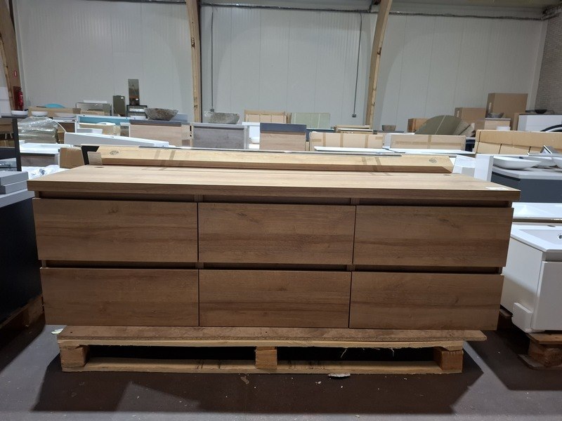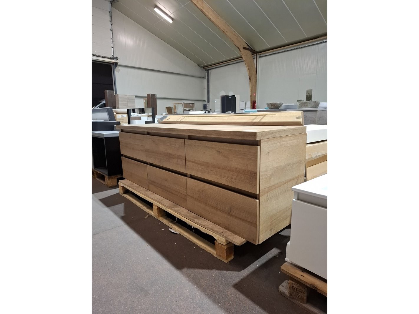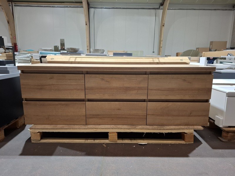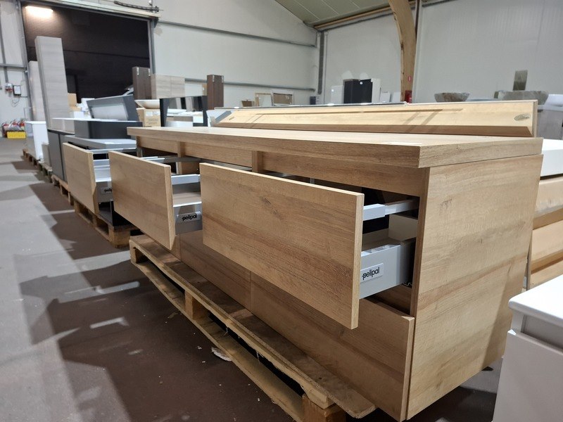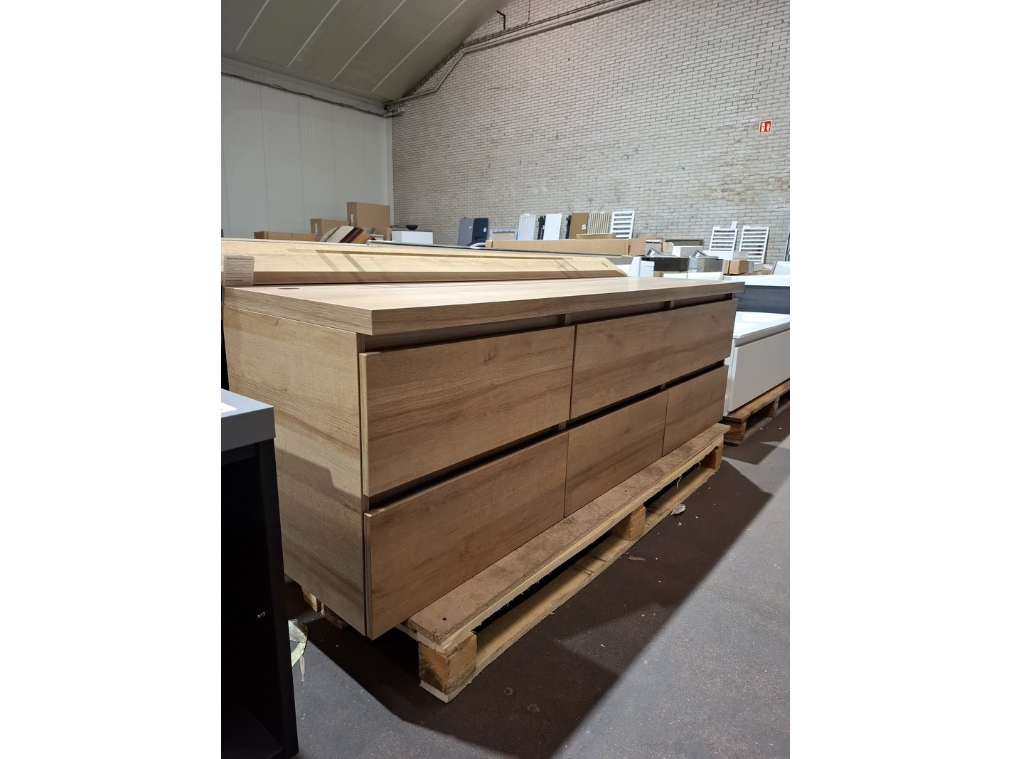 Merk: Pelipal Product: Badmeubel Kleur: natuur eiken Afmeting: 180x50cm Specificaties: 6 lades met softclose, topblad natuur eiken, 2x gat voor waskomkraan, spiegel, 180x70cm, met spiegelverlichting
