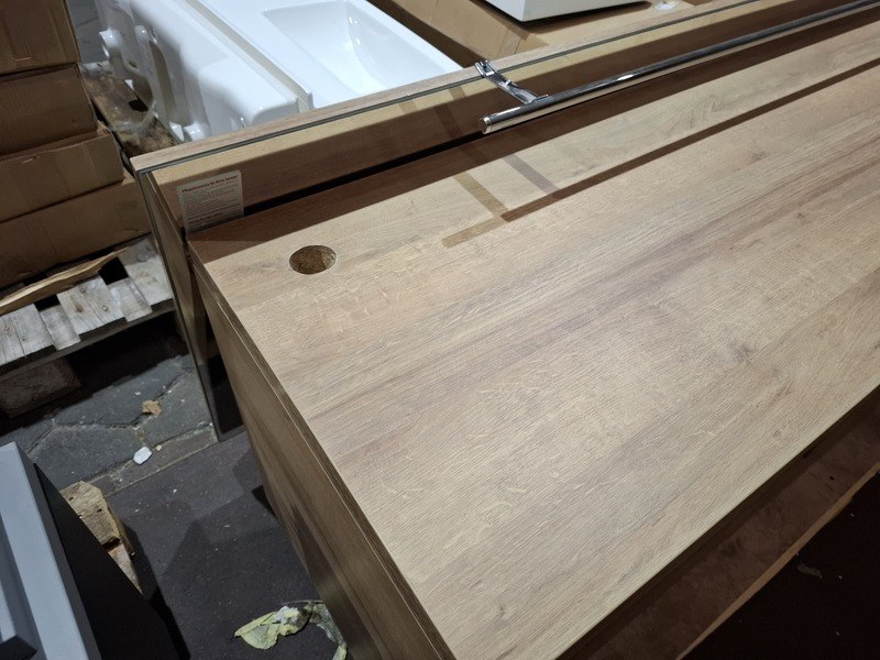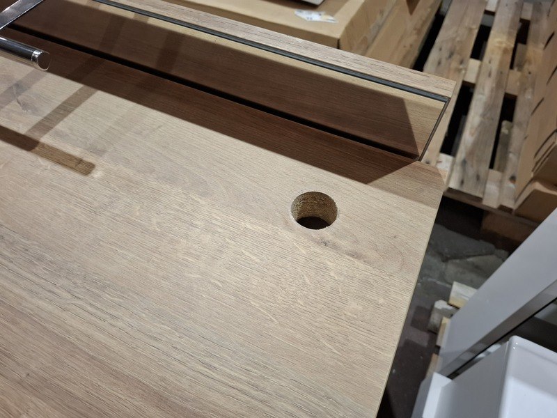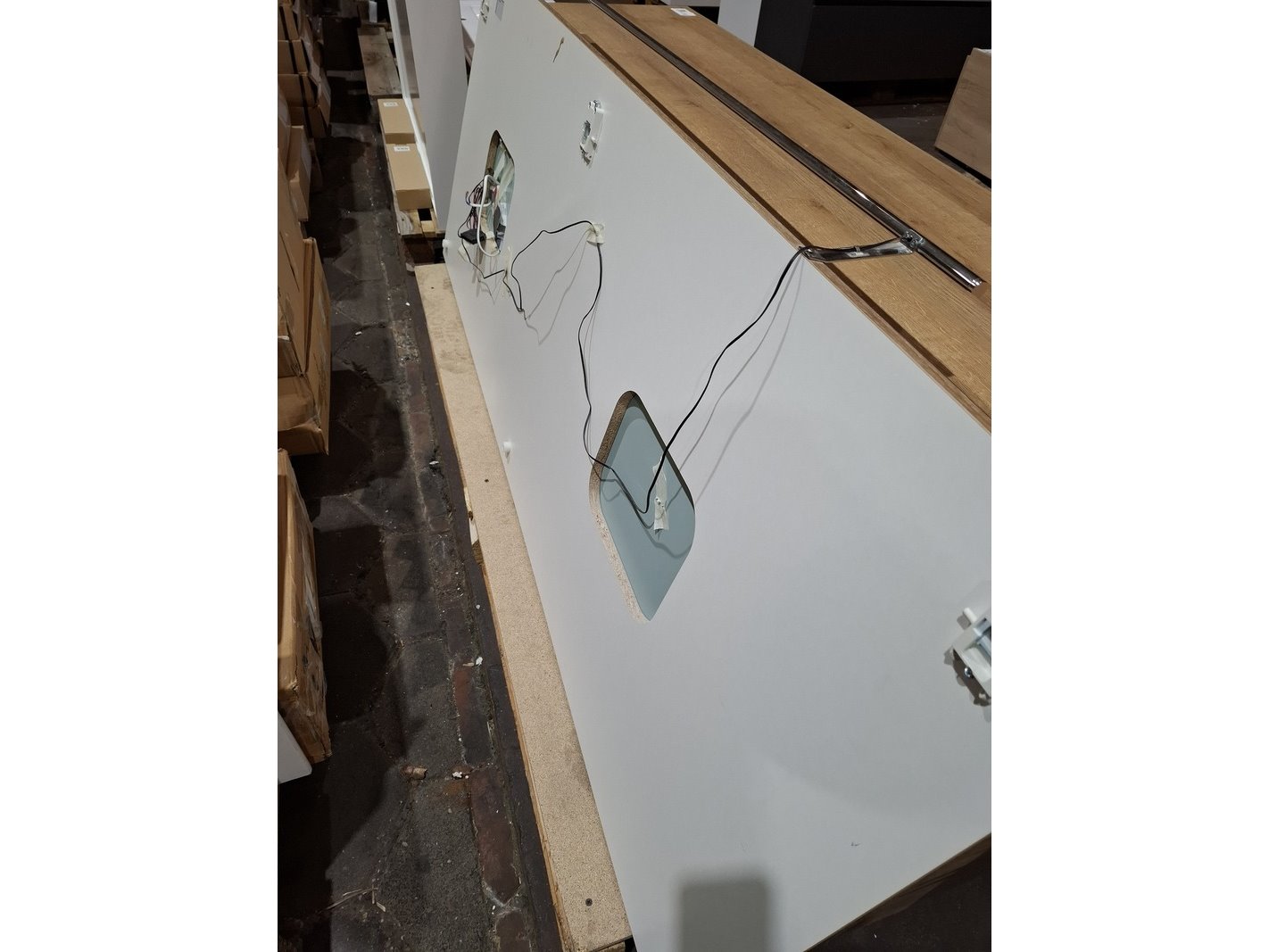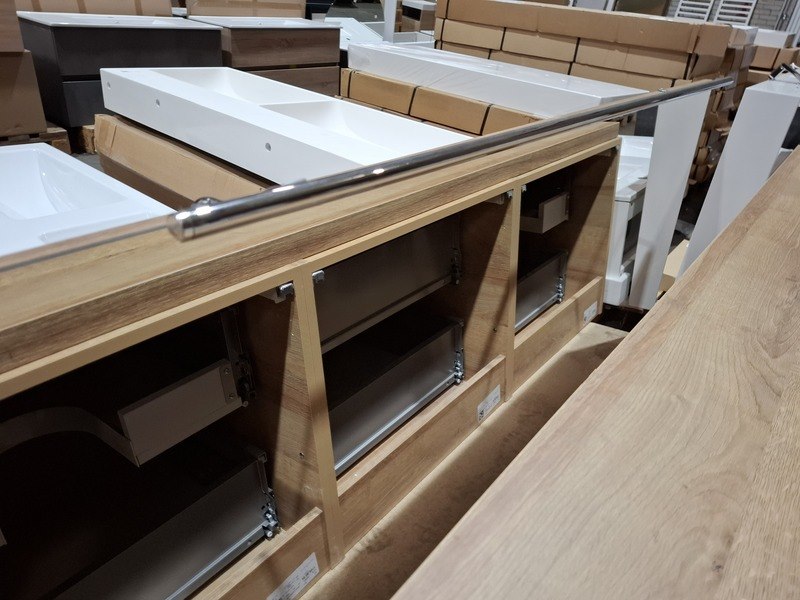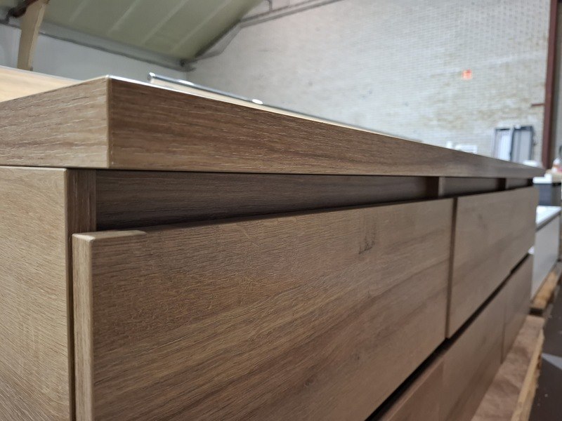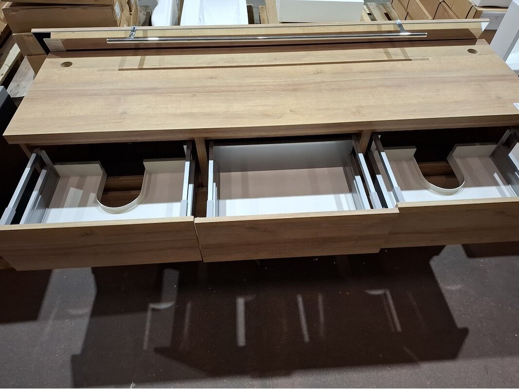 Merk: Pelipal Product: Badmeubel Kleur: natuur eiken Afmeting: 180x50cm Specificaties: 6 lades met softclose, topblad natuur eiken, 2x gat voor waskomkraan, spiegel, 180x70cm, met spiegelverlichting