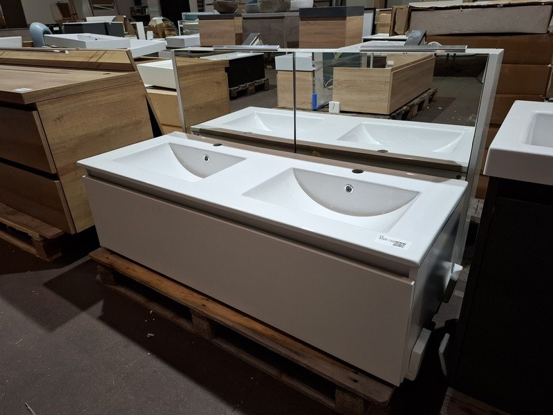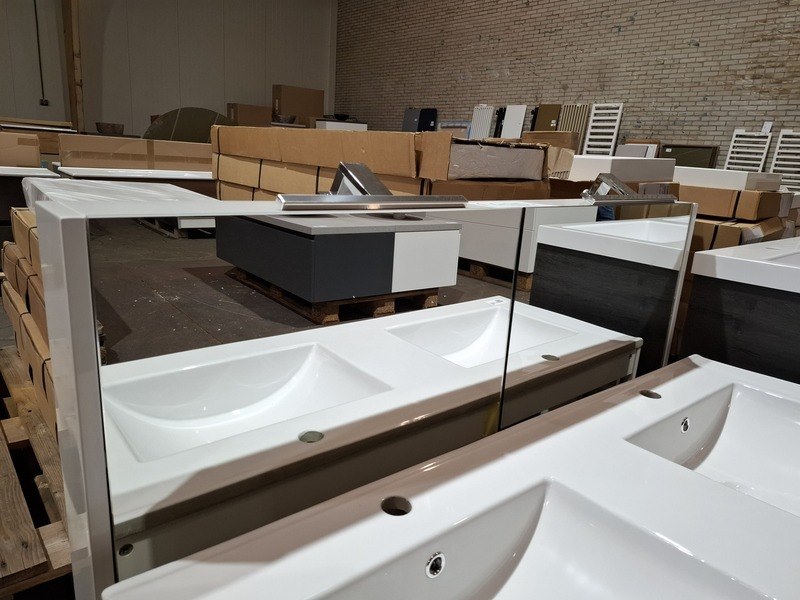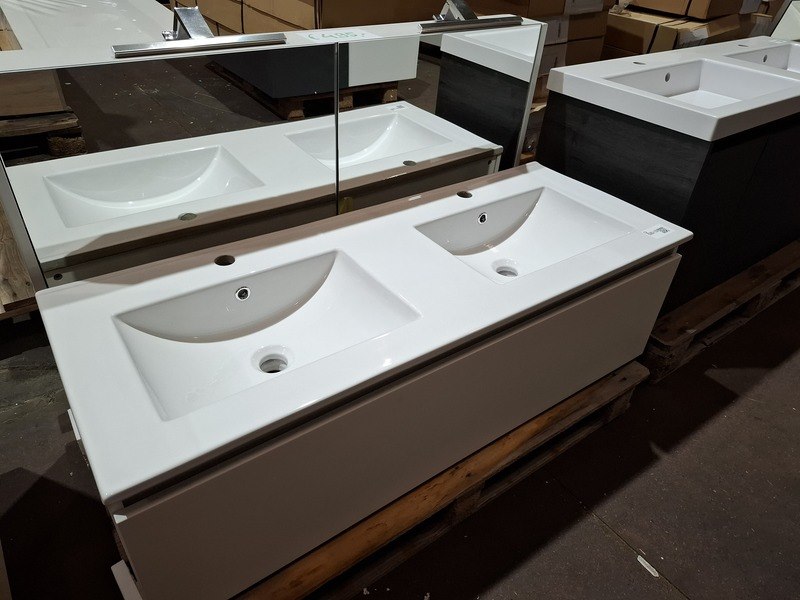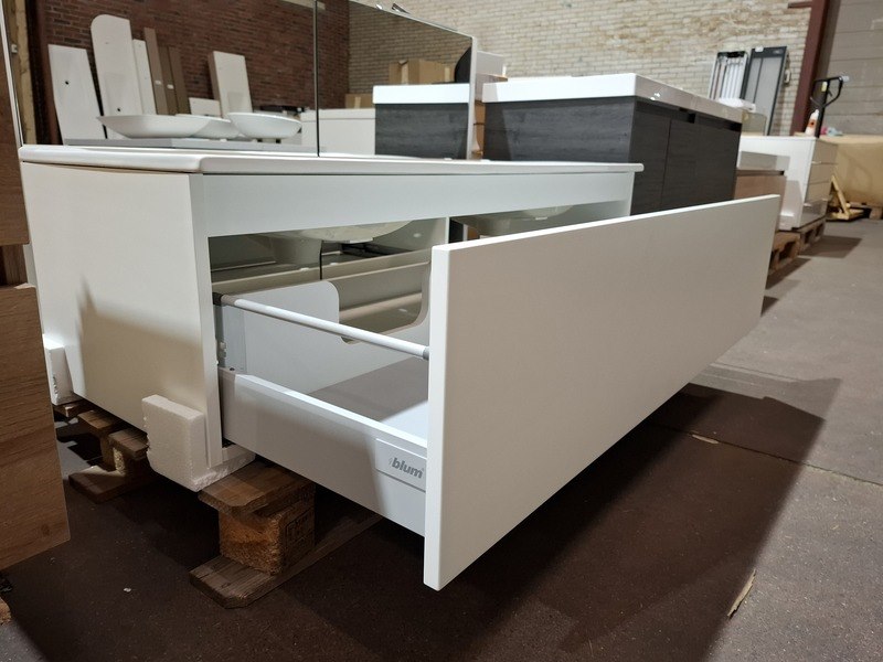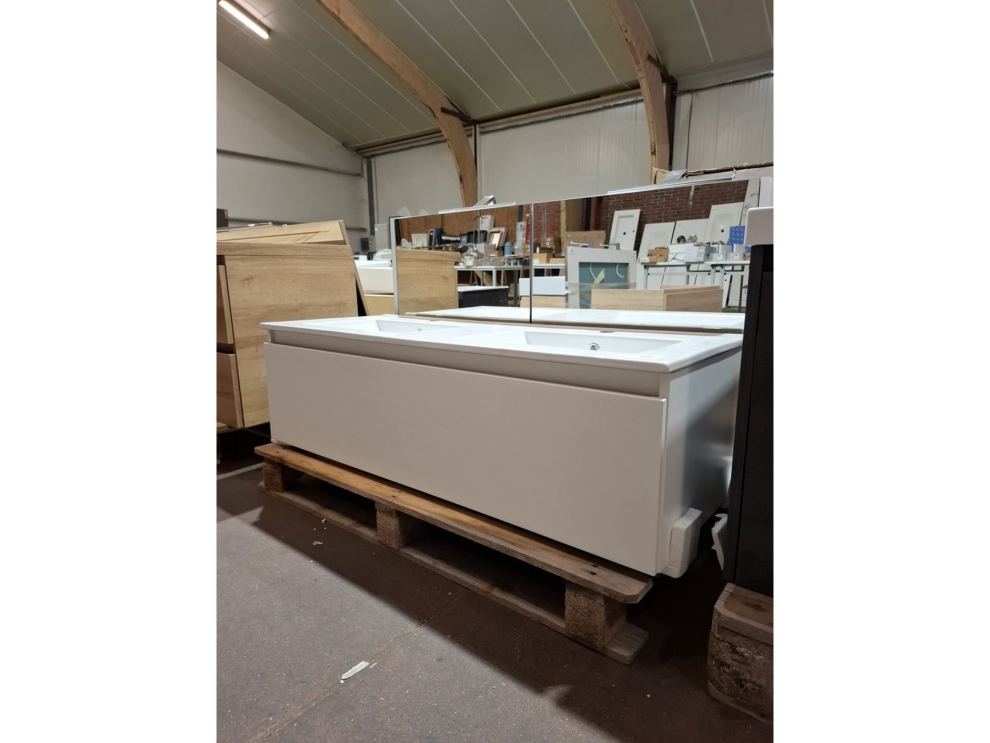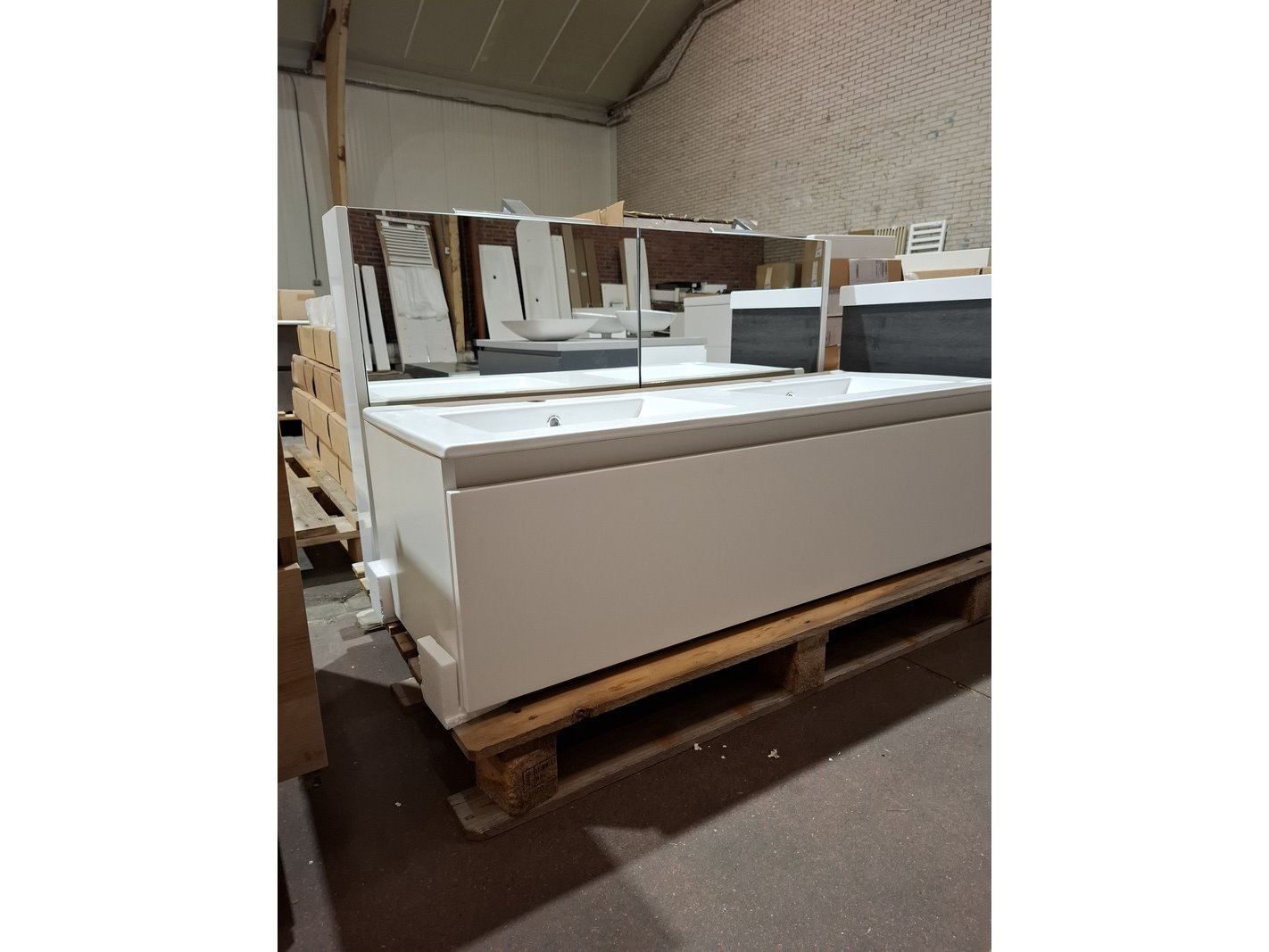 Product: Badmeubel Kleur: wit Afmeting: 120x46cm Specificaties: 1 lade met softclose, Blum geleidesysteem, keramische wastafel, glans wit, 2 bakken, 2 kraangaten, spiegelkast, 120cm, 2 deuren met softclose, dubbel spiegelend, 2x verlichting