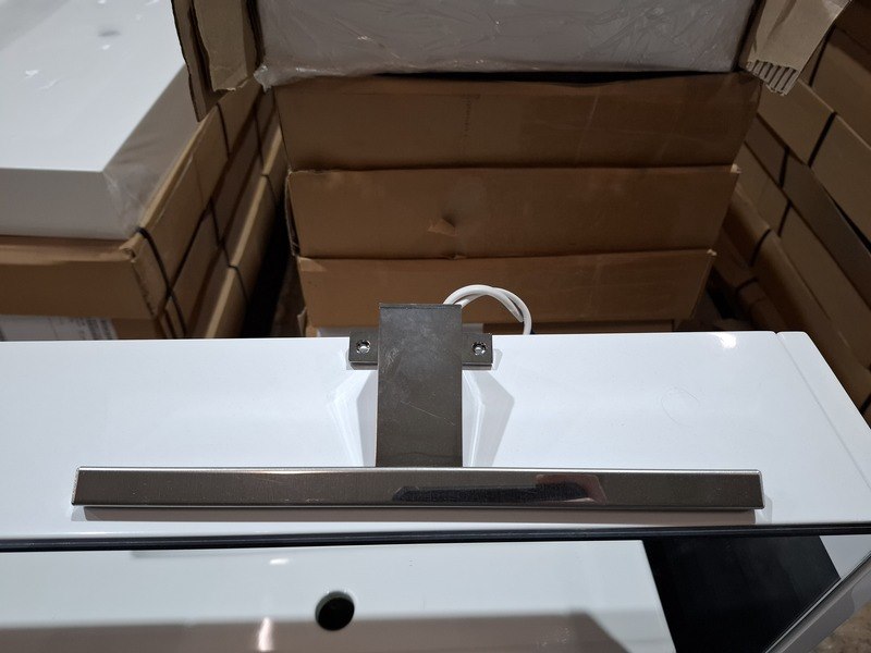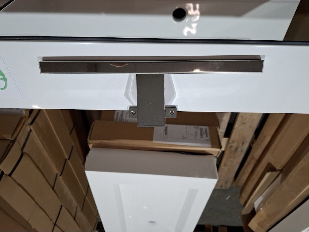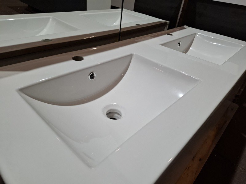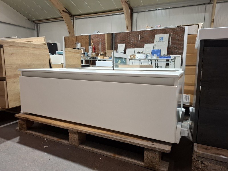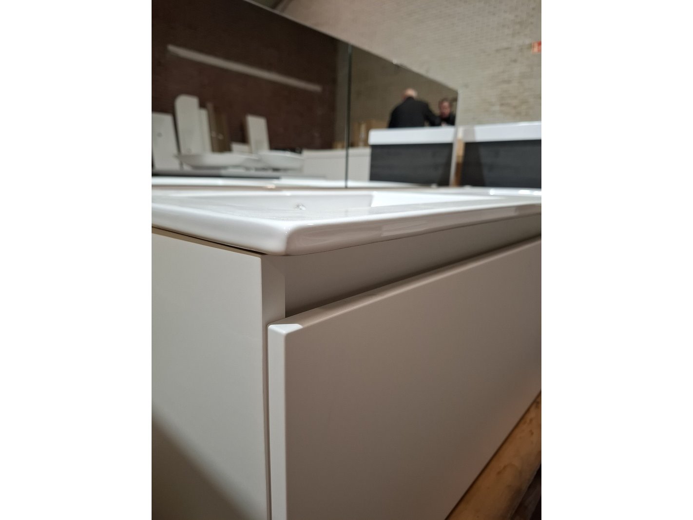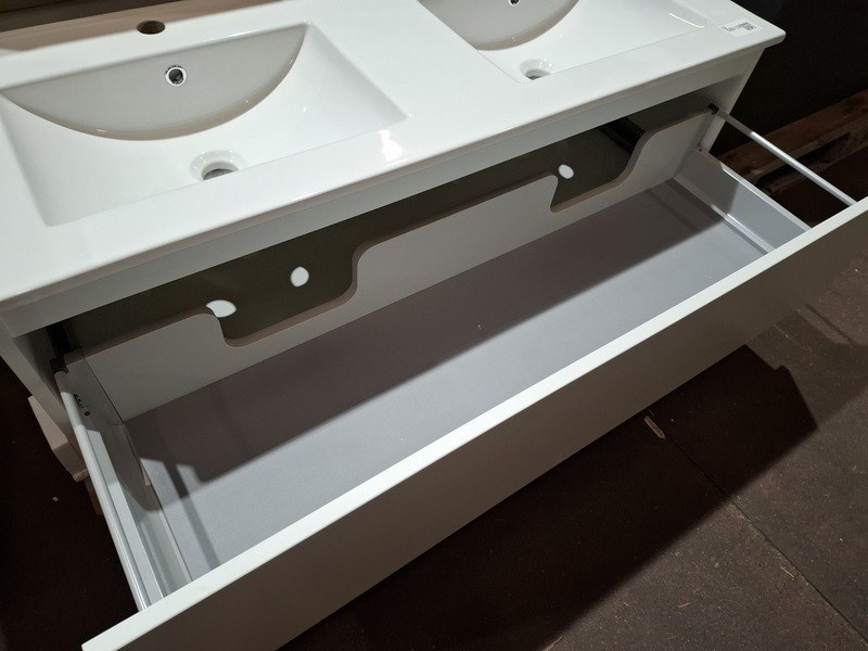 Product: Badmeubel Kleur: wit Afmeting: 120x46cm Specificaties: 1 lade met softclose, Blum geleidesysteem, keramische wastafel, glans wit, 2 bakken, 2 kraangaten, spiegelkast, 120cm, 2 deuren met softclose, dubbel spiegelend, 2x verlichting