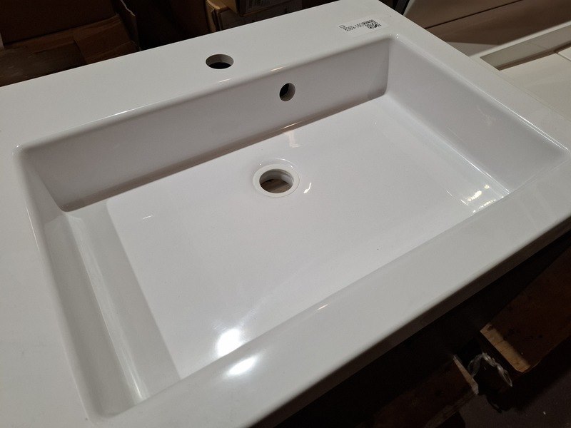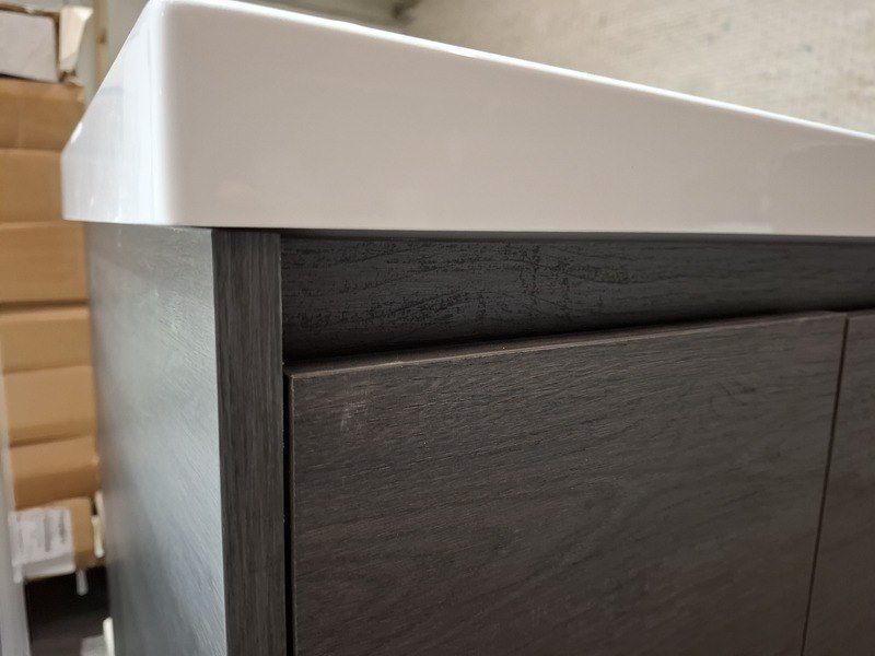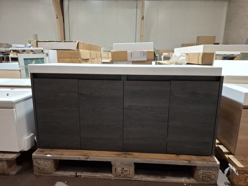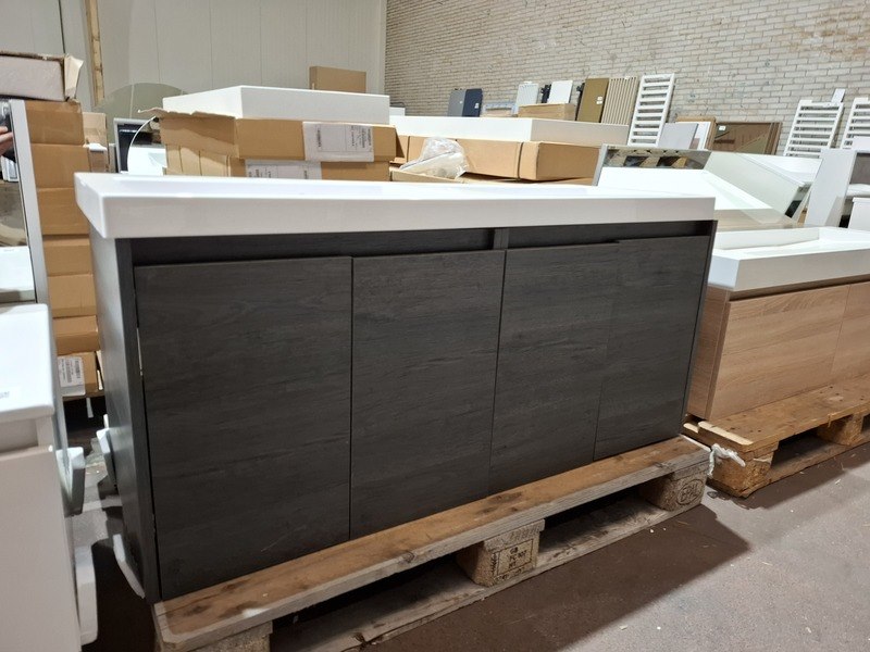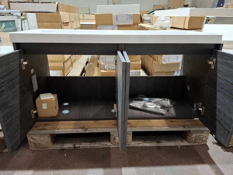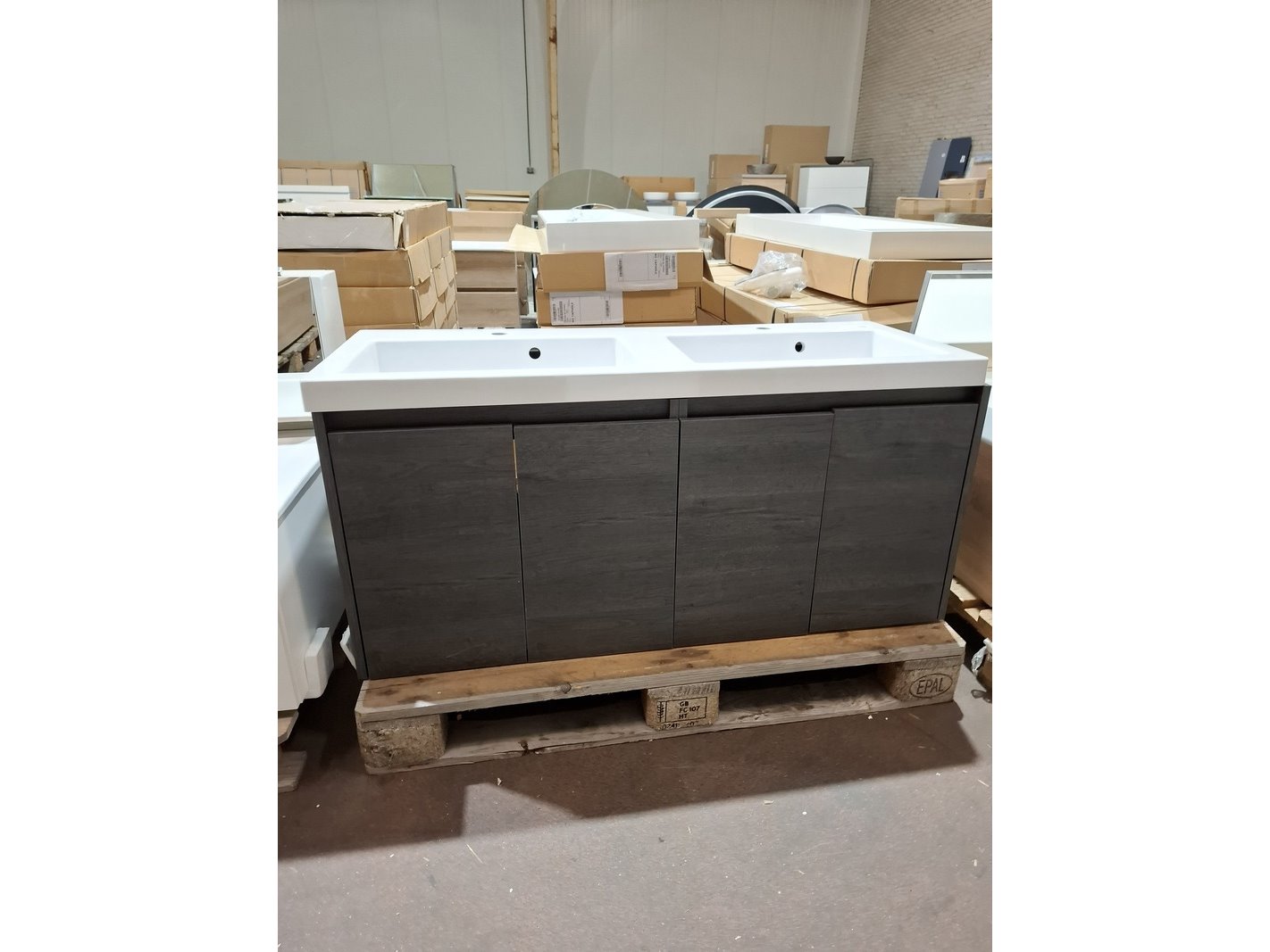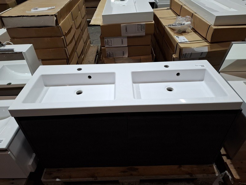 Merk: Riho Product: Badmeubel Kleur: azabache Afmeting: 120x46cm Specificaties: 4 deurtjes met softclose, polybeton wastafel, glans wit, 2 bakken, 2x kraangat