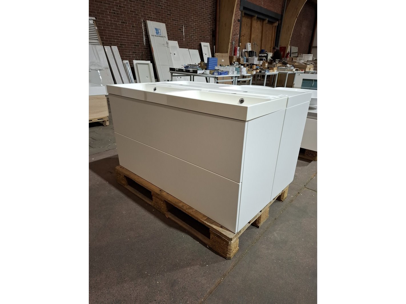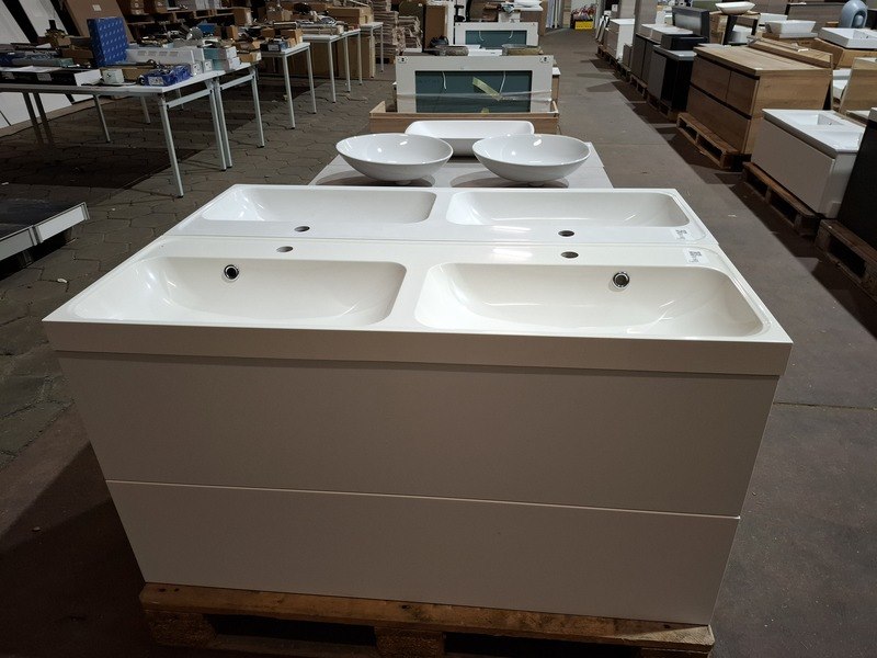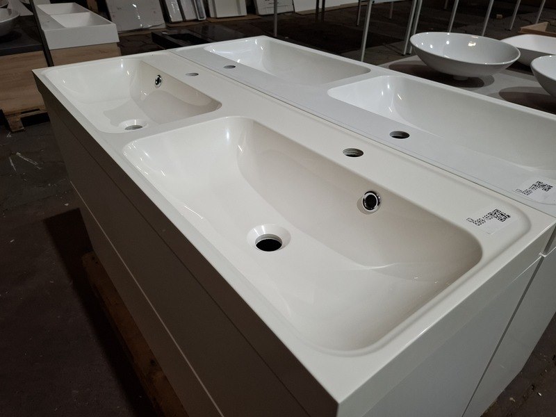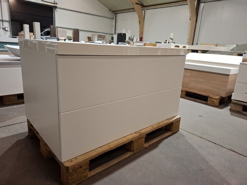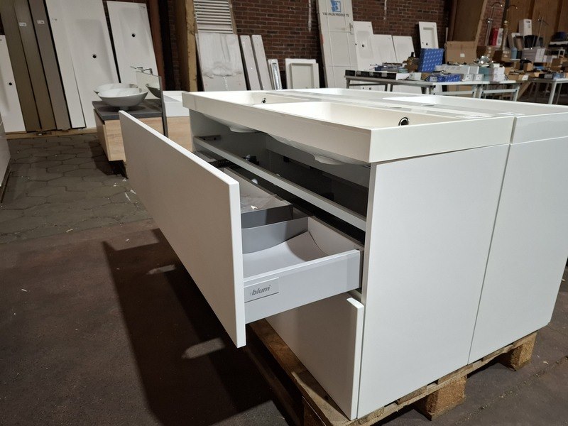 Product: Badmeubel Kleur: wit Afmeting: 120x40cm Specificaties: 2 lades met softclose, met Blum geleidesysteem, polybeton wastafel, glanswit