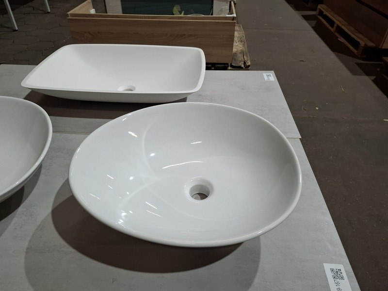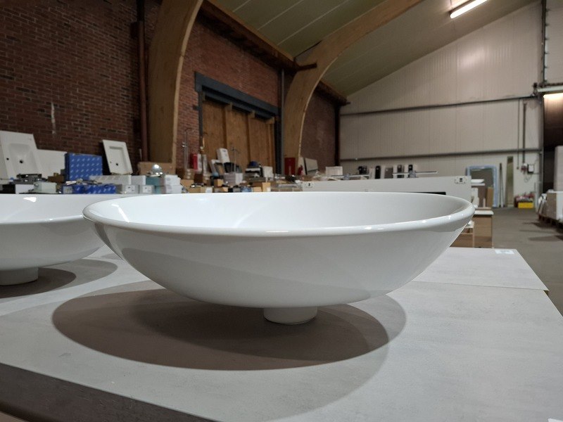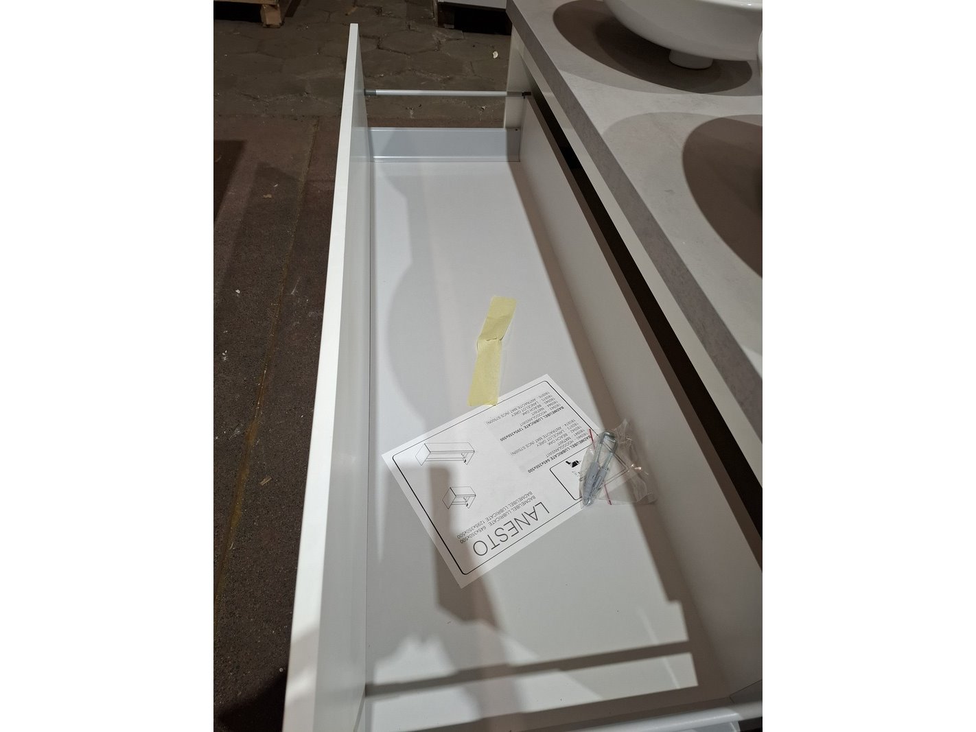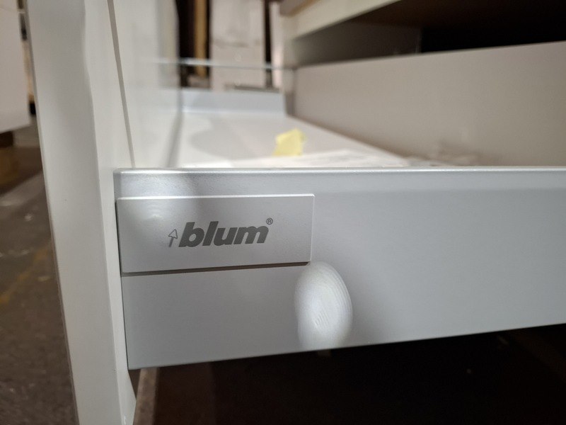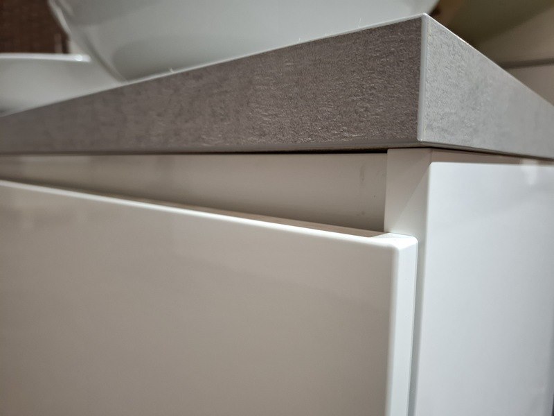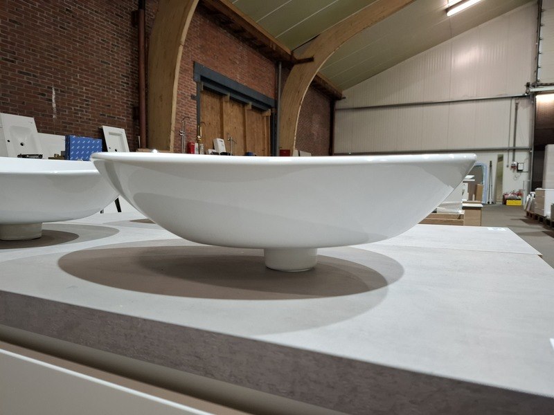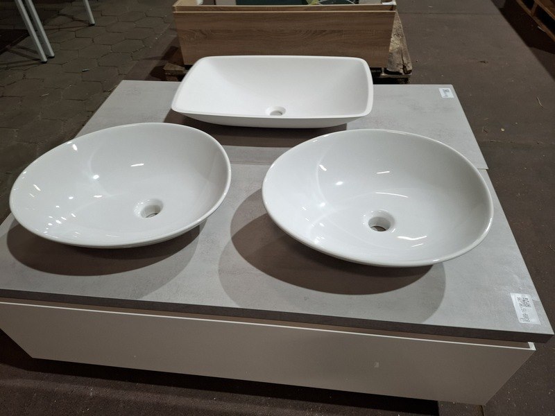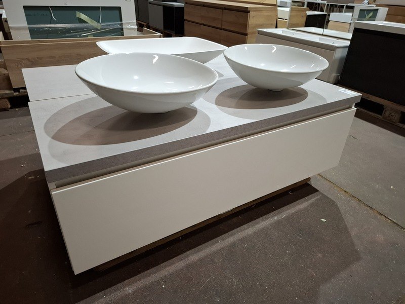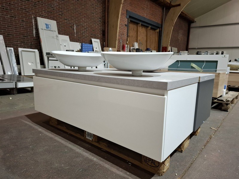 Product: Badmeubel Kleur: mat wit Afmeting: 130x50cm Specificaties: 1 lade met softclose, Blum geleidesysteem, topblad, betongrijs, 2x waskom, keramisch, glans wit
