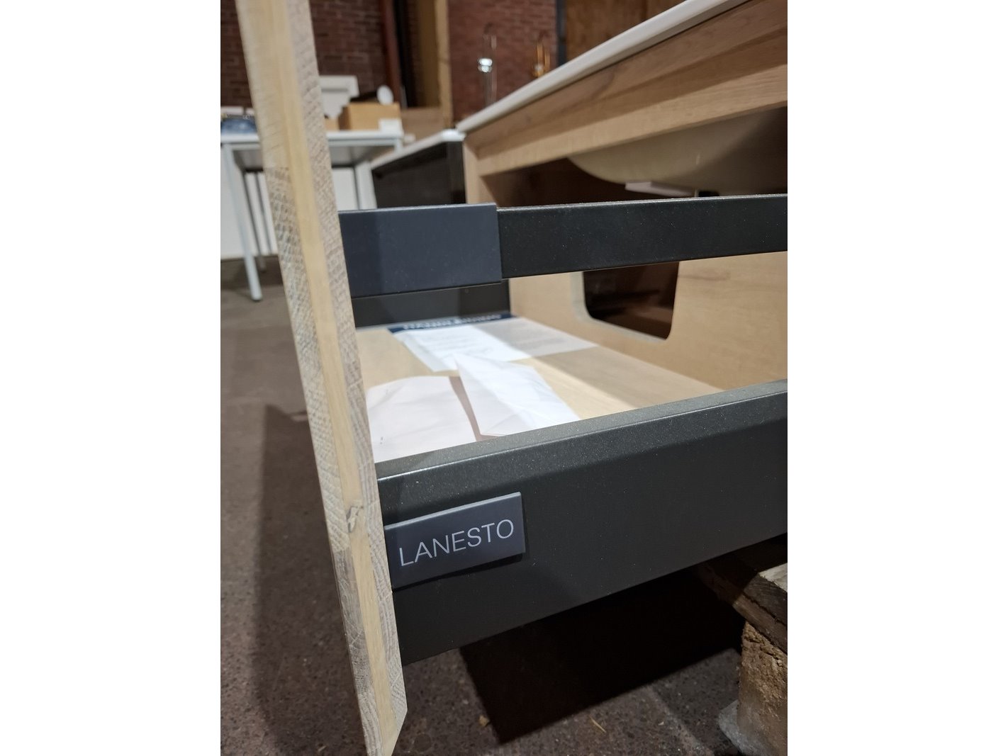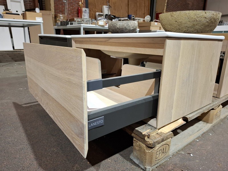 Product: Badmeubel Kleur: white wash Materiaal: massief eiken Afmeting: 75x46cm Specificaties: 1 lade, softclose, keramische wastafel, glans wit