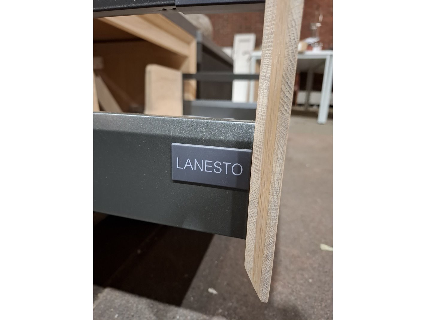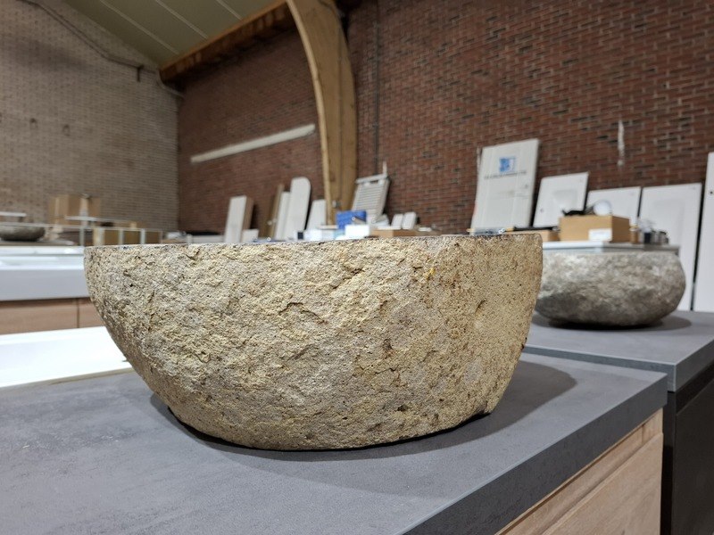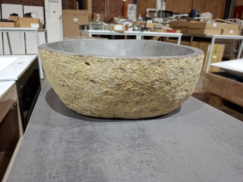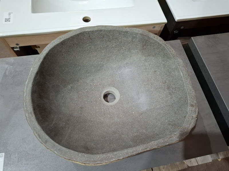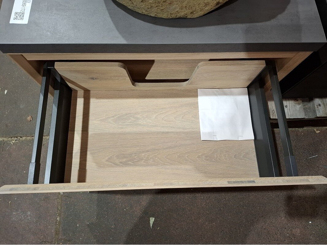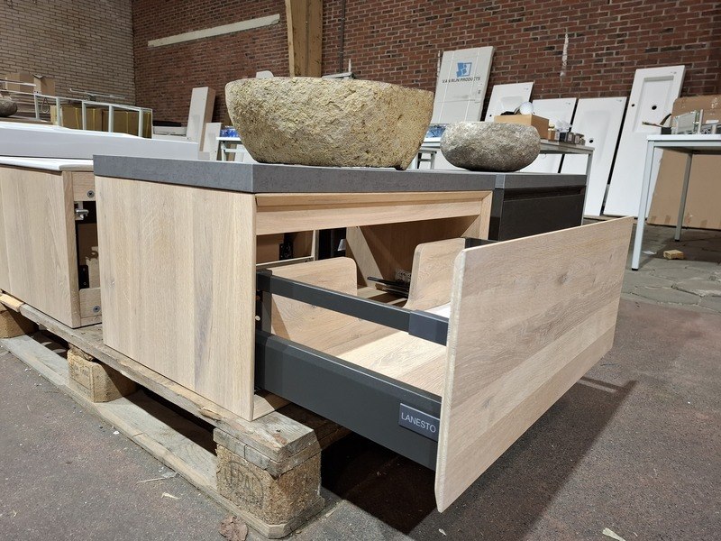 Product: Badmeubel Kleur: white wash Materiaal: massief eiken Afmeting: 75x46cm Specificaties: 1 lade, softclose, topblad, antraciet, waskom Riverstone