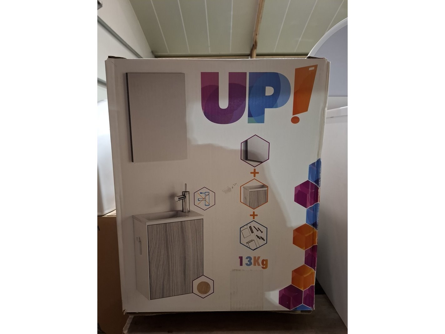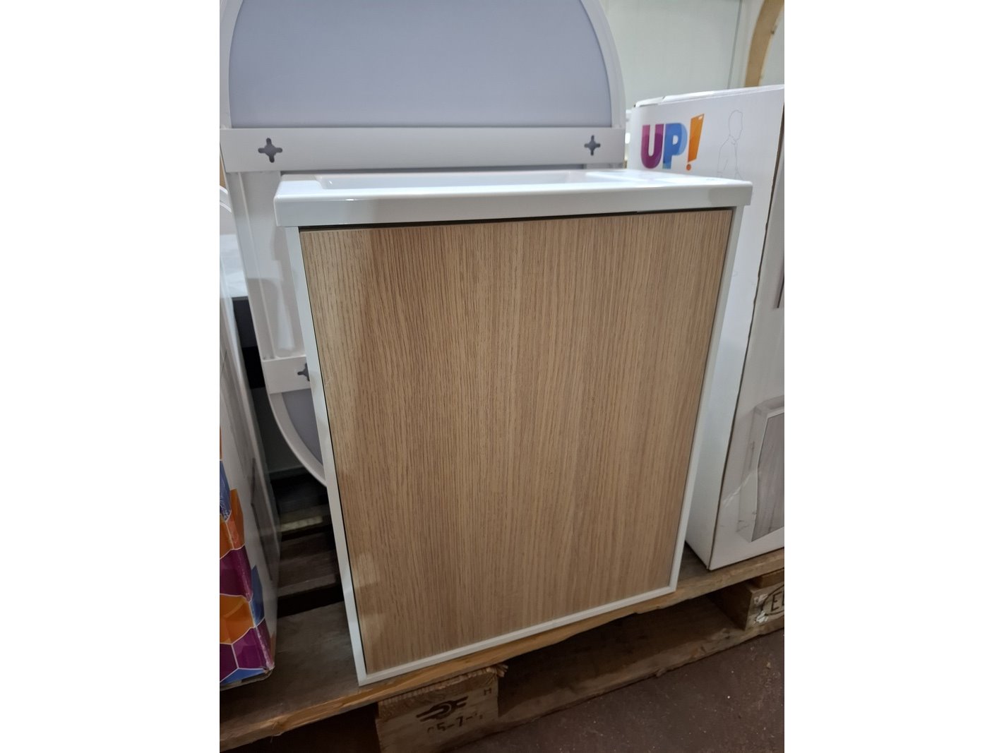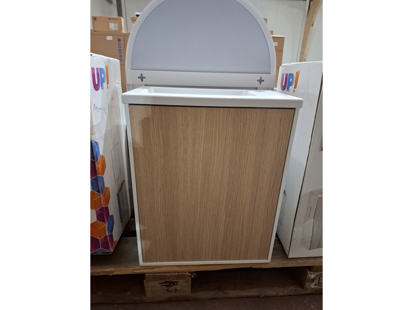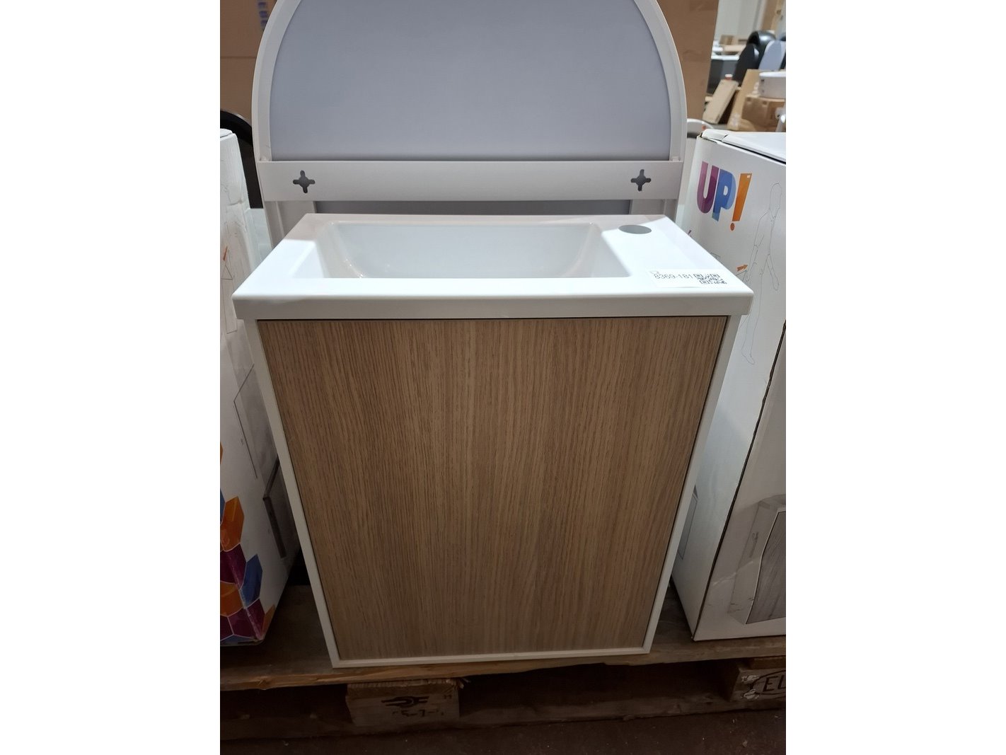Product: Fonteinmeubel Kleur: wit/eiken Afmeting: 40x22x50cm Specificaties: push open deurtje, fontein, polybeton, spiegel