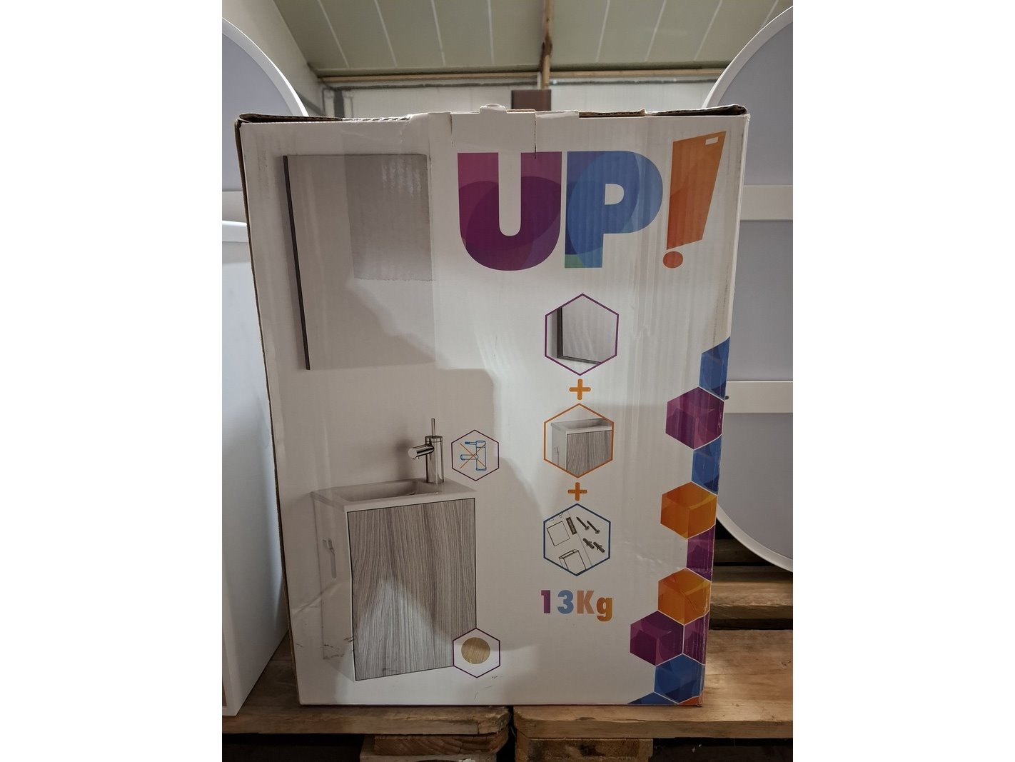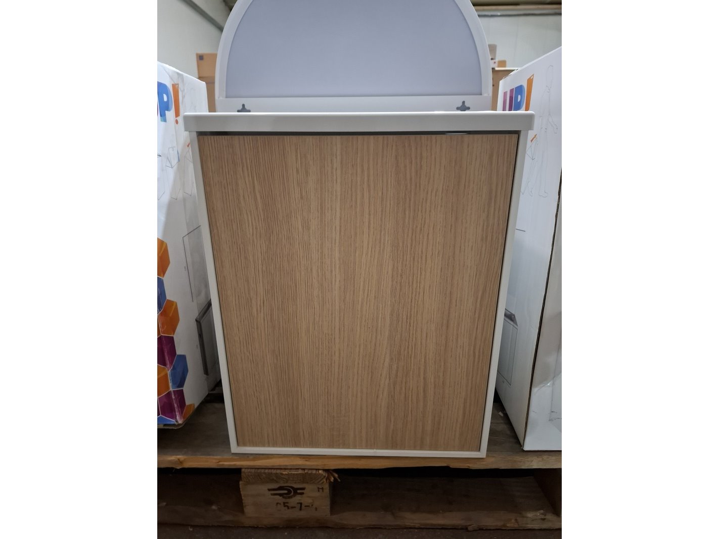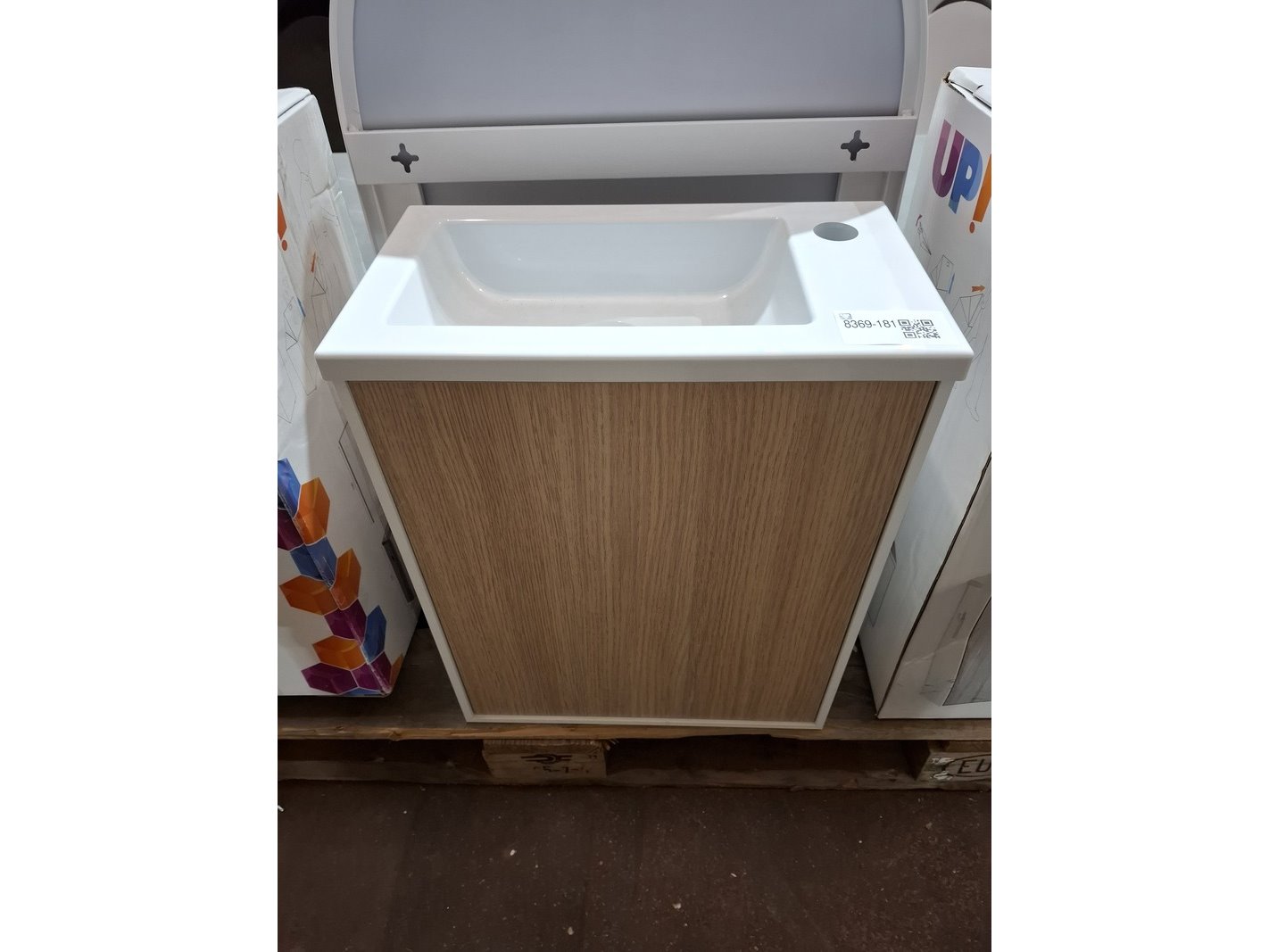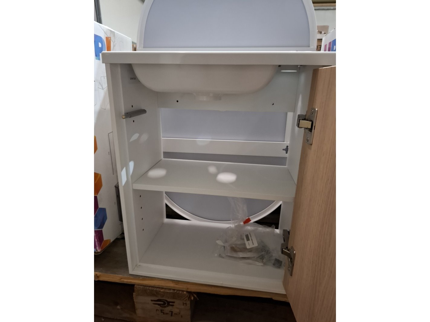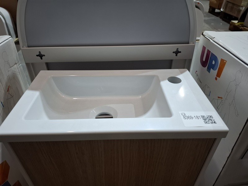 Product: Fonteinmeubel Kleur: wit/eiken Afmeting: 40x22x50cm Specificaties: push open deurtje, fontein, polybeton, spiegel