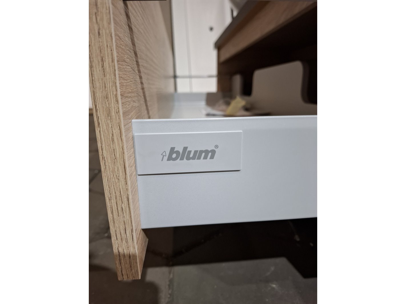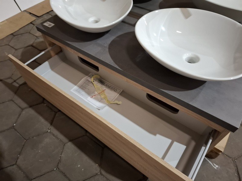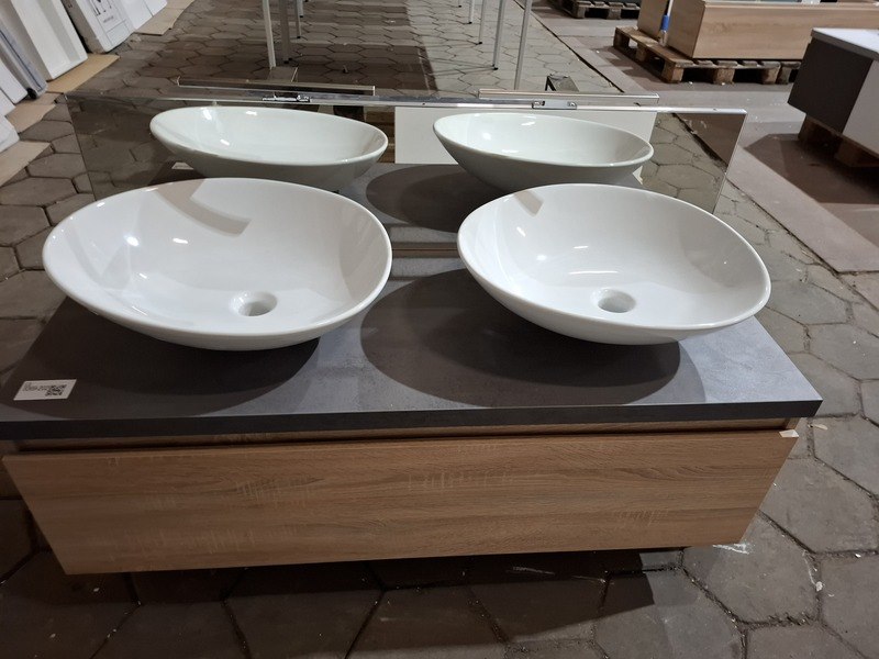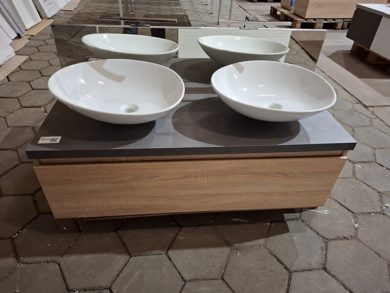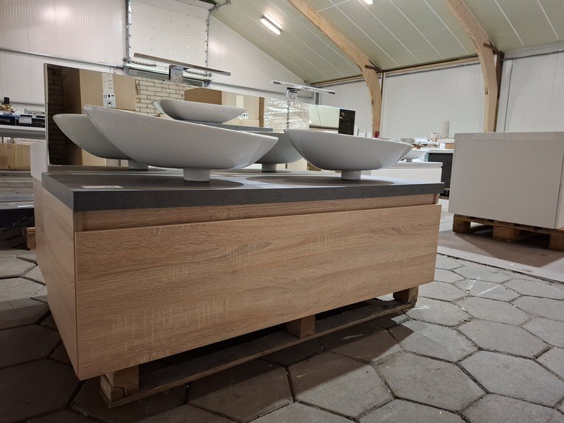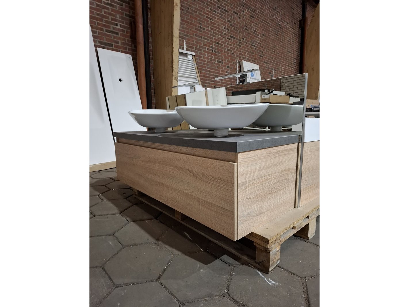 Product: Badmeubel Kleur: beach oak Afmeting: 120x46cm Specificaties: 1 lade met softclose, Blum geleidesysteem, topblad, antraciet, 2x waskom, keramisch, glans wit incl. spiegel 120x70 met 2 x verlichting
