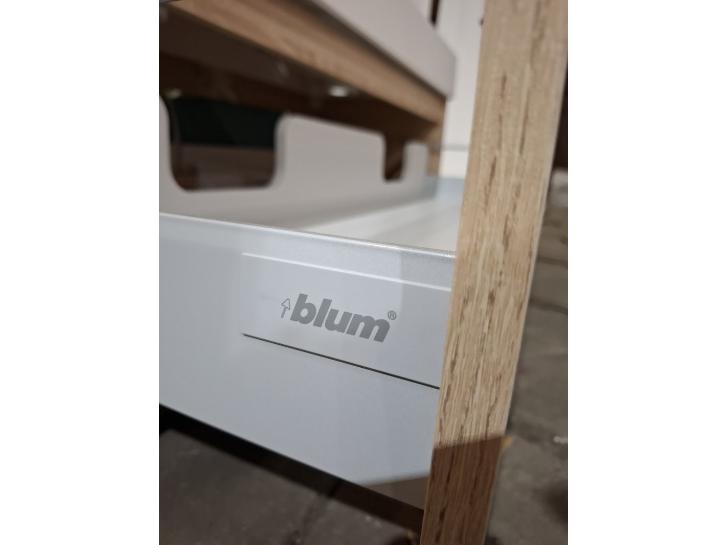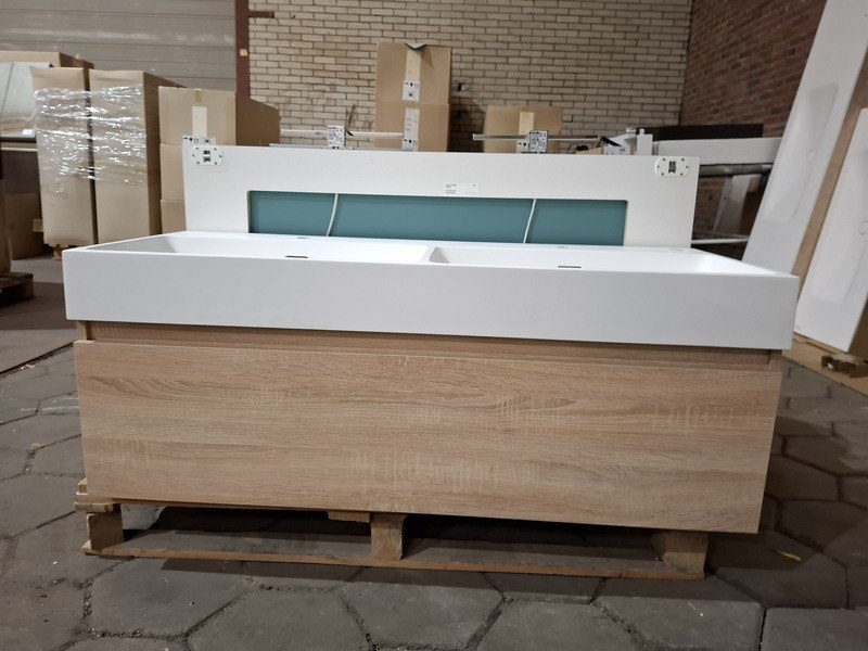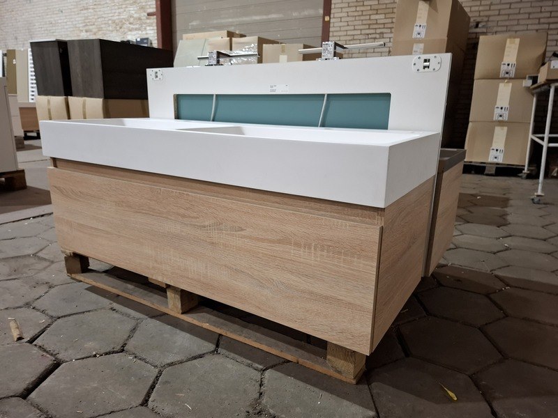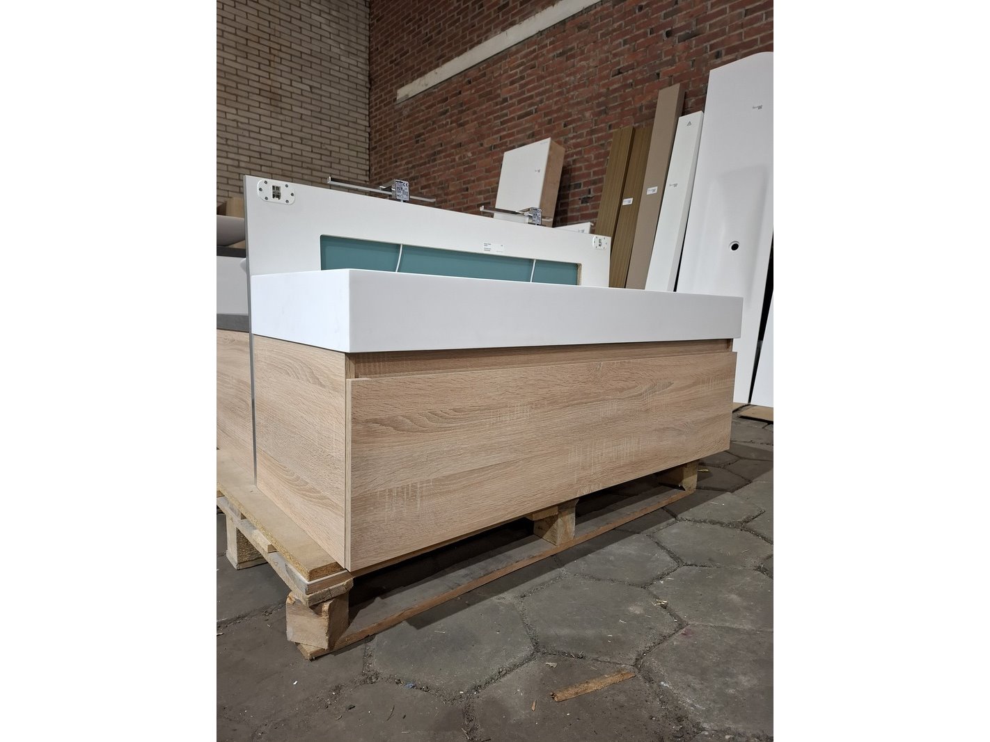 Product: Badmeubel Kleur: beach oak Afmeting: 120x46cm Specificaties: 1 lade met softclose, Blum geleidesysteem, polybeton wastafel, mat wit, 2 bakken, 2 kraangaten